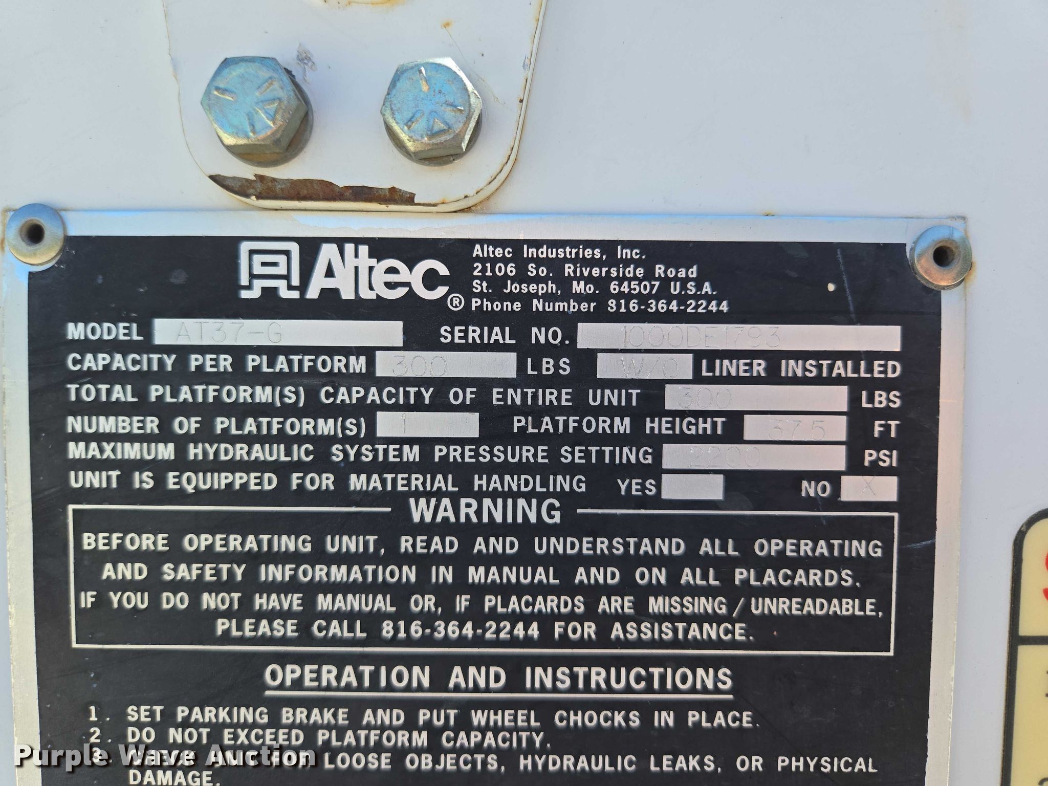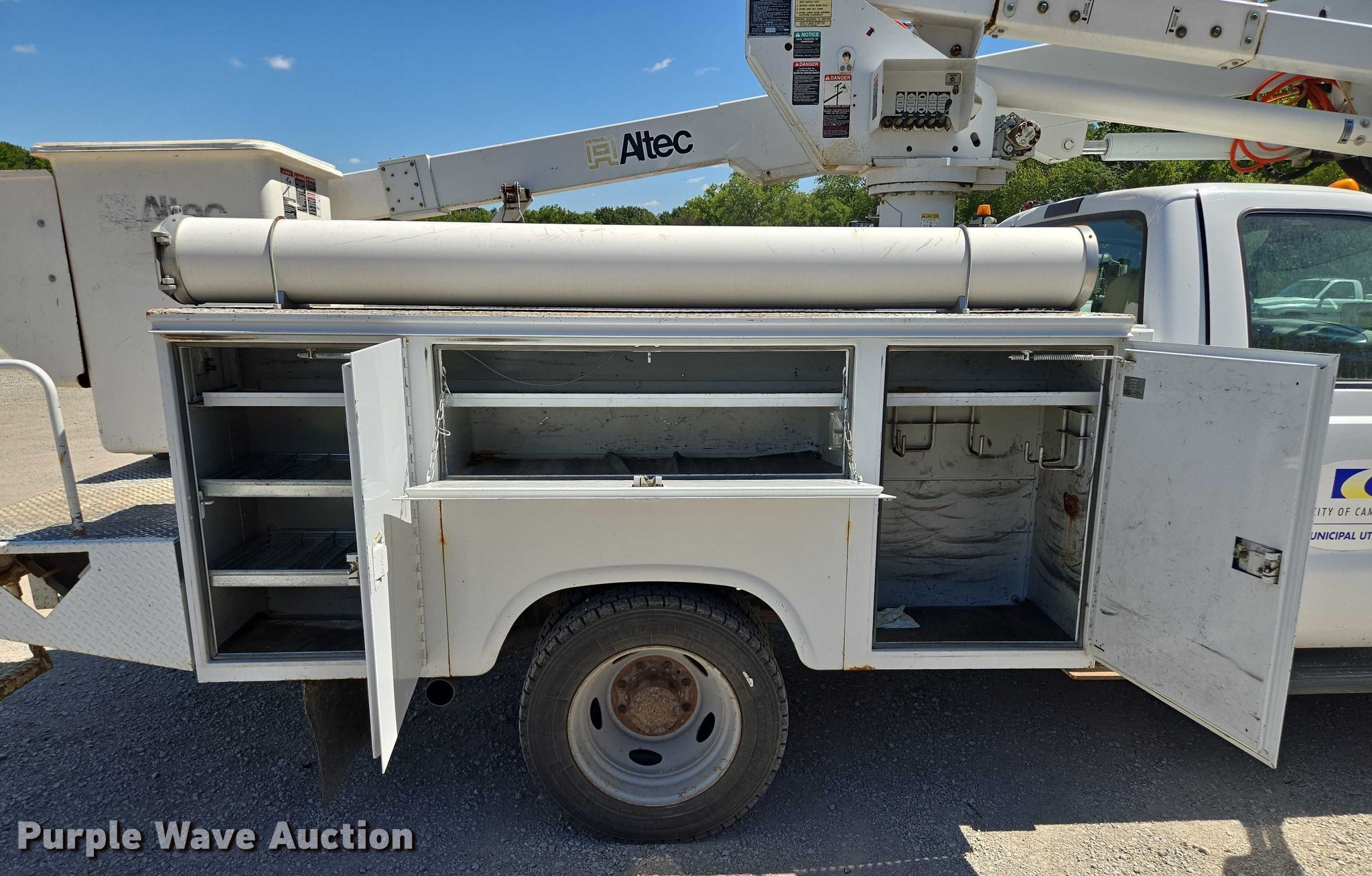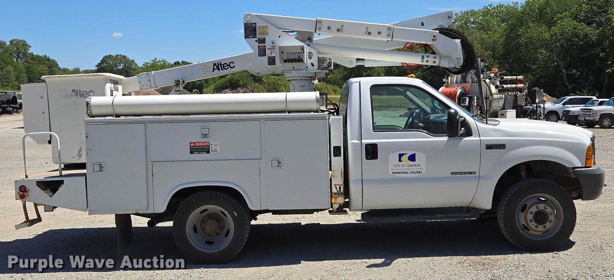 2001 Ford F550 Super Duty bucket truck. Miles: 63,571 on odometer, VIN: 1FDAF57F01EA36071. Engine Displacement: 7.3L, Cylinders: 8, Fuel type: Diesel. Transmission Automatic. Chassis Four wheel drive, Axles: Single, Suspension: Spring, Brakes: Hydraulic, PTO. Interior AC, Heat. Features Bed Utility bed, Knapheide 6101D54J, Serial: 879641, Length: 11', Width: 95", Boom Altec AT37-G, Serial: 1000DE1793, Mast height: 37.5', Maximum lift capacity: 300 lbs, Boom type: Articulating, Insulated, Man basket, Boom controls Ground, Platform/ basket.. Tires Size: 225/70R19.5. Notes Windshield chipped or cracked. Missouri title. Title distribution may be delayed up to 14 days from verification of funds. City of Cameron, MO. Cameron, MO 64429