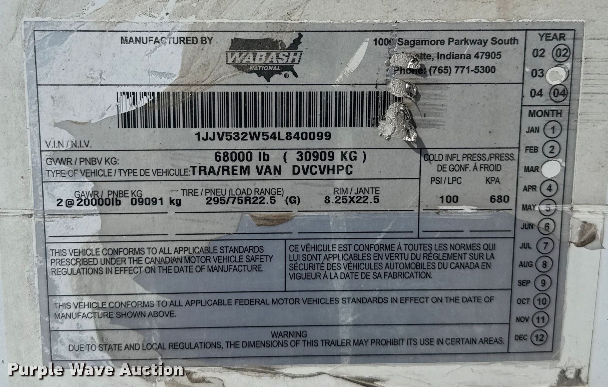 Purple Wave is selling a used Dry Van Trailer in Missouri. This item is a 2004 Wabash DVCVHPC dry van trailer with the following: VIN: 1JJV532W54L840099, Unit #: RA0099