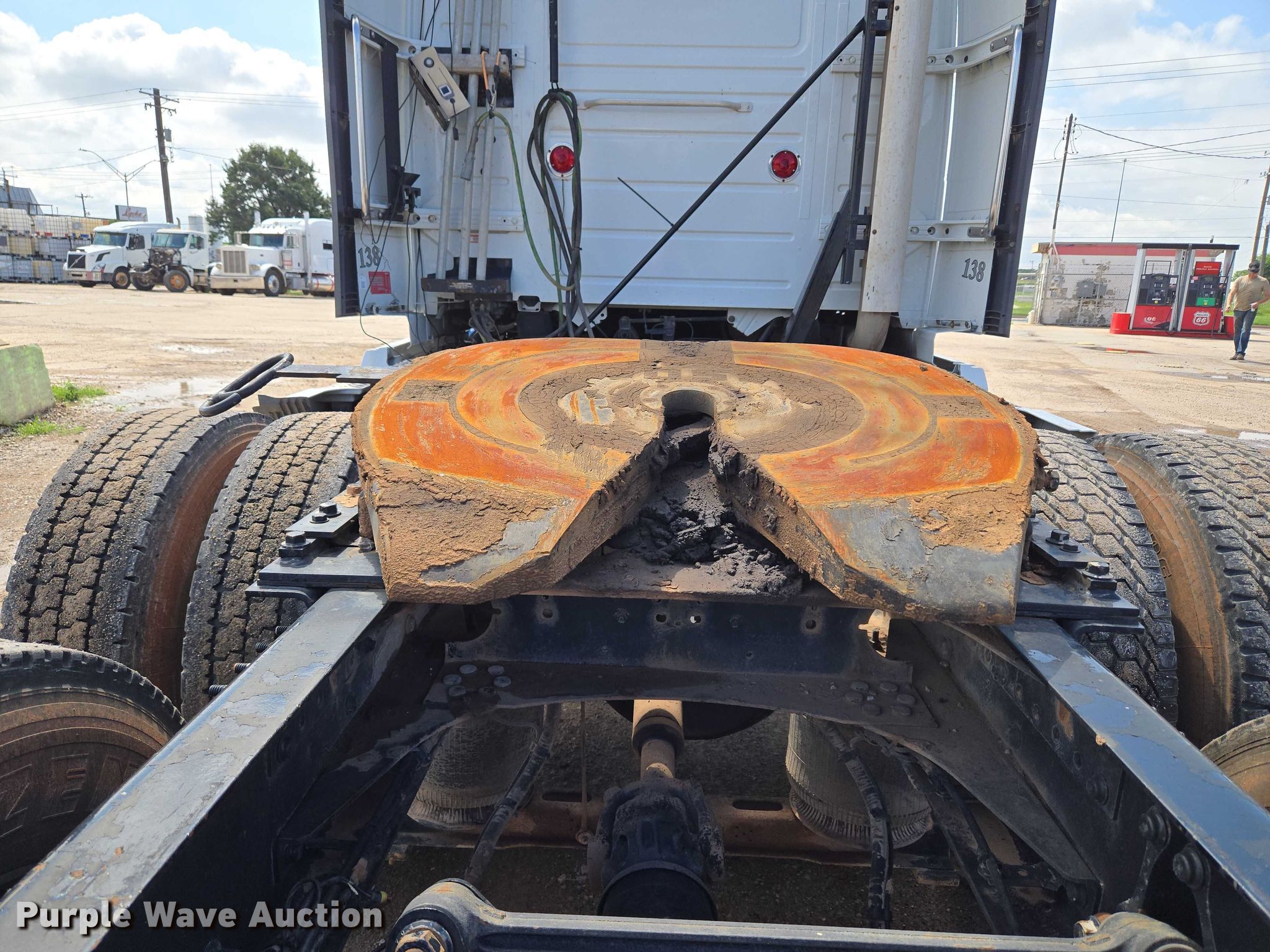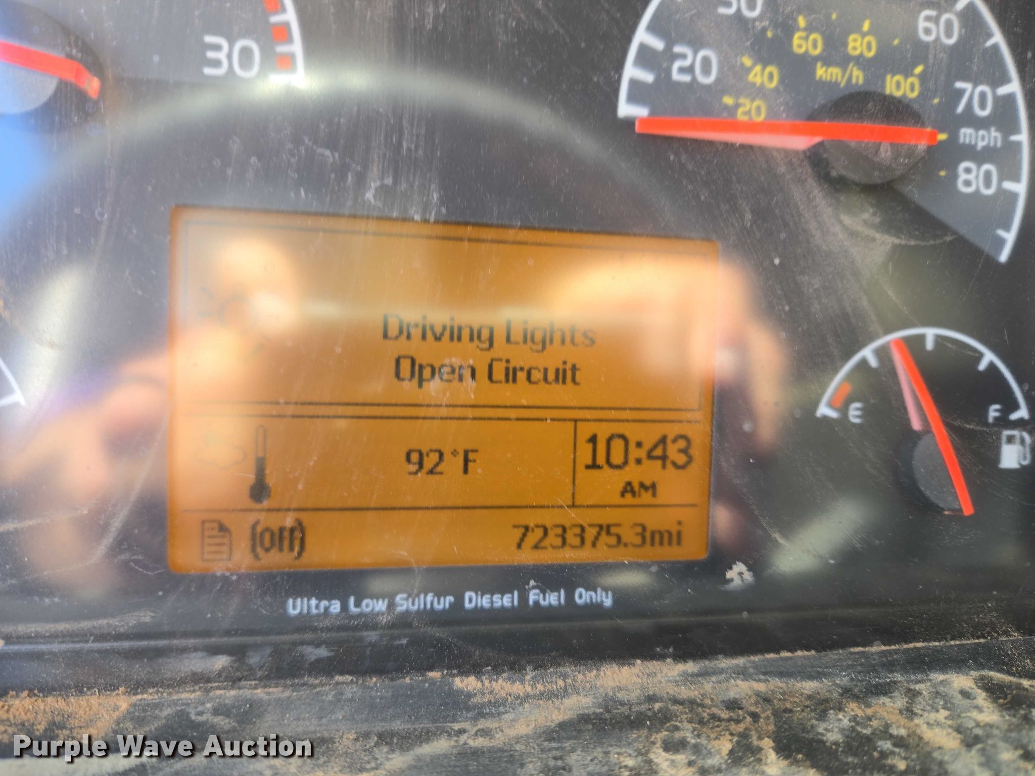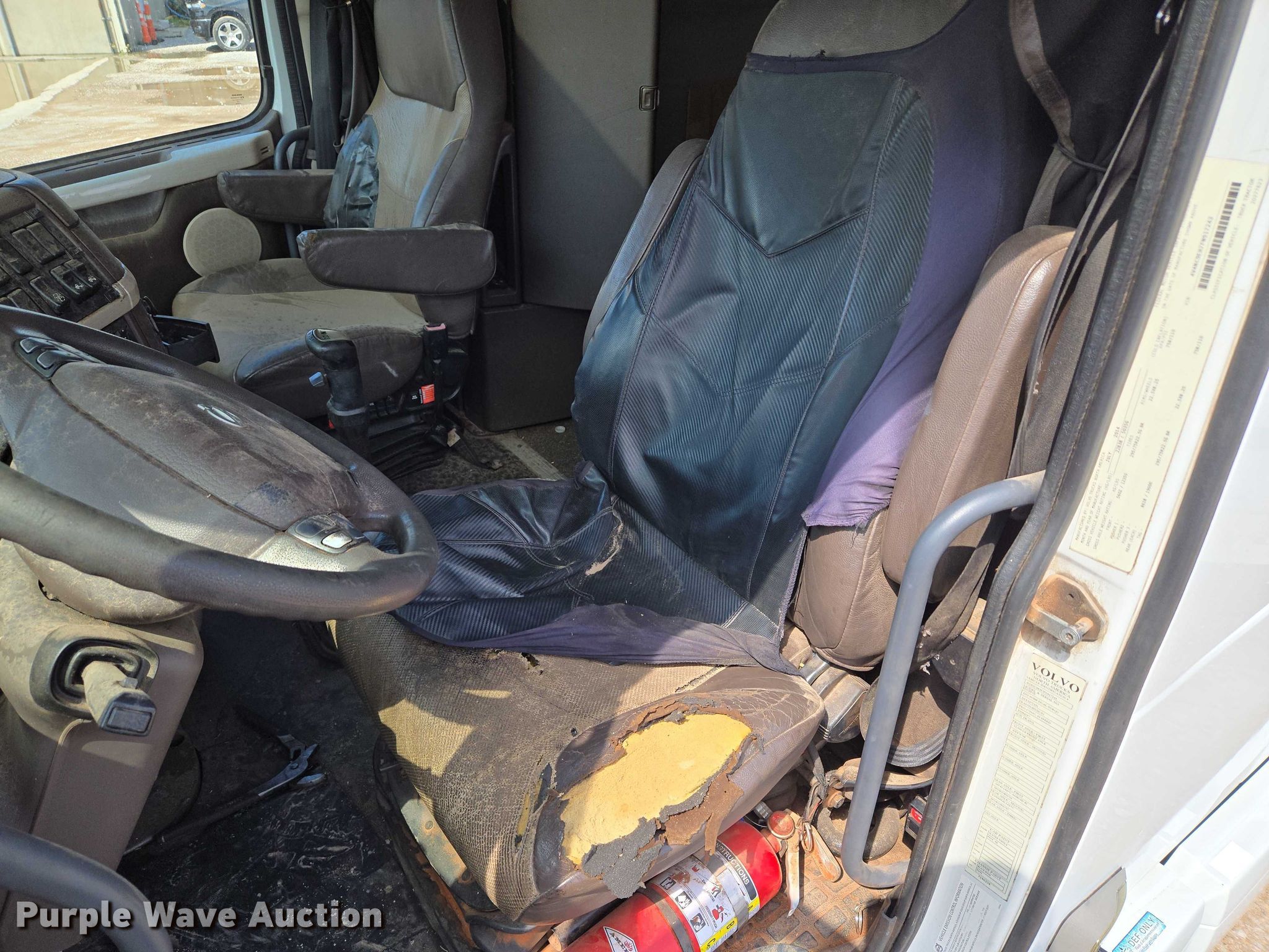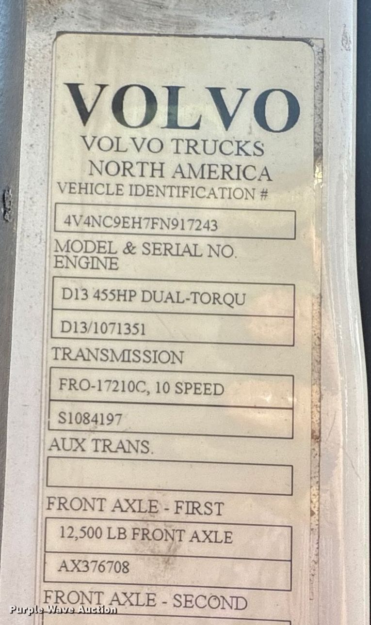2015 Volvo VN semi truck. Miles: 723,375 on odometer, VIN: 4V4NC9EH7FN917243. Engine Volvo D13, Serial: 1071351, Displacement: 12.8L, Cylinders: 6, Fuel type: Diesel. Transmission Eaton Fuller, Manual. Chassis Axles: Tandem, Differential lock: Inter-axle, Suspension: Air Dump valves, Brakes: Air. Interior AC, Heat, Heated mirrors, Power windows, Power locks, Cruise control, Air ride cab, Brake controller, Sleeper Sleeper length: 50", Beds: Double bunk, Refrigerator, Microwave, Rear climate control. Features Deck plate: Aluminum, Fifth wheel type: Air operated, Sliding, Fuel tank: Dual. Tires Size: 295/75R22.5. Notes Frame rust damage, Dash warning indicator: Check engine. Oklahoma title. Title distribution may be delayed up to 14 days from verification of funds. Penley Oil Company. Oklahoma City, OK 73107
