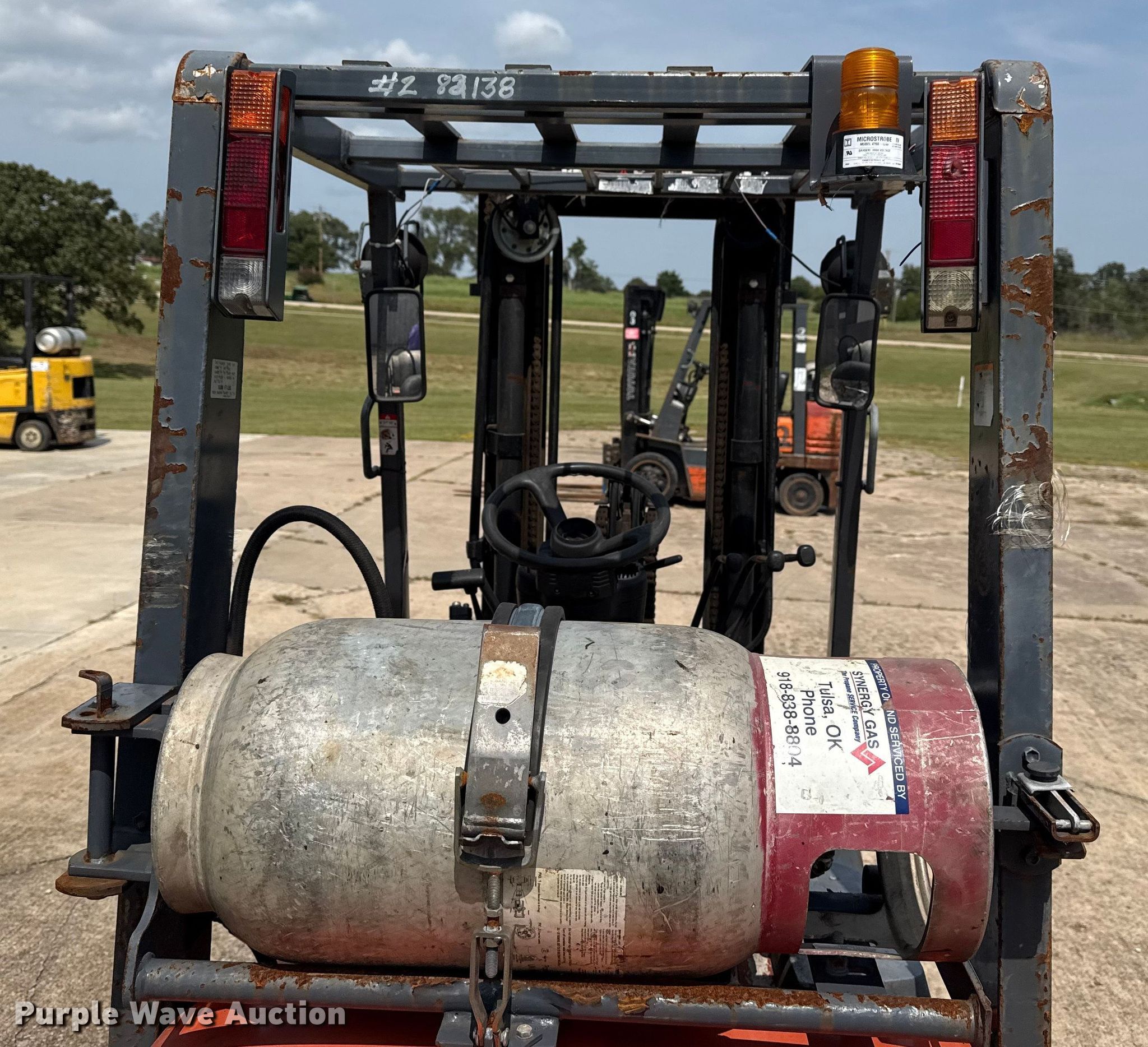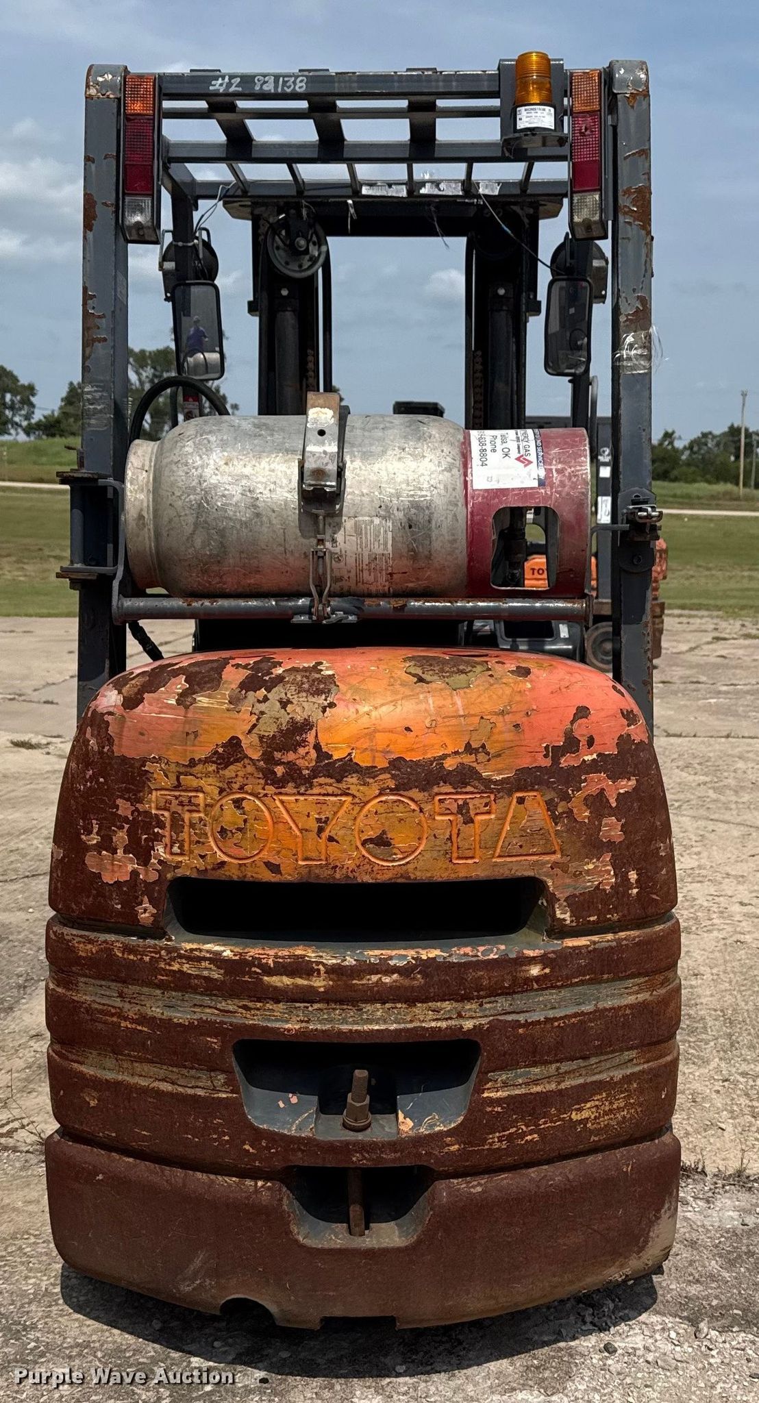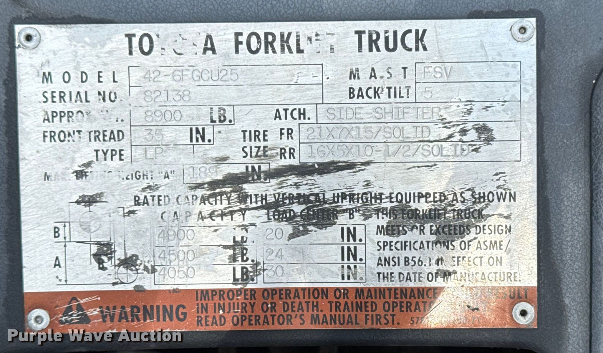 Purple Wave is selling a used Warehouse Forklift in Oklahoma. This item is a 1999 Toyota 42-6FGCU25 forklift with the following: Hours: Unknown, Serial: 82138