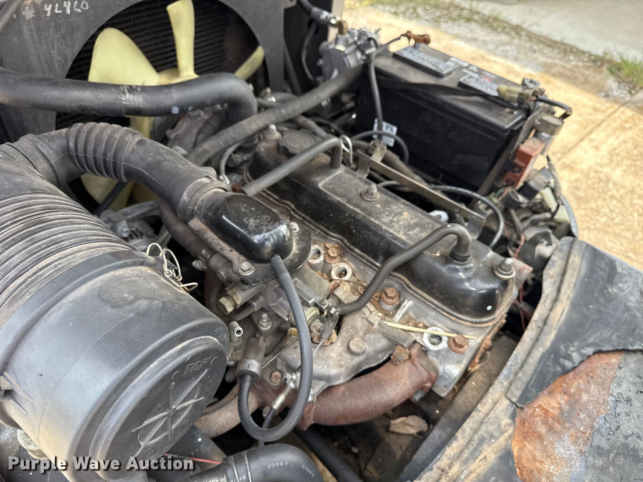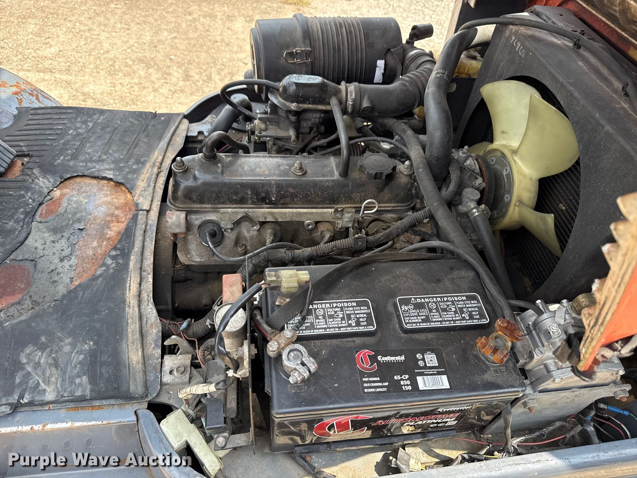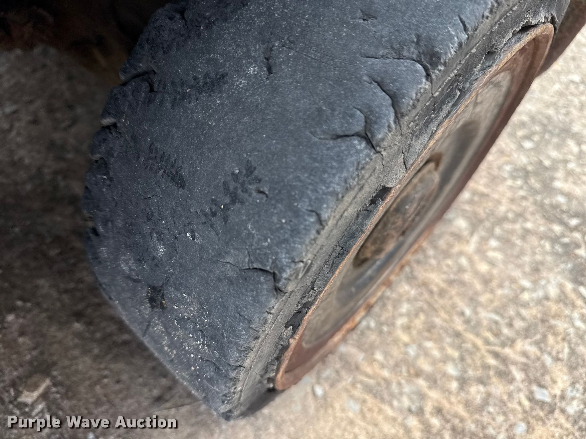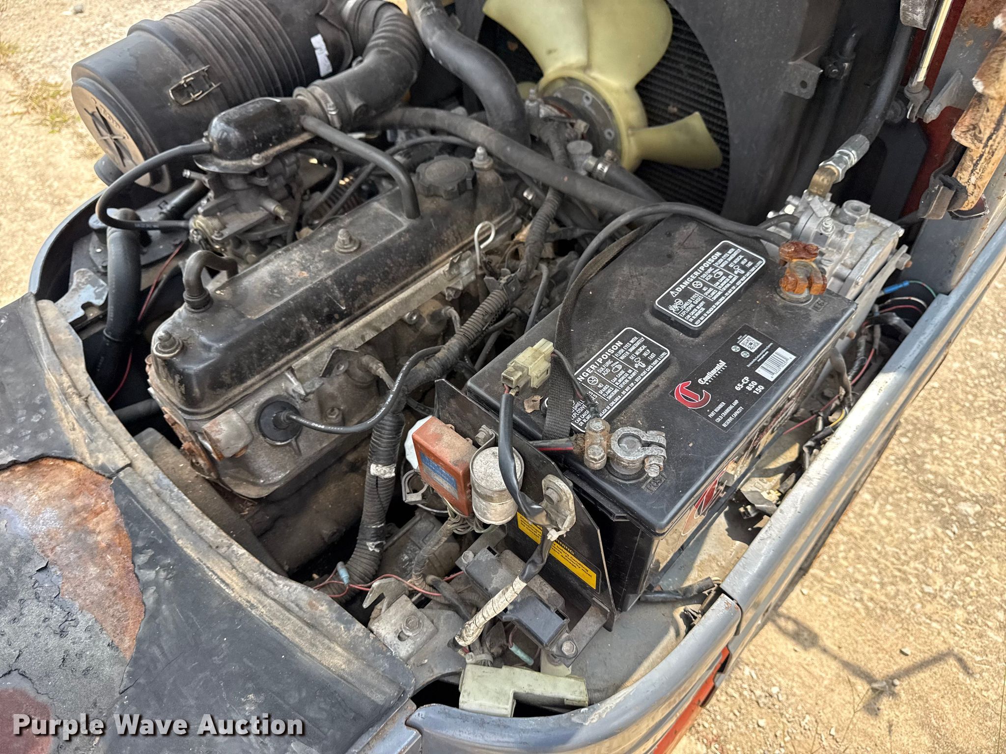 1999 Toyota 42-6FGCU25 forklift. Hours: Unknown, Serial: 82138. Engine Cylinders: 4, Fuel type: LPG LP bottle: Not included. Transmission Powershift. Operators station Canopy. Features Maximum lift capacity: 4,800 lbs, Maximum lift height: 189", Collapsed mast height: 83", Mast stages: 3, Side shift, Mast tilt, Fork length: 42". Tires Front: 533x178x281, Rear: Unknown, Solid. Notes Tires need replaced, Non-operational hour meter, Transmission issues. Flint Equipment LLC. Drumright, OK 74030