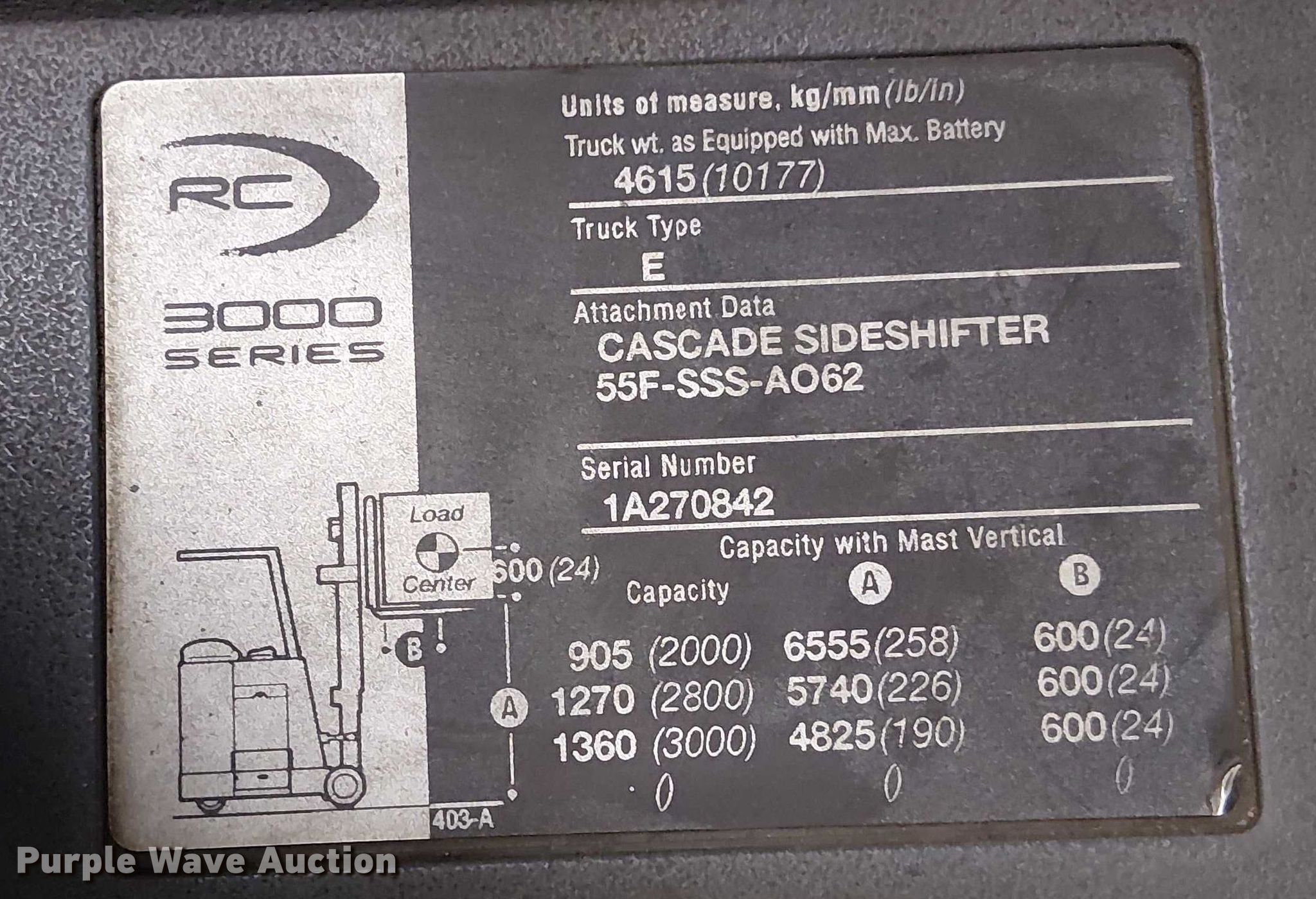 crown Cascade sideshifter forklift. Electric Motor. Volts: 36. Transmission Electric drive. Features Maximum lift capacity: 3,000 lbs, Maximum lift height: 258", Collapsed mast height: 85", Mast stages: 4, Side shift, Mast tilt, Fork length: 42". Tires Solid. Notes Batteries not included. Nor-Am Cold Storage. Detroit Lakes, MN 56501