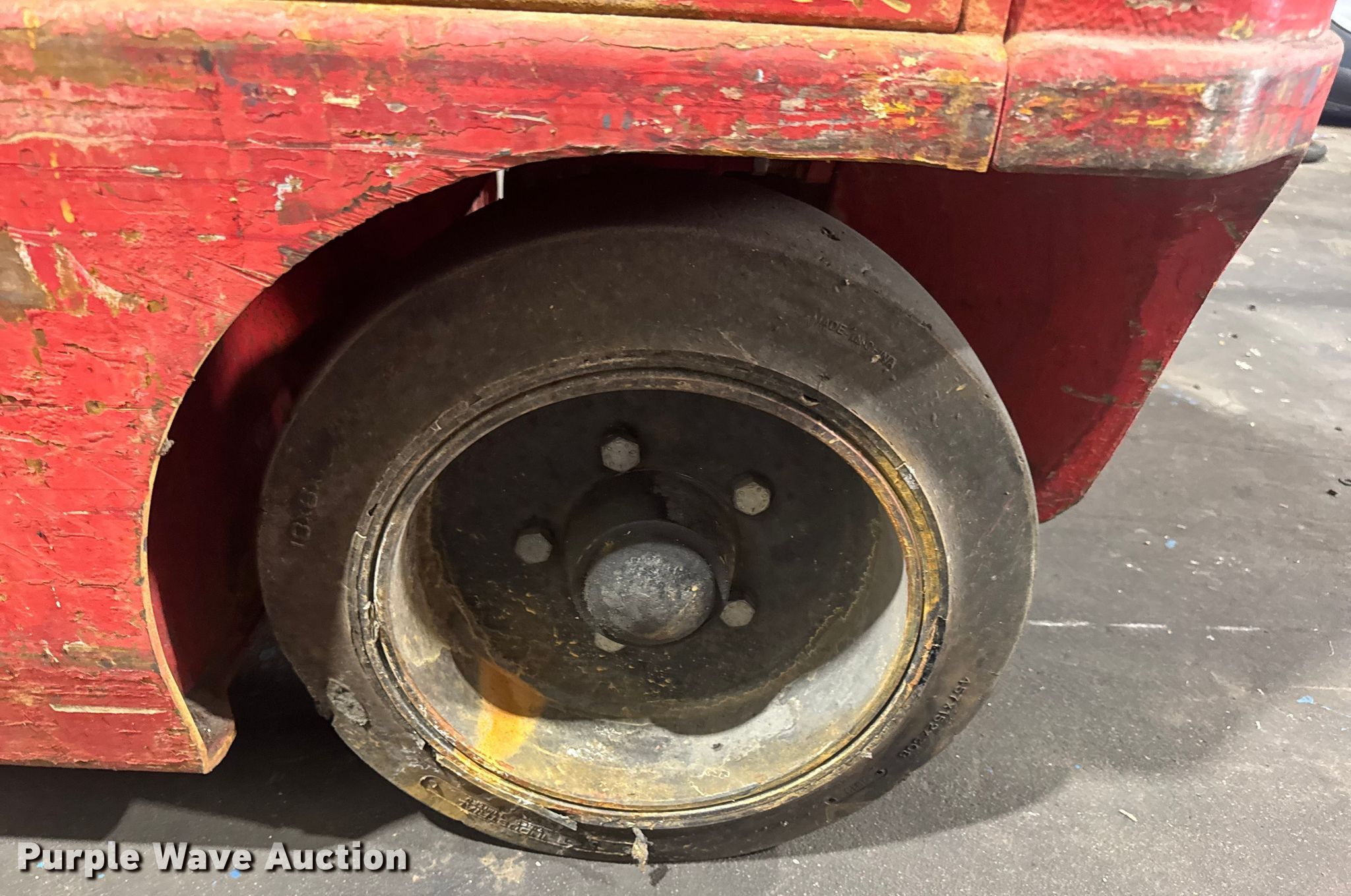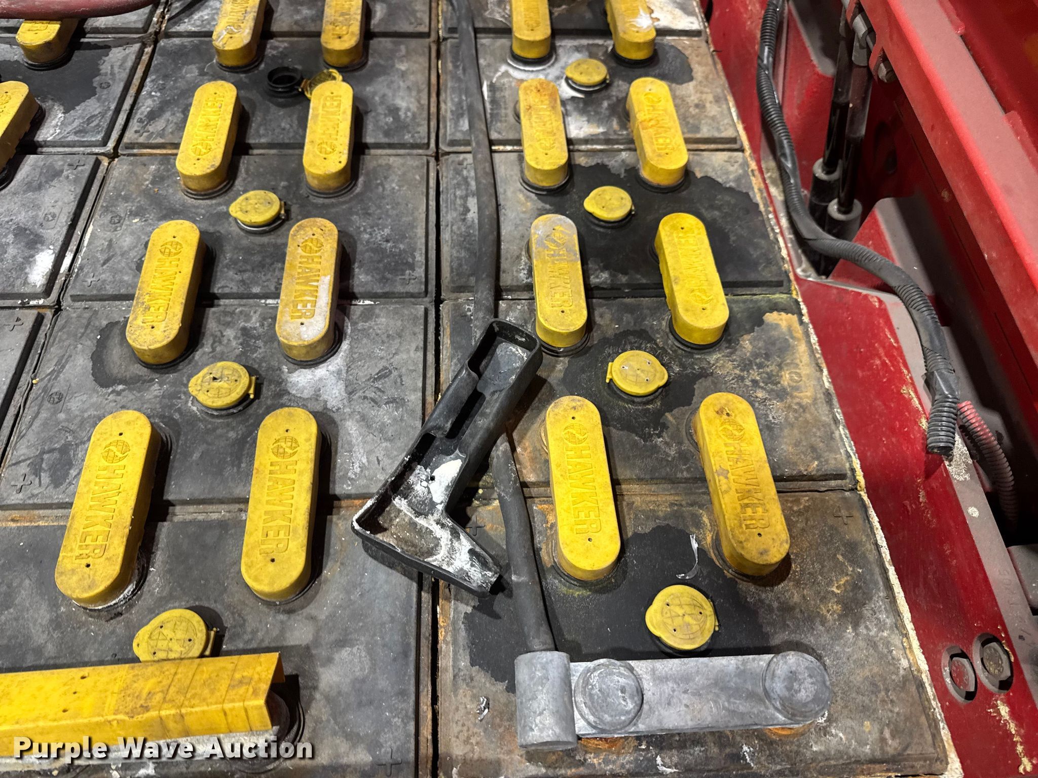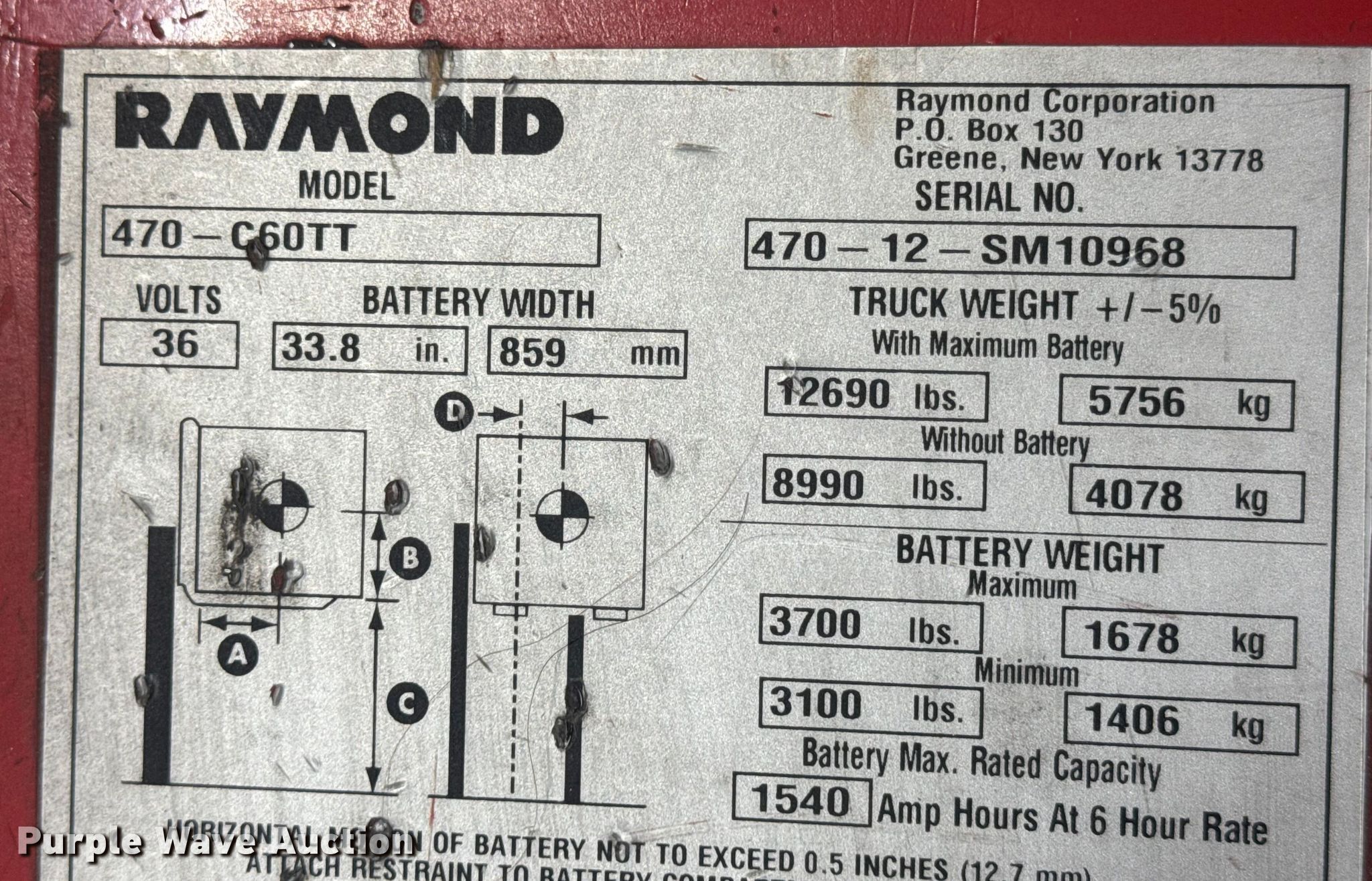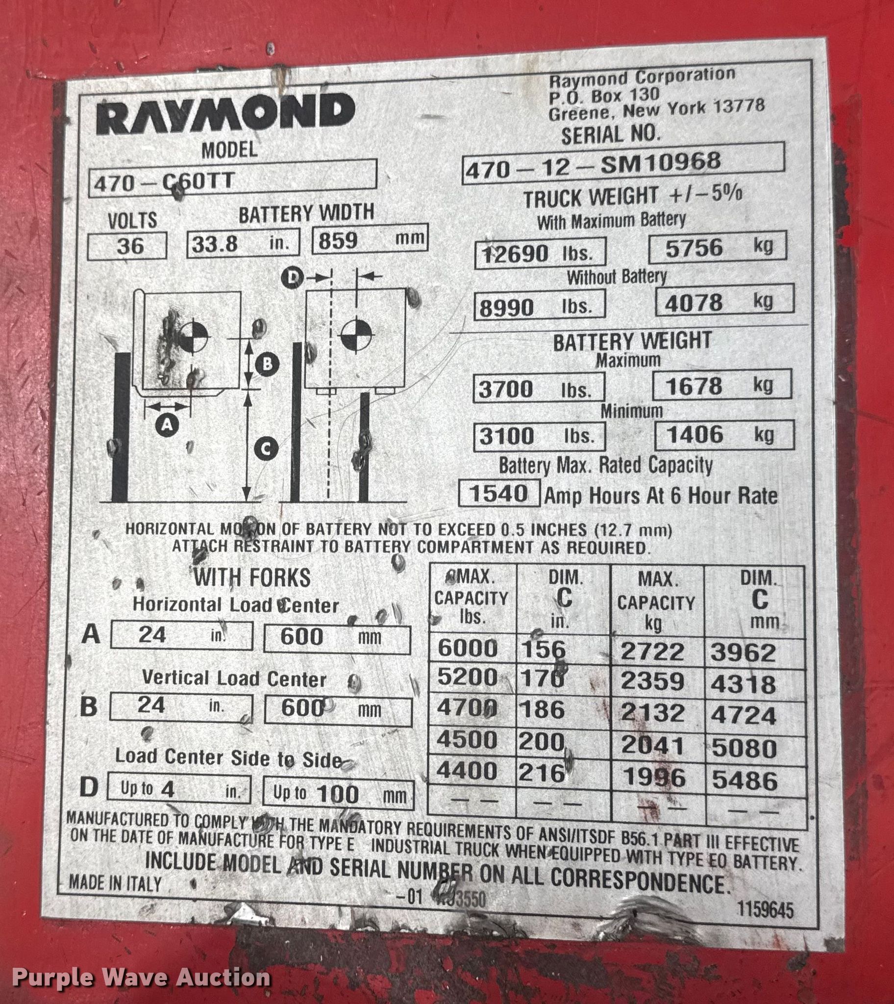 Raymond 470-C60TT forklift. Hours: 10,648 on meter, Serial: 470-12-SM10968. Electric Motor Volts: 36. Transmission Powershift. Features Maximum lift capacity: 6,000 lbs, Maximum lift height: 216", Collapsed mast height: 88", Mast stages: 3, Mast tilt, Fork length: 42". Tires Front: 533x229x381, Rear: 18x6x12 1/2, Solid, Non-marking. Notes Warning indicator: 92, Non-operational unit. Quaker Windows & Doors. Freeburg, MO 65035