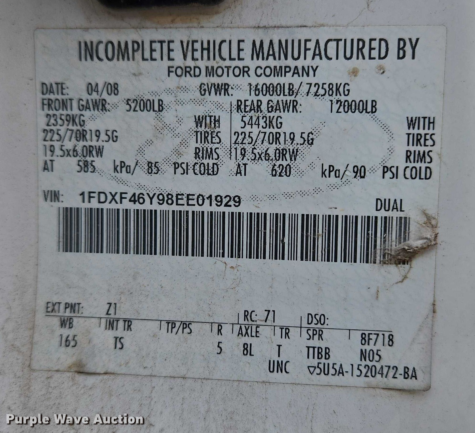 2008 Ford F450 Super Duty truck cab and chassis. Miles: 243,257 on odometer, VIN: 1FDXF46Y98EE01929. Engine Displacement: 6.8L, Cylinders: 10, Fuel type: Gas. Transmission Automatic. Chassis Suspension: Spring, Brakes: Hydraulic, GVWR: 16,000 lbs, Wheelbase: 165". Interior AC, Heat, Cruise control, Auxiliary controls, Brake controller. Tires Size: 225/70R19.5. Notes Fuel cap missing, Dash warning indicator: Check engine, Windshield chipped or cracked, Hail damage, Dead battery, Non-operational engine , Unit must be towed or hauled , Non-operational unit. Oklahoma title. Title distribution may be delayed up to 14 days from verification of funds. Penley Oil Company. Oklahoma City, OK 73107