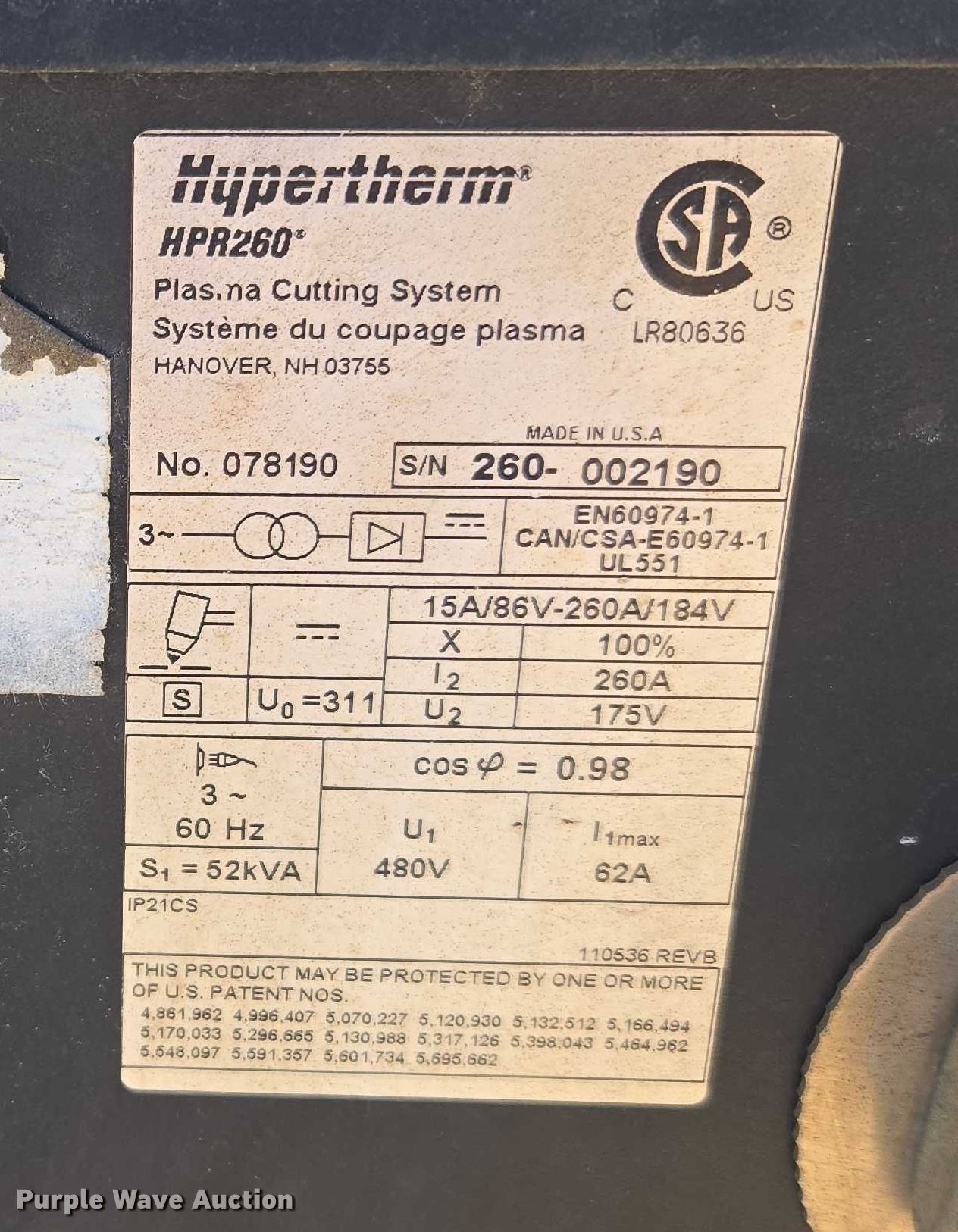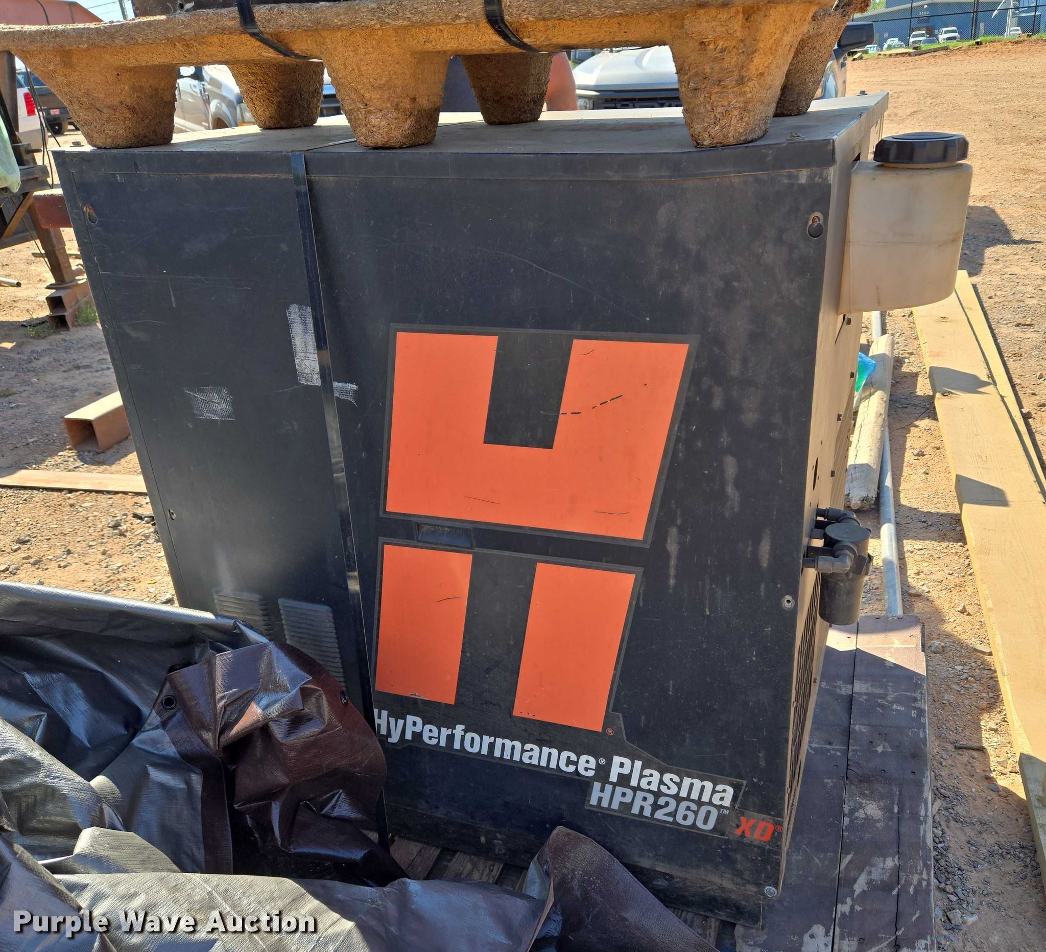 Messer plasma cutting table. Serial: MMPLU6-07-4950. Electric Motor Hypertherm HPR260 XD Serial: 260-002190, Volts: 480, Phase: Single. Features Messer cutting systems, Hypertherm powered, Max cutting depth: 2.5". Notes Non-operational display. Clints Welding. 3309 Southeast 59th Street. Oklahoma City, OK 73135