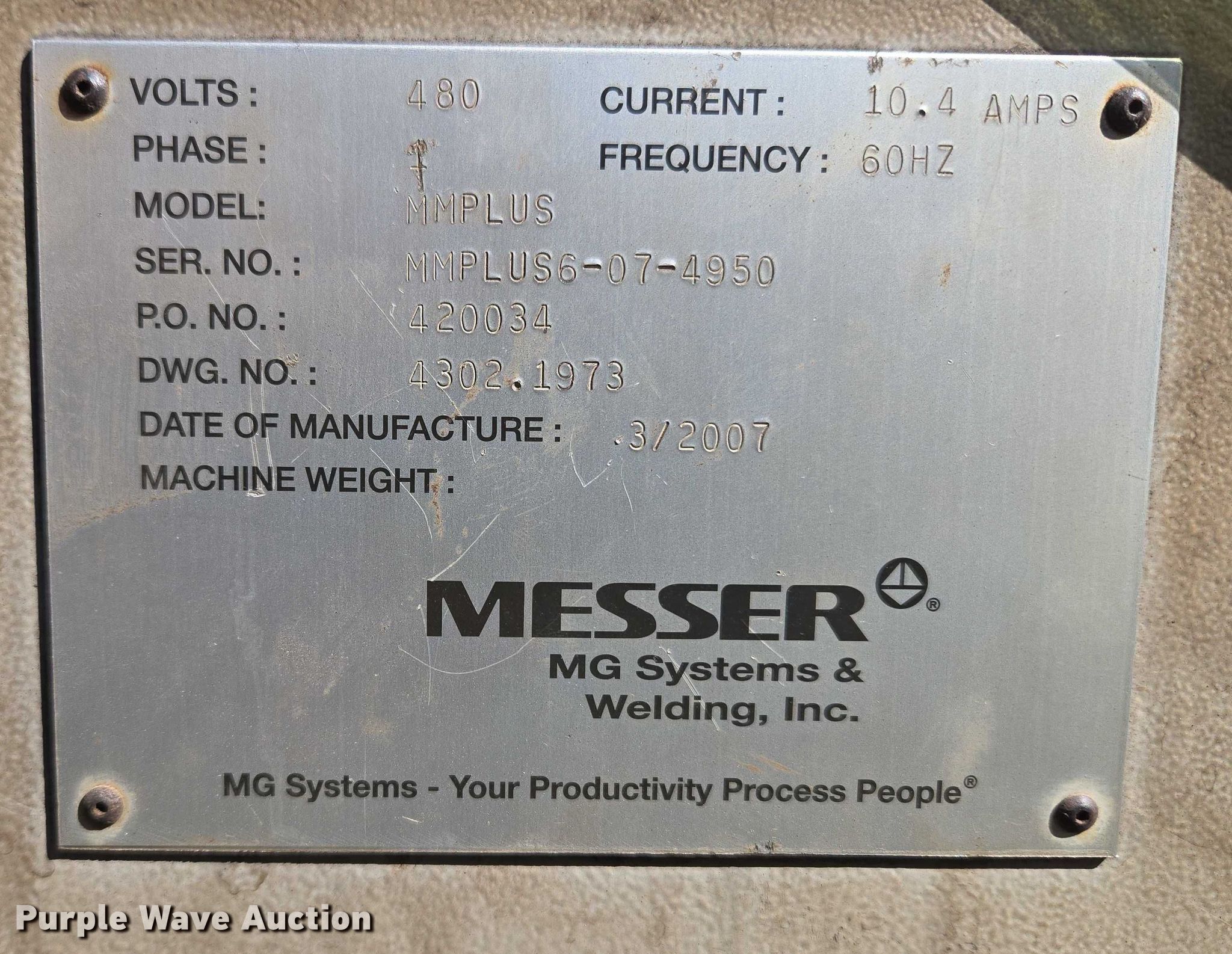 Purple Wave is selling a used Cutting Systems in Oklahoma. This item is a Messer plasma cutting table with the following: Serial: MMPLU6-07-4950