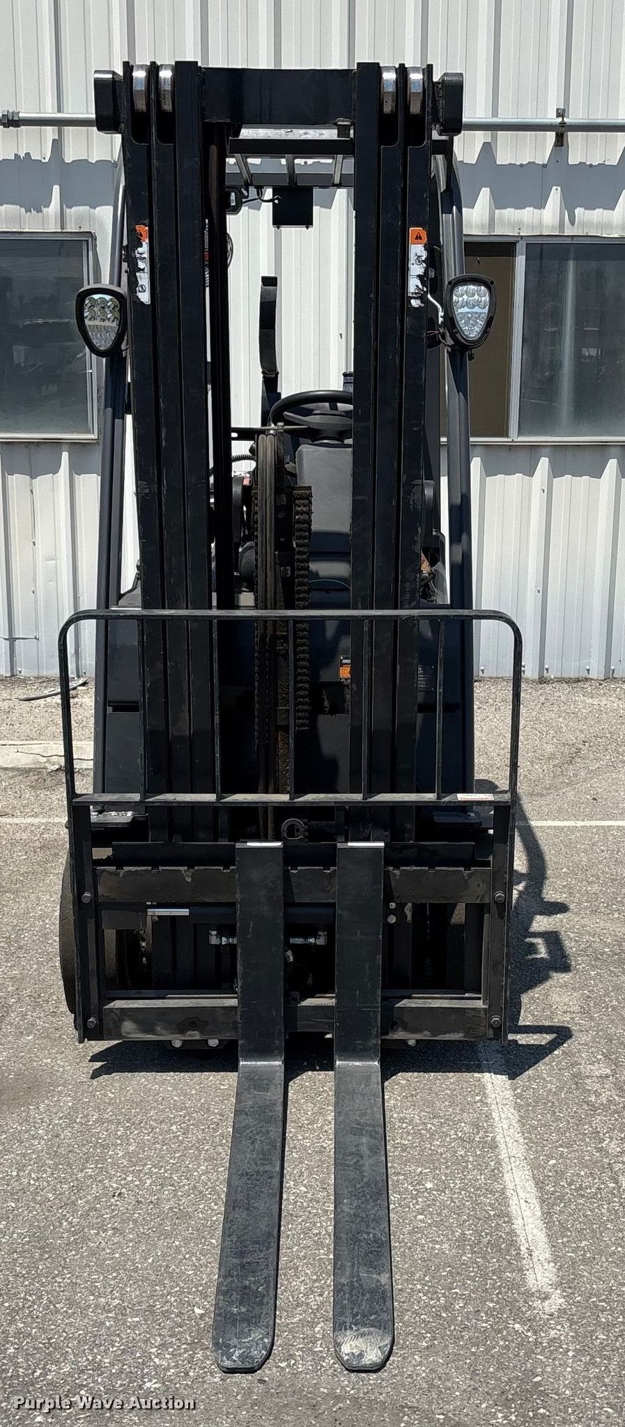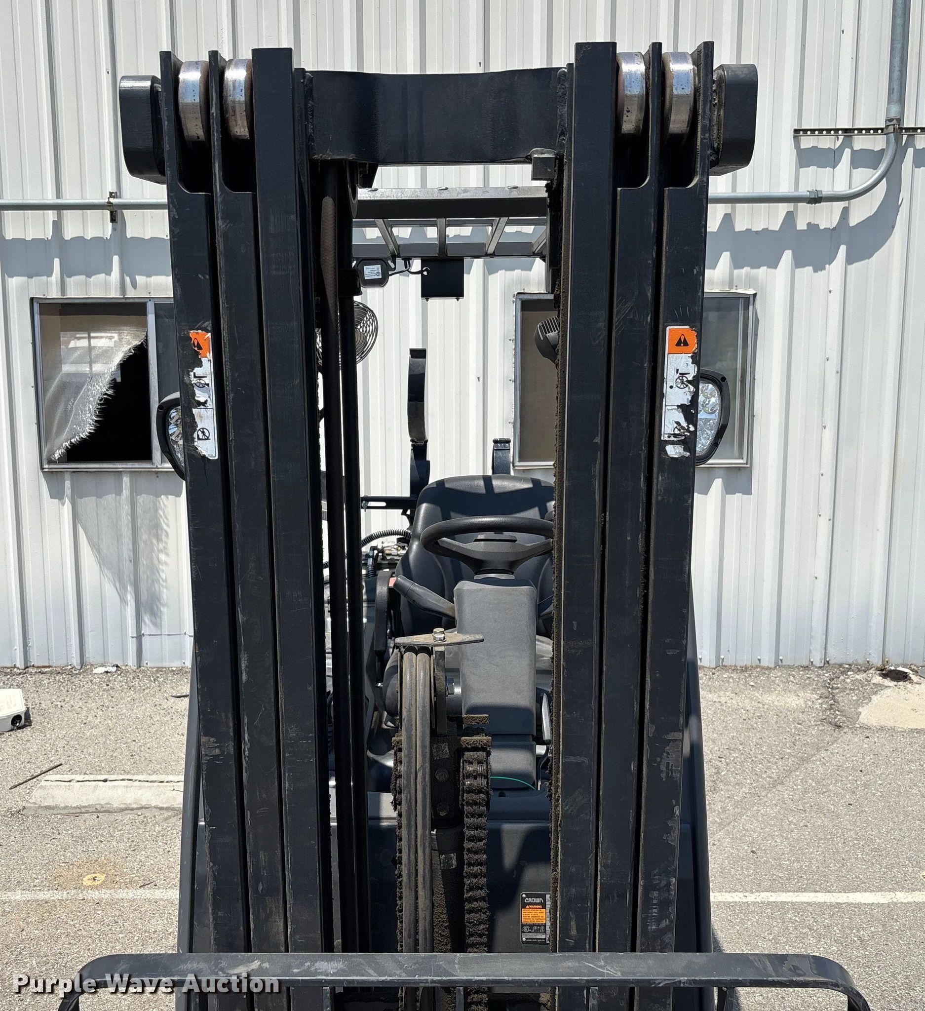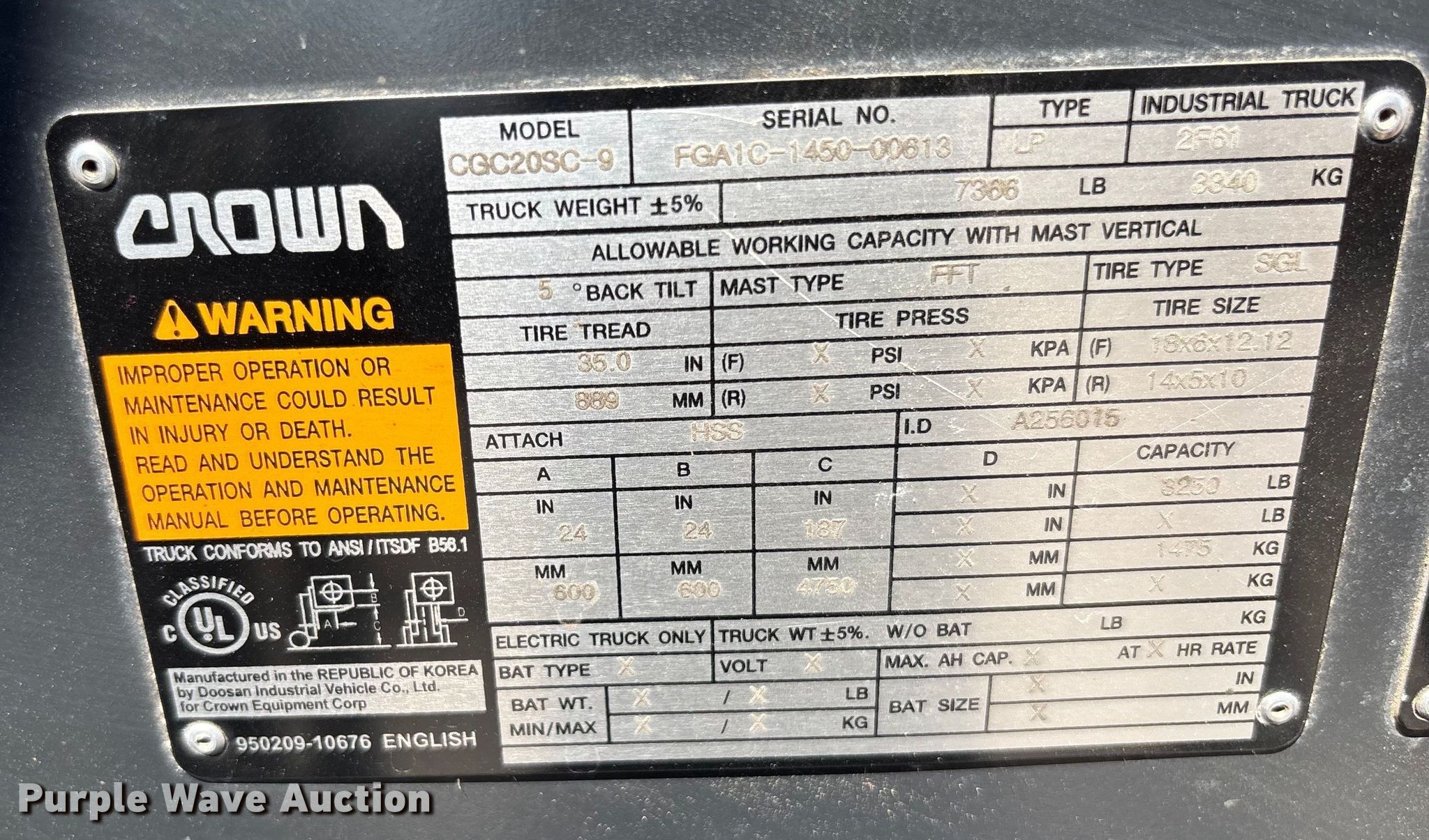 Crown CGC20SC-9 forklift. Hours: 5,597 on meter, Serial: FGA1C-1450-00613, Unit #: 65365435. Engine Mitsubishi, Cylinders: 4, Fuel type: LPG LP bottle: Not included. Transmission Powershift. Operators station OROPS. Features Maximum lift capacity: 3,250 lbs, Maximum lift height: 187", Collapsed mast height: 82", Mast stages: 3, Side shift, Mast tilt, Fork positioner, Fork length: 42". Tires Front: 18X6X12, Rear: 14X5X10, Solid. Notes Dead battery, Jump start required during on-site data collection, Parking brake switch missing. Repossessed item, stored at a secured facility. Please review REQUIRED REMOVAL INSTRUCTIONS. Lender Owned. Colton, CA 92324