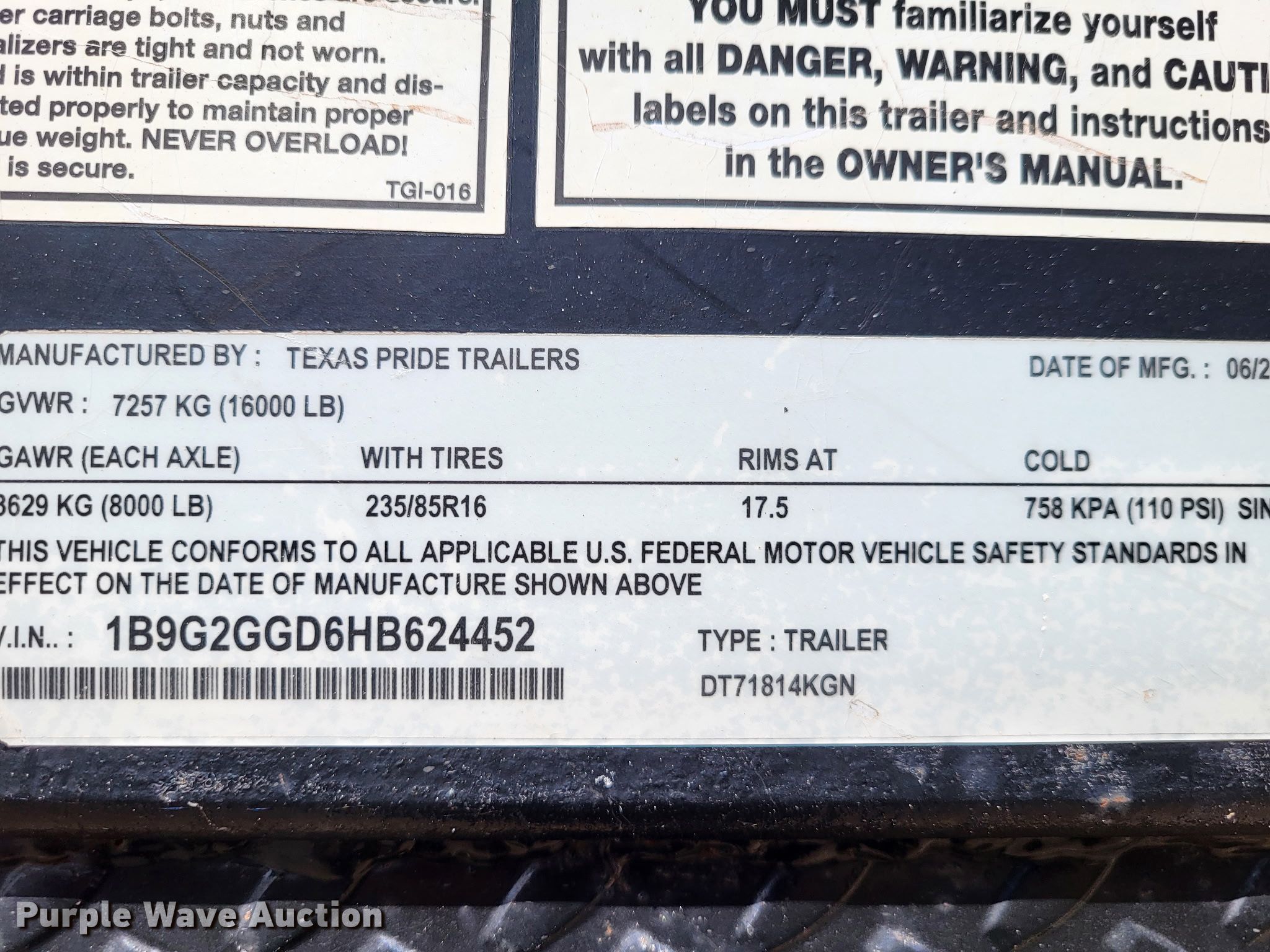 Purple Wave is selling a used Dump Trailer in Texas. This item is a 2017 Texas Pride dump trailer with the following: VIN: 1B9G2GGD6HB624452
