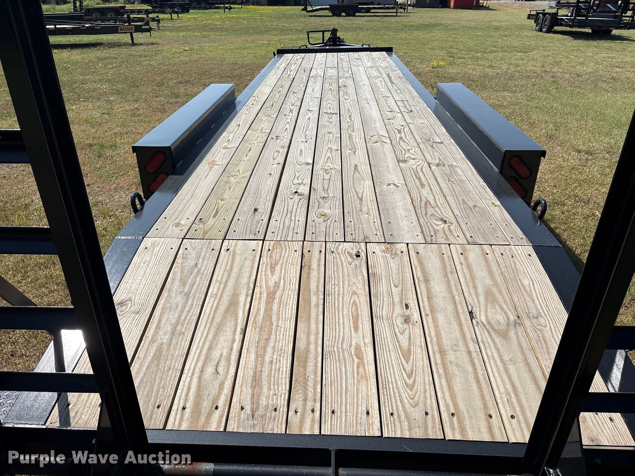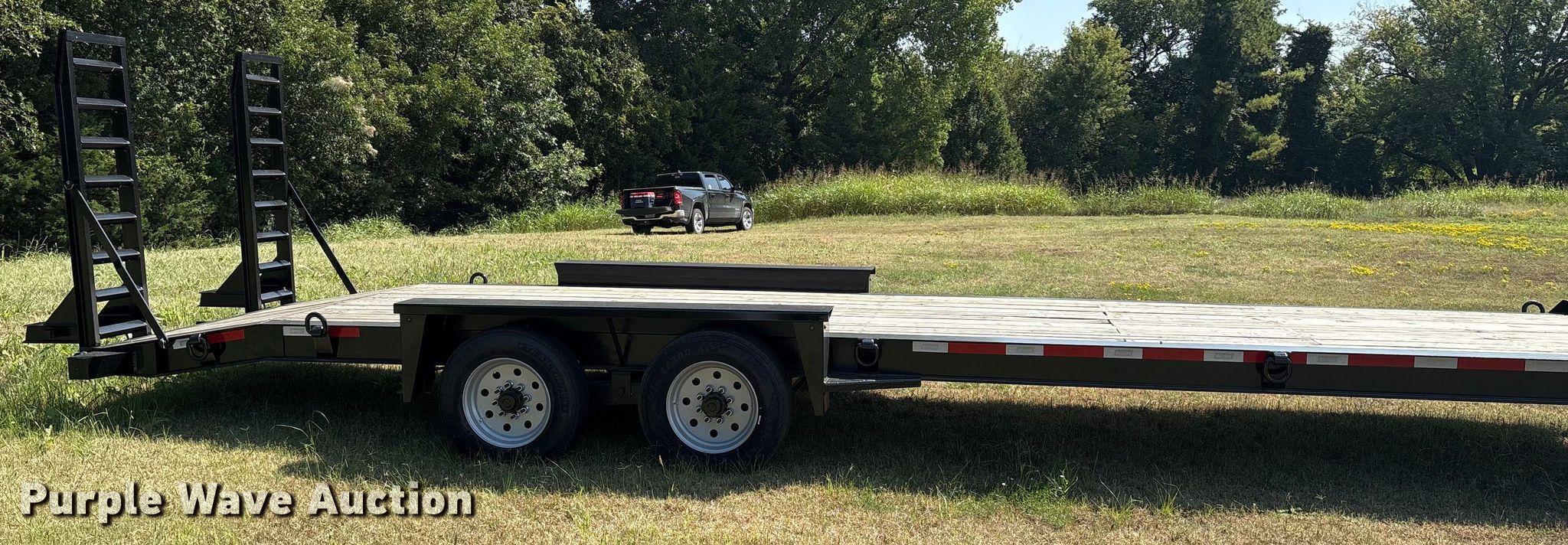 2025 Belshe BF8CX-2EP equipment trailer. VIN: 16JF02421S1052290. Dimensions Overall Length: 33', Width: 102", Deck Length: 24', Width: 81", Tail length: 3' 5", Ramps: Manual Length: 6'. Features Deck type: Wood. Chassis Hitch: Pintle, Landing gear: Single, Suspension: Spring, Brakes: Electric, Axles: Tandem, GVWR: 18,000 lbs. Tires Steel wheels, Size: 215/75R17.5. Notes Unused. Transfer of ownership documentation will be a bill of sale. Belshe Trailers. Tecumseh, OK 74873