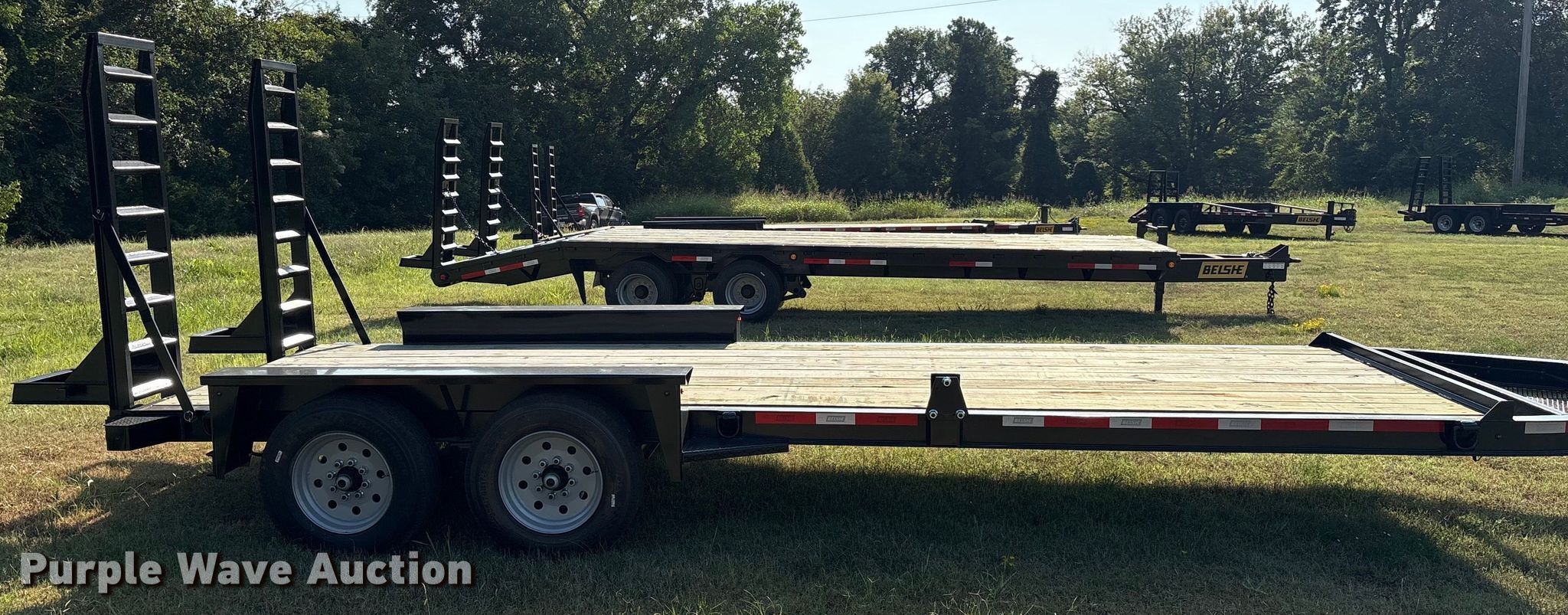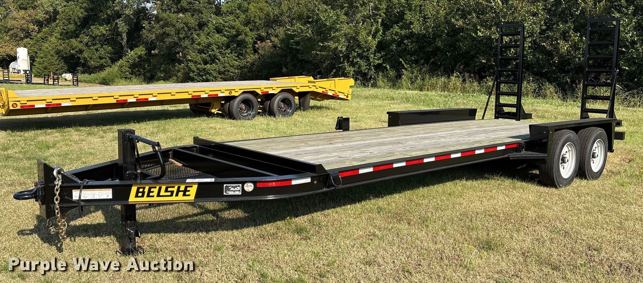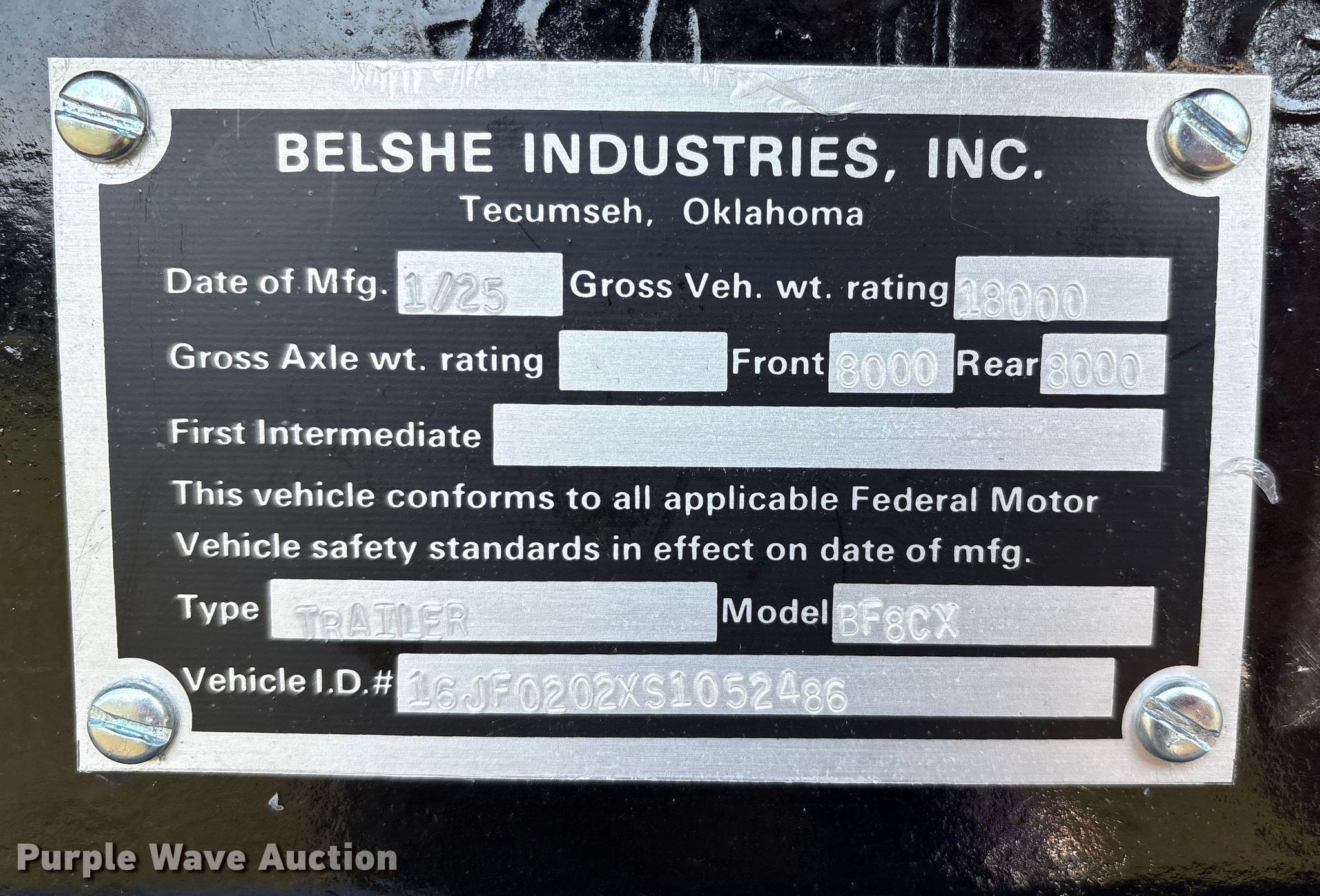 2024 Belshe BF8CX equipment trailer. VIN: 16JF0202XS1052486. Dimensions Overall Length: 26', Width: 102", Deck Length: 20', Width: 82", Ramps: Manual Length: 6'. Features Deck type: Wood. Chassis Hitch: Pintle, Landing gear: Single, Suspension: Spring, Brakes: Electric, Axles: Tandem, GVWR: 18,000 lbs. Tires Steel wheels, Size: 235/75R17.5. Notes Unused. Transfer of ownership documentation will be a bill of sale. Belshe Trailers. Tecumseh, OK 74873