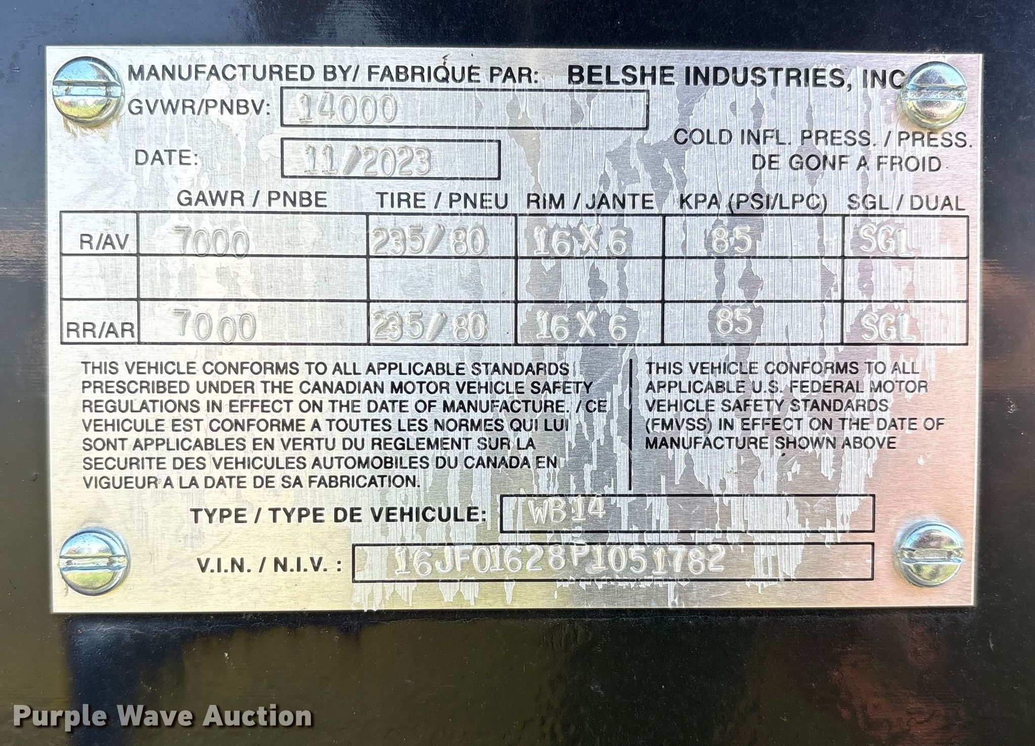 2023 Belshe WB14 equipment trailer. VIN: 16JF01628P1051782. Dimensions Overall Length: 22', Width: 102", Deck Length: 16', Width: 81", Ramps: Manual Length: 6'. Features Deck type: Wood. Chassis Hitch: Pintle, Landing gear: Single, Suspension: Spring, Brakes: Electric, Axles: Tandem, GVWR: 14,000 lbs. Tires Steel wheels, Size: 235/80R16. Notes Unused. Transfer of ownership documentation will be a bill of sale. Belshe Trailers. Tecumseh, OK 74873