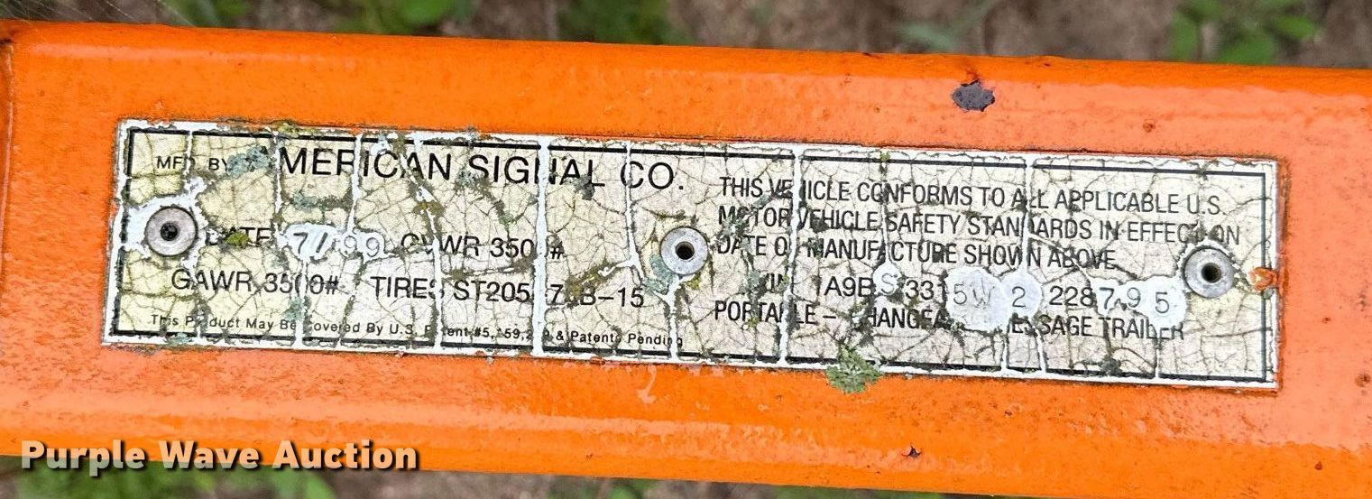 Purple Wave is selling a used Road Safety Equip. in Minnesota. This item is a 1999 American Signal message board trailer with the following: VIN: 1A9BS335W2228795