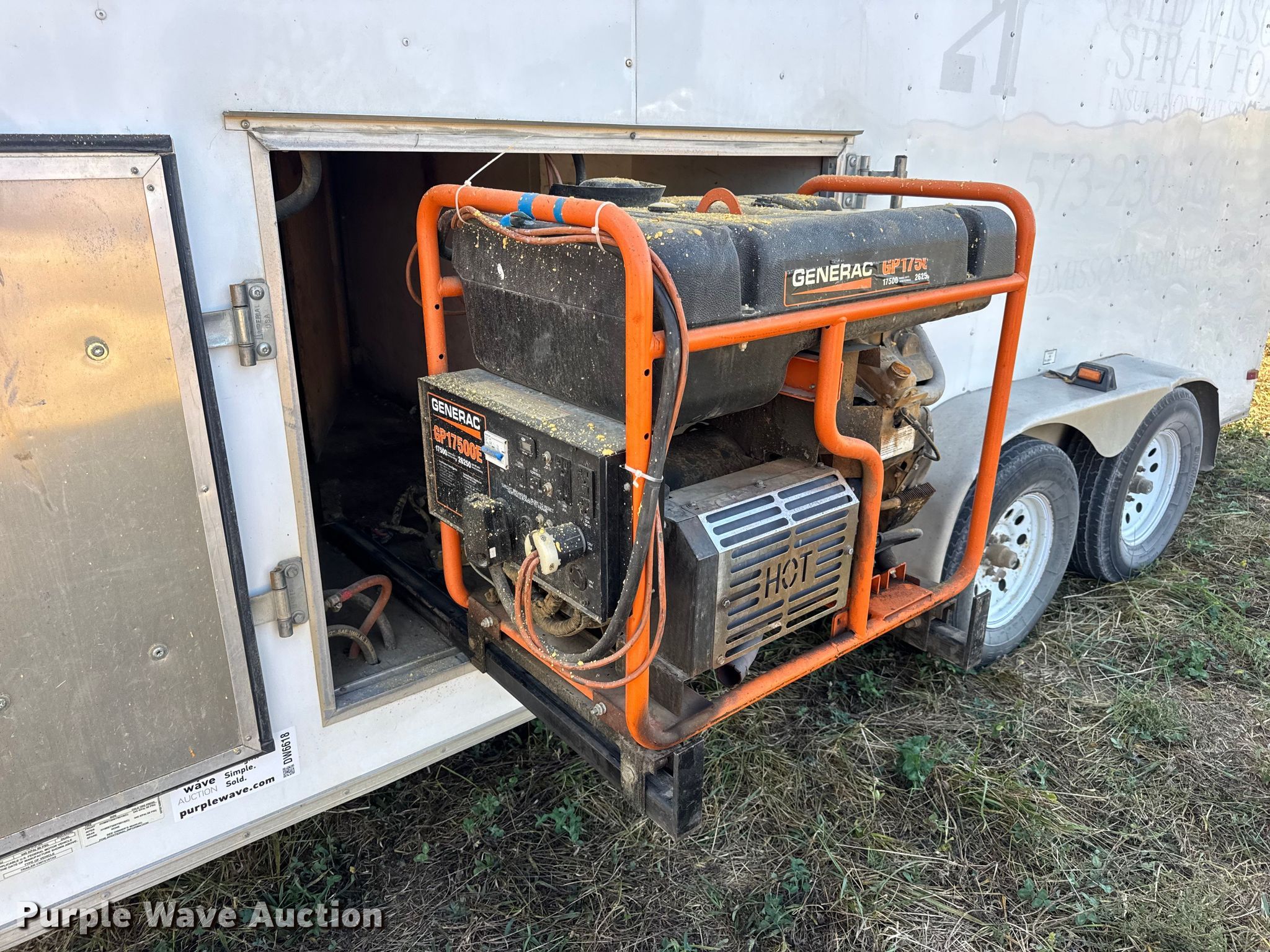 2014 Covered Wagon CE7X16TA2 spray foam enclosed trailer. VIN: 53FBE1628EF014323. Dimensions Overall Length: 20', Width: 104", Rear door / ramp 76" L x 72" W. Features Deck type: Wood, Generator Generac GP17500E, Fuel type: Gas, Watts: 17,500, Volts: 120/240, Electric Start, Air compressor PSI: 170, Briggs & Stratton Vanguard engine Fuel type: Gas, HP: 18, Electric start, (4) barrels, JHPK proportioner, PMC hose, Graco spray wand. Chassis Ball hitch: 2 5/16", Landing gear: Single, Suspension: Spring, Brakes: Electric, Axles: Tandem, GVWR: 7,000 lbs, GAWR: 3,500 lbs. Tires Steel wheels, Size: ST225/75R15. Notes Contents Included. Missouri title. Title distribution may be delayed up to 30 days from verification of funds. Spray Right Foam Insulation. Syracuse, MO 65354