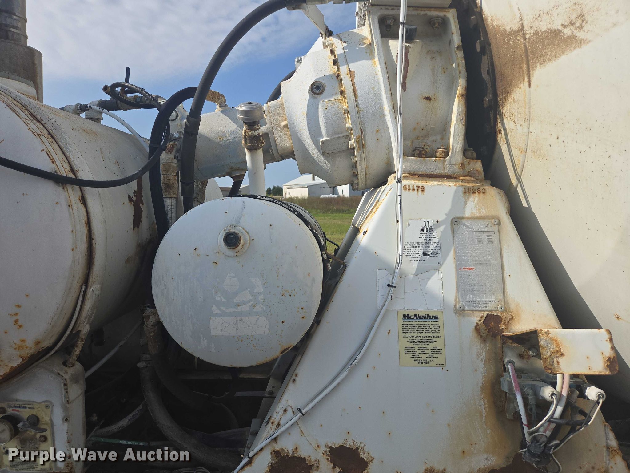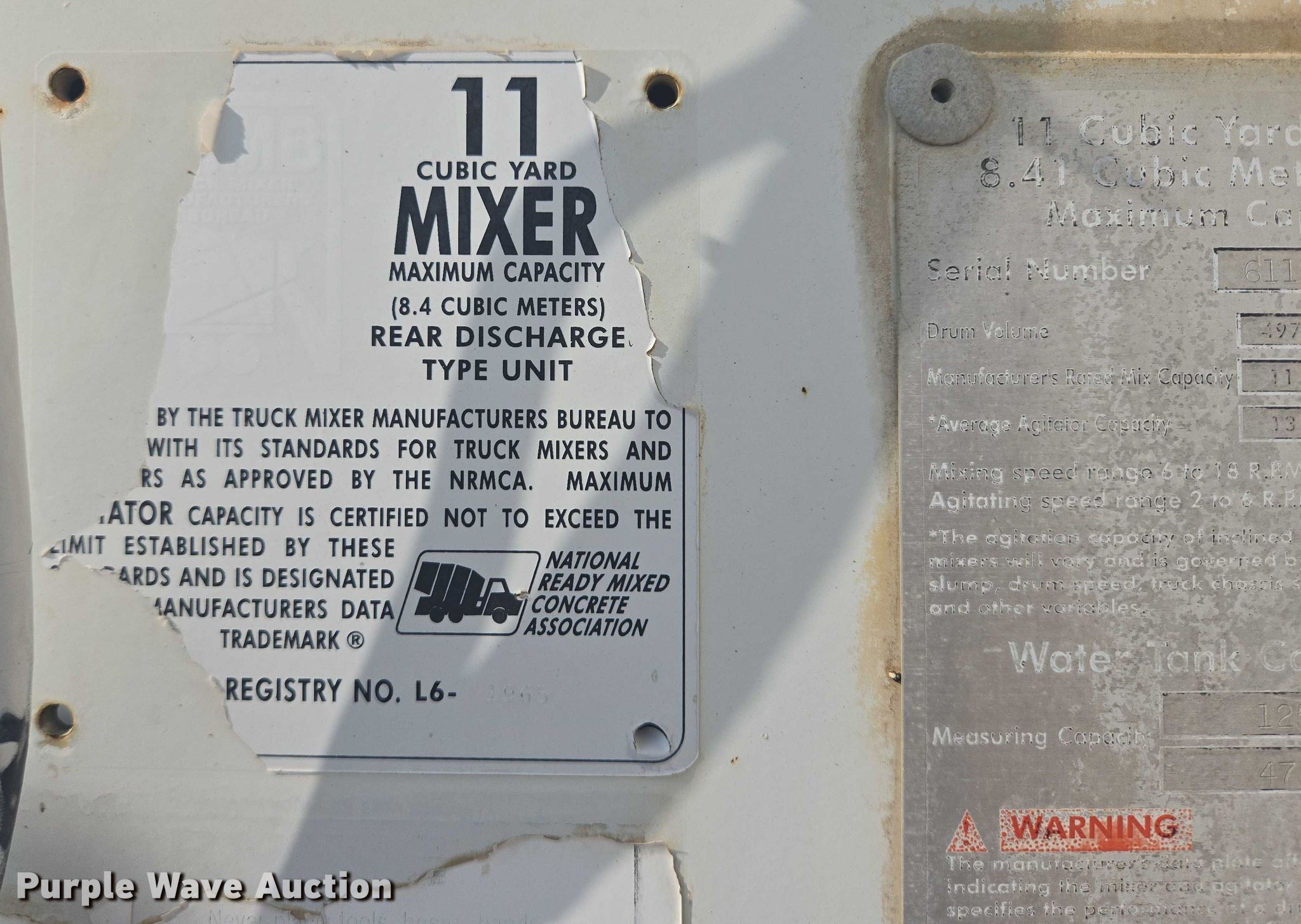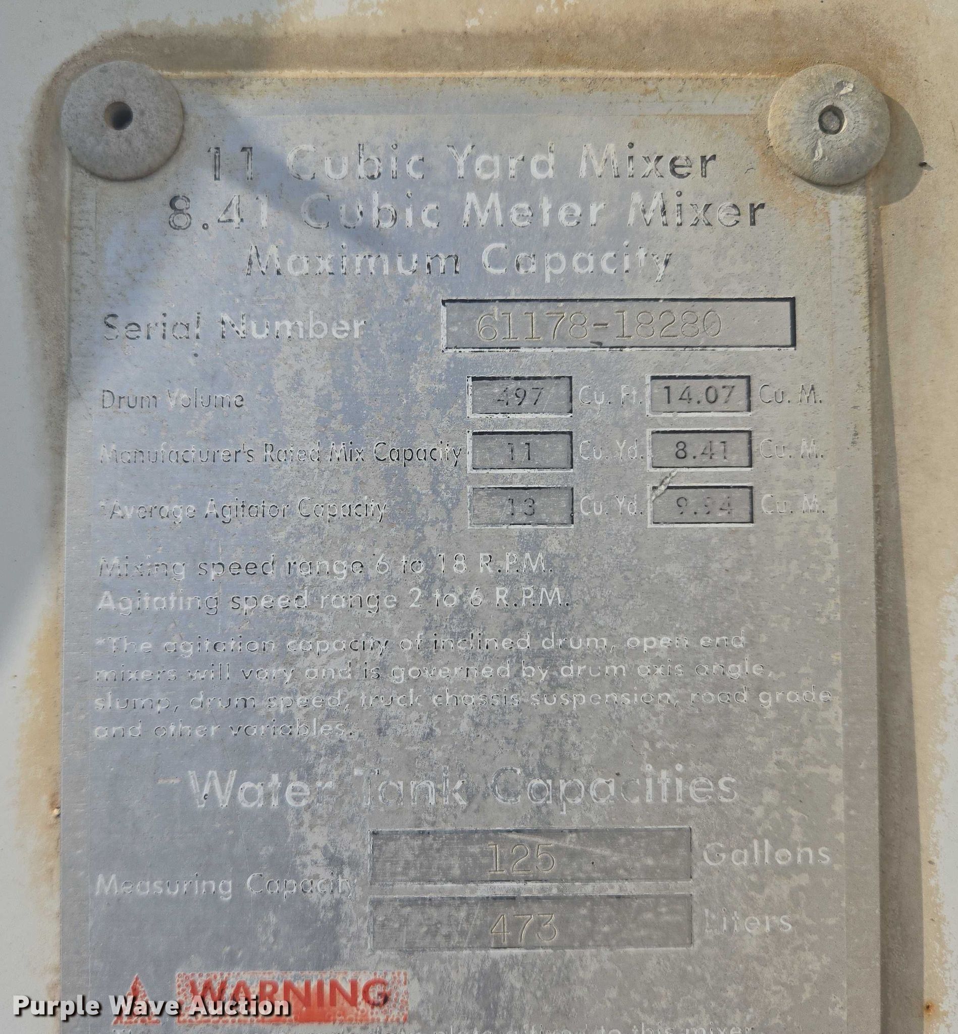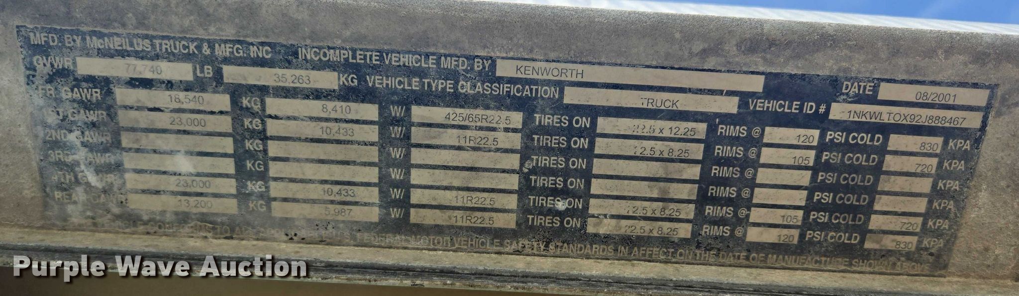 2002 Kenworth W900 ready mix truck. Miles: 32,329 on odometer, Hours: 9,849 on meter, VIN: 1NKWLT0X92J888467, Unit #: 2721. Engine Caterpillar C-10, Serial: 3CS23008, Cylinders: 6, Fuel type: Diesel, HP: 335. Transmission Eaton Fuller, Manual, Speed: 10. Chassis Axles: Triple, Tag axle Steerable, Differential lock: Inter-axle, Suspension: Spring over walking beam, Brakes: Air, PTO, GVWR: 77,740 lbs. Interior AC, Heat, Cruise control. Features Mixer McNeilus, Serial: 61178-18280, Capacity: 11 cu.yd., Discharge: Rear, In-cab controls, Rear drum controls, Water tank capacity: 125 gallons, Chute Extensions: 3, Chute type: Steel.. Tires Front: 425/65R22.5, Rear: 11R22.5, Lift axle: 315/80R22.5. South Dakota title. Title distribution may be delayed up to 14 days from verification of funds. Consolidated Ready Mix Inc.. Bellingham, MN 56212