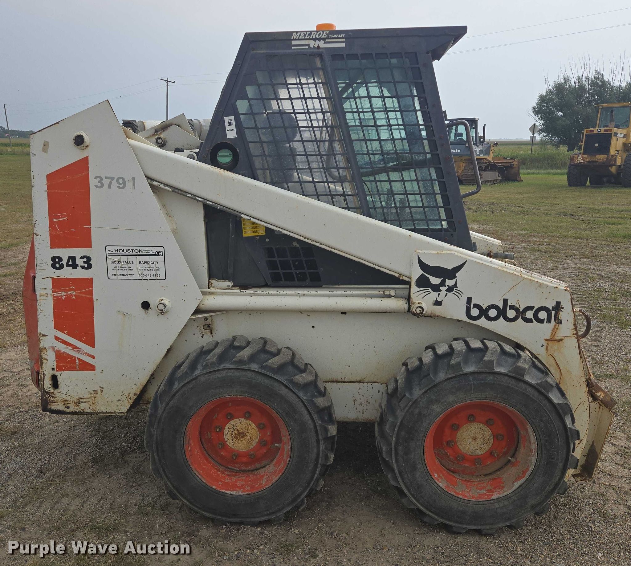 1985 Bobcat 843 skid steer loader. Serial: 5026-M-21869, Unit #: 3791. Engine Cylinders: 4, Fuel type: Diesel. Transmission Hydrostatic. Operators station OROPS, Heat, Bucket control: Foot. Features Auxiliary hydraulics, Quick coupler: Manual. Tires Size: 12-16.5. Consolidated Ready Mix Inc.. Bellingham, MN 56212