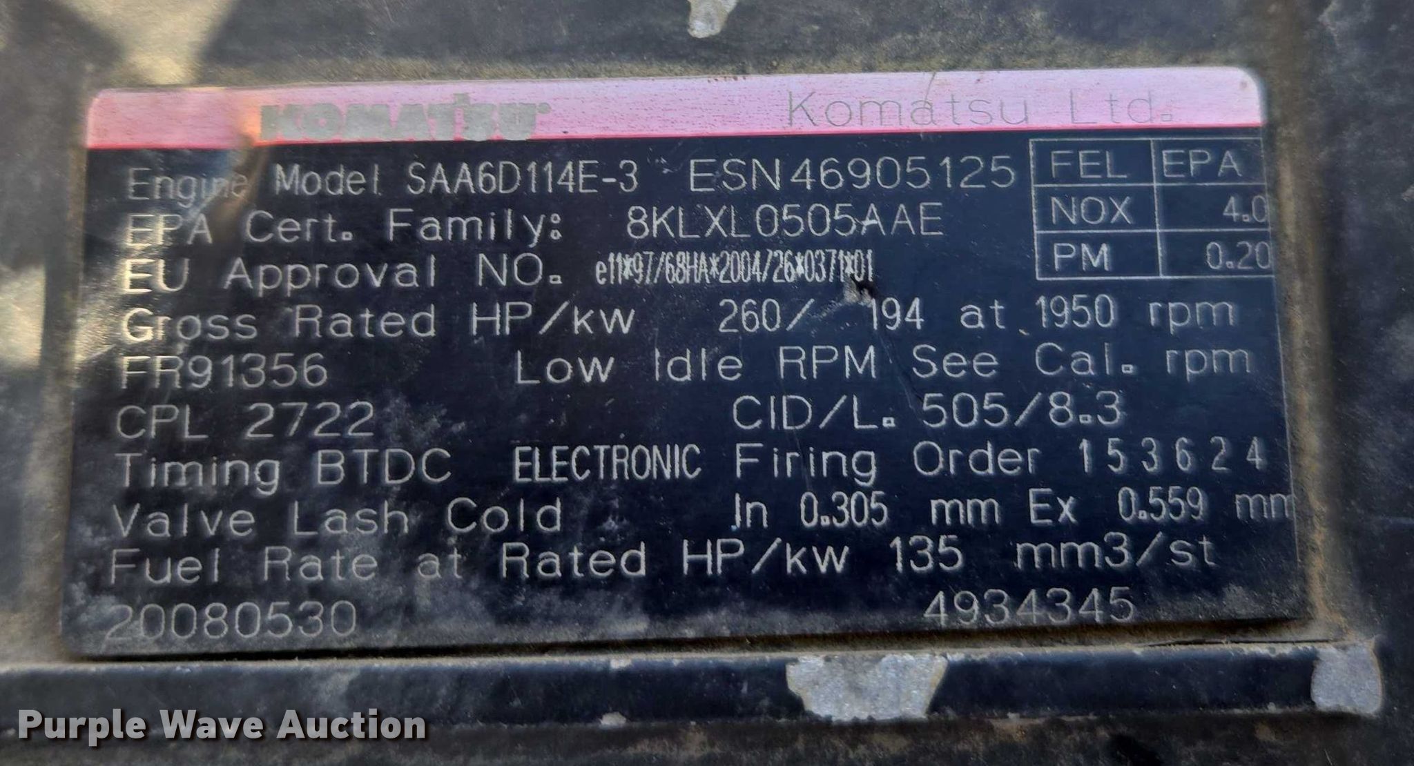 2008 Komatsu PC300LC-8 excavator. Hours: 8,451 on meter, Serial: KMTPC191054A90514. Engine Komatsu SAA6D114E, Serial: 46905125, Displacement: 8.3L, Cylinders: 6, Fuel type: Diesel, HP: 260. Transmission Hydrostatic, Two speed travel. Operators station Enclosed cab, AC, Heat. Features Auxiliary hydraulics, Counter weights, Boom Standard, Stick Stick length: 12', Thumb: Hydraulic, Bucket Hensley, Capacity: 2.22 cu.yd., Width: 46", Teeth: 5. Tracks Width: 34", Steel, Grouser pads: Triple. Notes Engine overhauled 03/23/2019, Warning indicator: Water in the fuel system., Glass cracked, Fuel system issues, water in fuel , Unknown operating condition. View repairs. Wagnercorp. Craig, CO 81625
