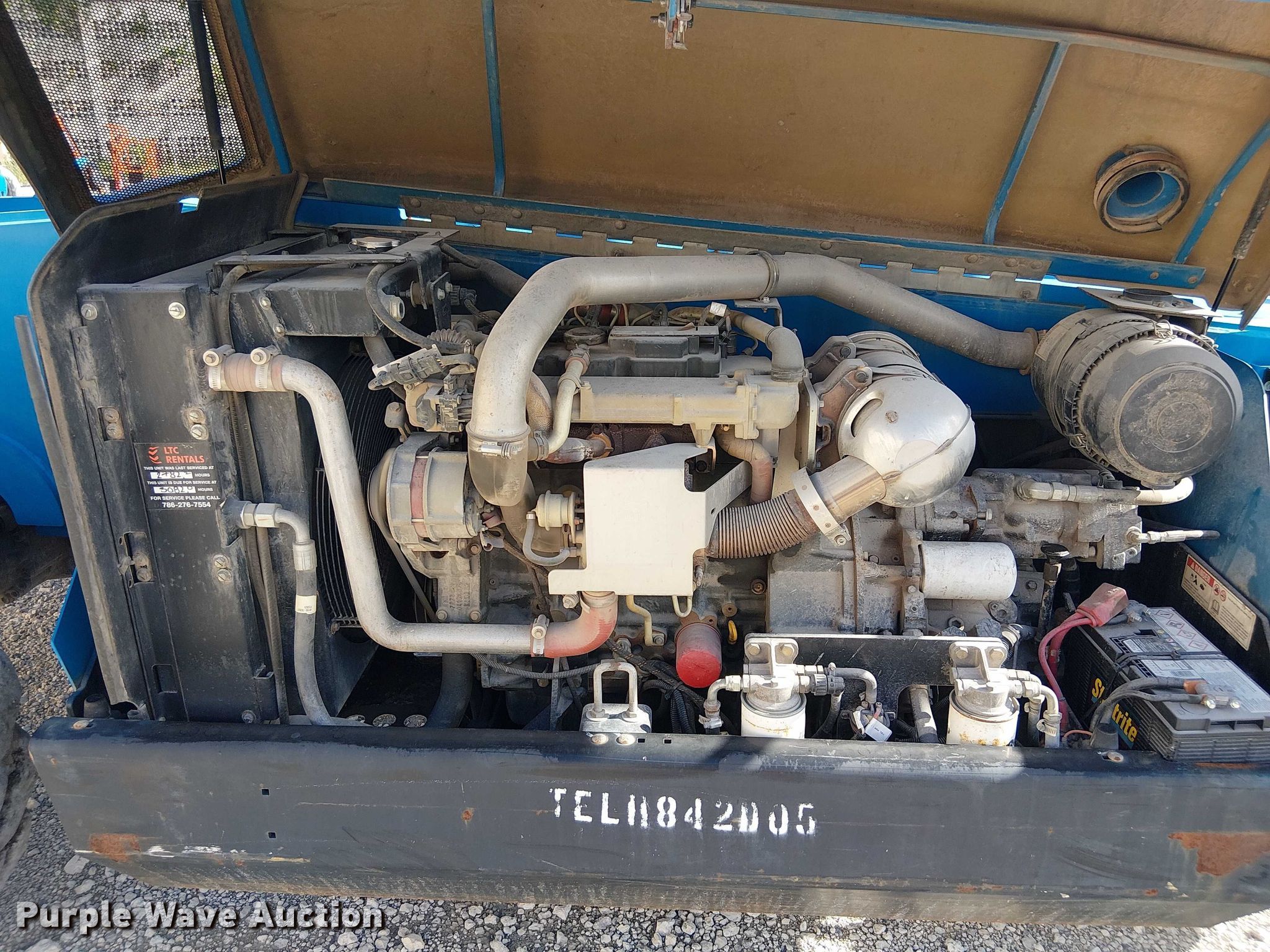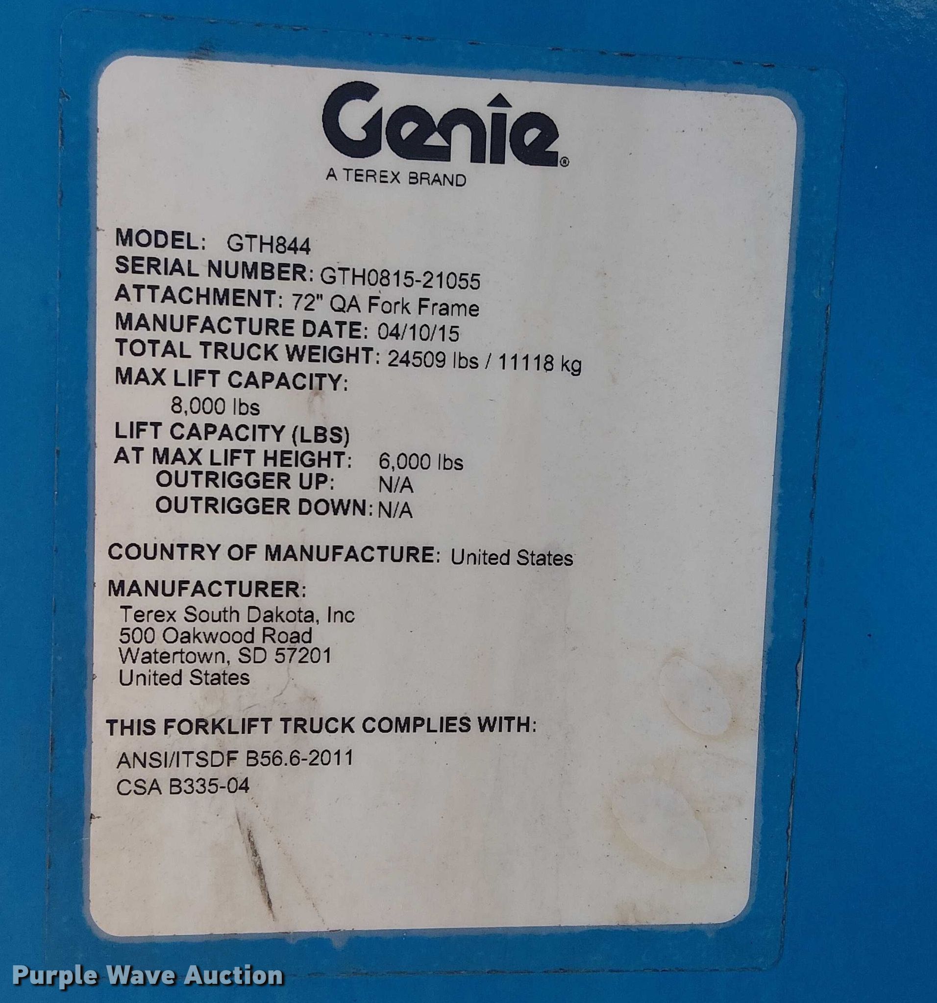 2015 Genie GTH844 telehandler. Hours: 1,040 on meter, Serial: GTH0815-21055, Unit #: TELH842D05. Engine Deutz, Serial: 11625251, Displacement: 3.621L, Cylinders: 4, Fuel type: Diesel. Transmission Powershift, 3F - 3R, Four wheel drive. Operators station Canopy, Steering: Crab, Four wheel. Features Maximum lift capacity: 8,000 lbs, Maximum lift height: 44', Boom stages: 3, Fork length: 48", Tilt carriage, Hydraulic leveling, Quick attach: Manual. Tires Size: 13.00-24TG, Foam filled. Notes Possible front axle issues, noise. LTC Rentals. Miami, FL 33169