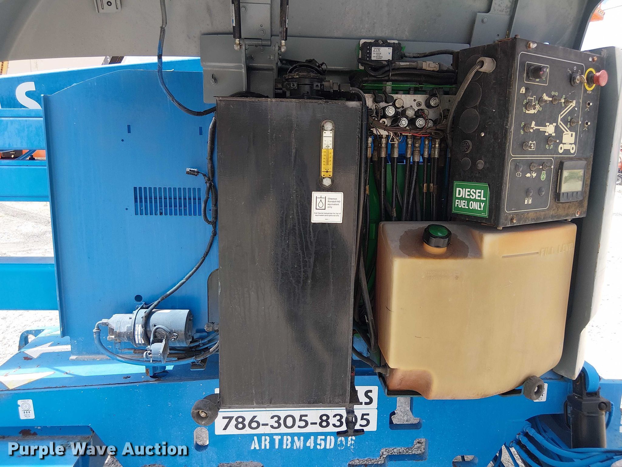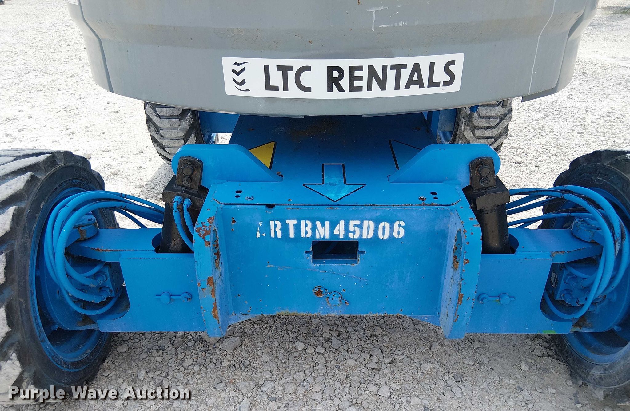2014 Genie Z-45/25J boom lift. Hours: 3,764 on meter, Serial: Z452514A-50375, Unit #: ARTBM45D06. Engine Deutz, Cylinders: 4, Fuel type: Diesel. Chassis Four wheel drive. Features Rough terrain, Boom type: Articulating, Maximum lift capacity: 500 lbs, Maximum reach length: 24' 8", Maximum lift height: 46' 1", Hydraulic extendable jib, Platform: 28" L x 70" W, AC power outlet, Controls: Platform, Ground, Platform rotation: Hydraulic, Safety alarm. Tires Tire size: 315/55D20, Foam filled. LTC Rentals. Miami, FL 33169