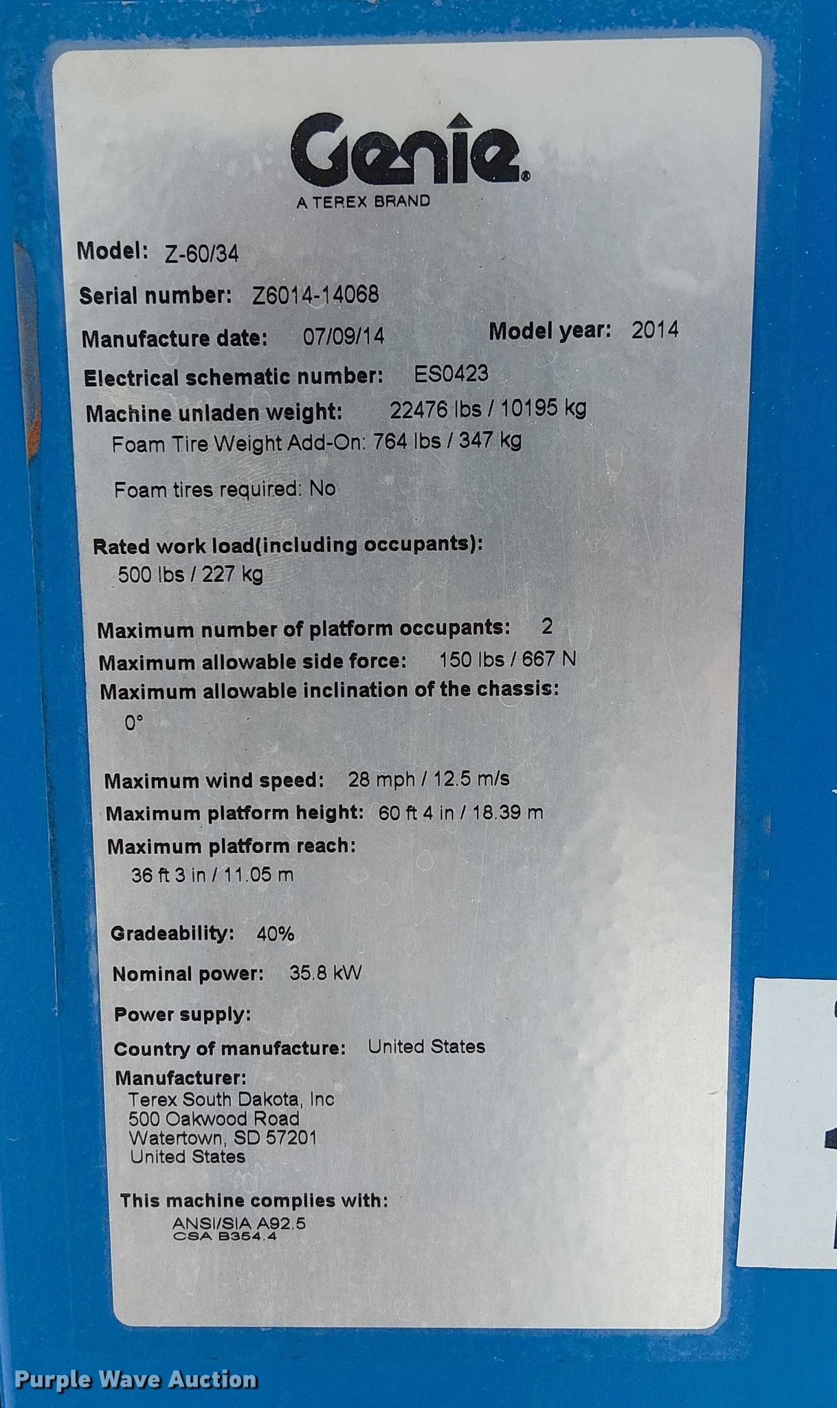 2014 Genie Z-60/34 boom lift | Thursday October 09 Construction Equipment Auction