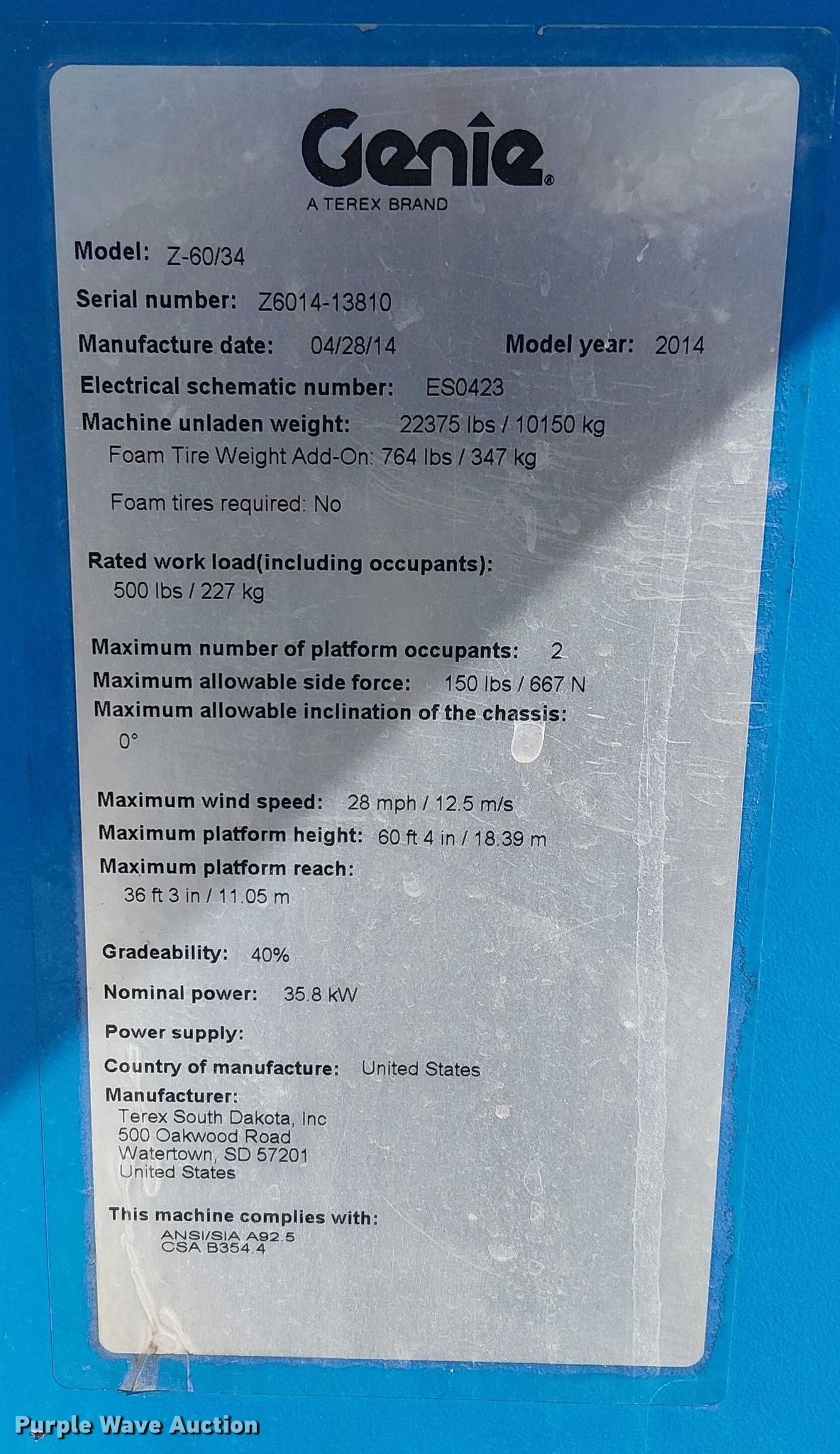 2014 Genie Z-60/34 boom lift | Thursday October 09 Construction Equipment Auction