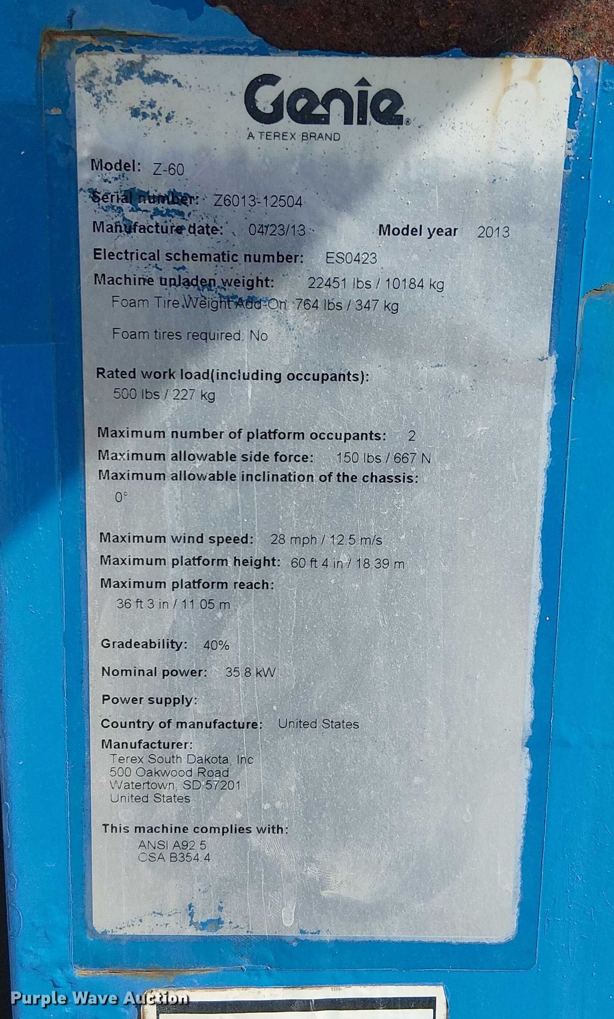 2013 Genie Z-60 boom lift | Thursday October 09 Construction Equipment Auction