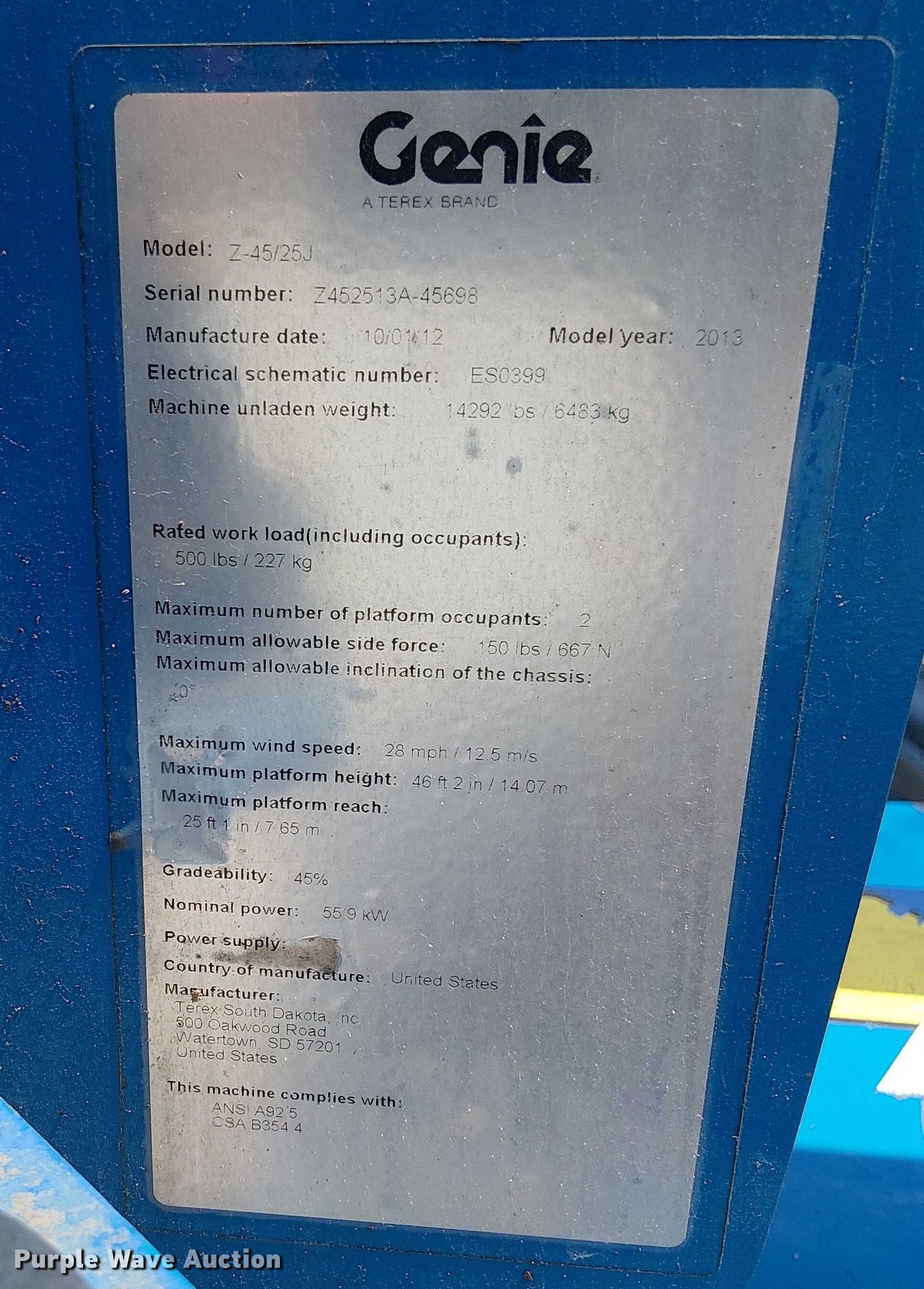 Purple Wave is selling a used Boom Lift in Florida. This item is a 2013 Genie Z-45/25J boom lift with the following: Hours: 2,422 on meter, Serial: Z452513A-45698, Unit #: ARTBM45GI5