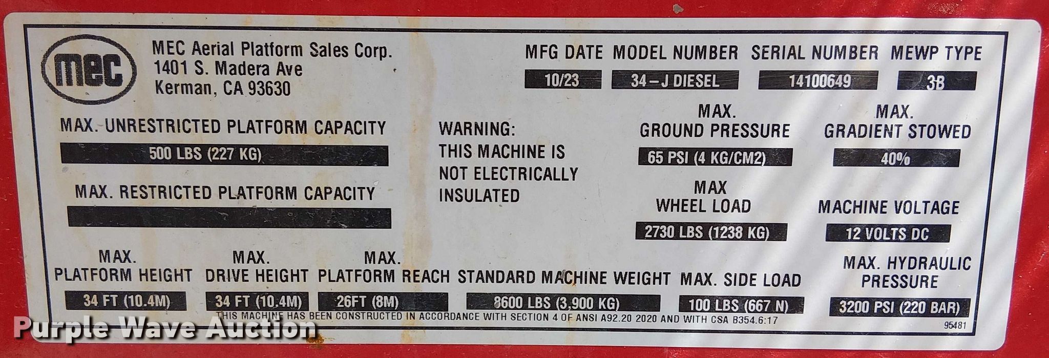 Purple Wave is selling a used Boom Lift in Florida. This item is a 2023 MEC 34-J boom lift with the following: Hours: 496 on meter, Serial: 14100649