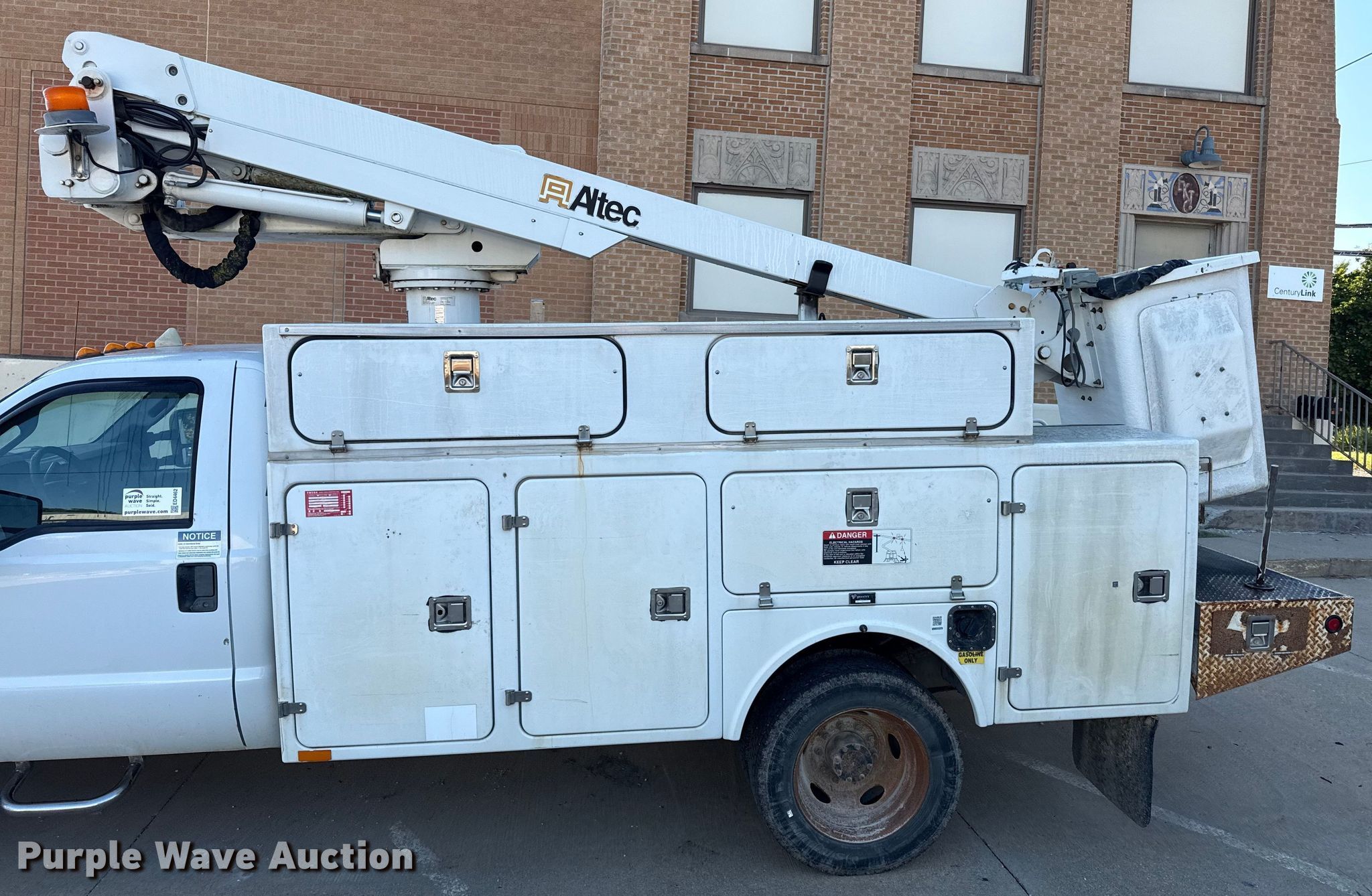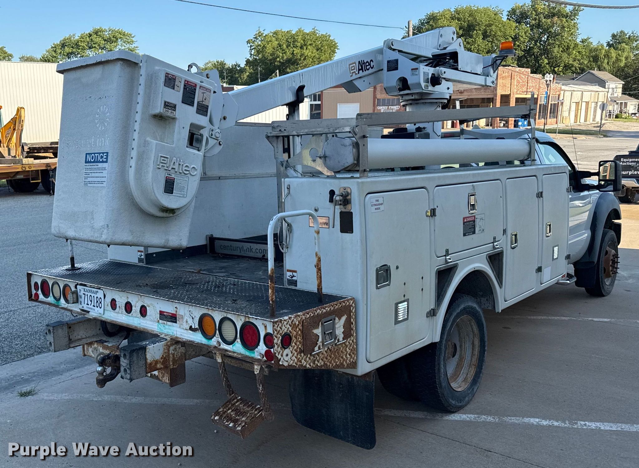 2011 Ford F450 bucket truck. Miles: 152,156 on odometer, VIN: 1FDUF4GY6BEB27095. Engine Displacement: 6.8L V10 DOHC, Cylinders: 10, Fuel type: Gas. Transmission Automatic. Chassis Axles: Single, Suspension: Spring, Brakes: Hydraulic, PTO. Interior AC, Heat, Auxiliary controls, Brake controller. Features Bed Utility bed, Altec, Length: 11', Width: 94", Height: 10' 6", Boom Altec AT235, Maximum lift capacity: 350 lbs, Maximum lift height: 35', Boom type: Articulating, Telescopic, Man basket, Boom controls Ground, Platform/ basket.. Tires Size: 225/75R19.5. Kansas title. Title distribution may be delayed up to 30 days from verification of funds. Brightspeed. Burlington, KS 66839