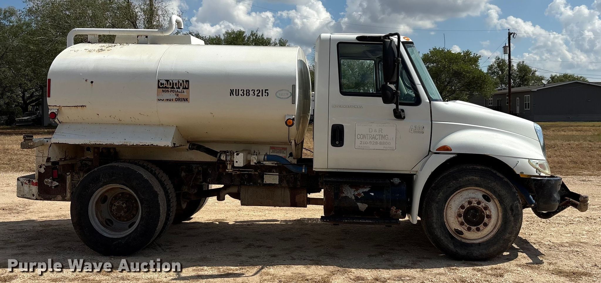 2007 International 4300 water truck. Miles: 181,339 on odometer, Hours: 6,849 on meter, VIN: 1HTMMAAMX7H383215. Engine International DT466, Displacement: 7.64L, Cylinders: 6, Fuel type: Diesel. Transmission Automatic. Chassis Axles: Single, Suspension: Spring, Brakes: Hydraulic, PTO, GVWR: 25,500 lbs. Interior AC, Heat. Features Bed Tank bed, Valew, Length: 9', Width: 8', Spray bar: Front, Rear, Side discharge, Hose reel, Top fill, Rear outlet: 2". Tires Size: 11R22.5, Brand: Goodyear. Notes Dash warning indicator: Brake fluid light, Check AC. Texas title. Title distribution may be delayed up to 14 days from verification of funds. D & R Contracting, LLC Retirement Open Inspection October 6, 2025. 14975 Flatten Road. San Antonio, TX 78223