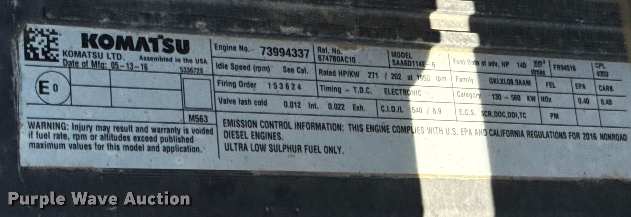 2017 Komatsu PC360LC-11 excavator. Hours: 8,221 on meter, Serial: KMTPC256JGWA35727. Engine Komatsu SAA6D114E-6, Serial: 73994337, Displacement: 8.9L, Cylinders: 6, Fuel type: Diesel, HP: 271, kW: 202. Transmission Hydrostatic, Three speed travel. Operators station Enclosed cab, AC, Heat, Backup camera. Features Counter weights, Boom Standard, Stick Stick length: 10' 6", Bucket Hensley, Width: 60", Teeth: 6. Tracks Width: 33.5", Grouser pads: Triple. Notes Warning indicator: Exhaust temp.. Summit Equipment Company Inc. Houston, TX 77066