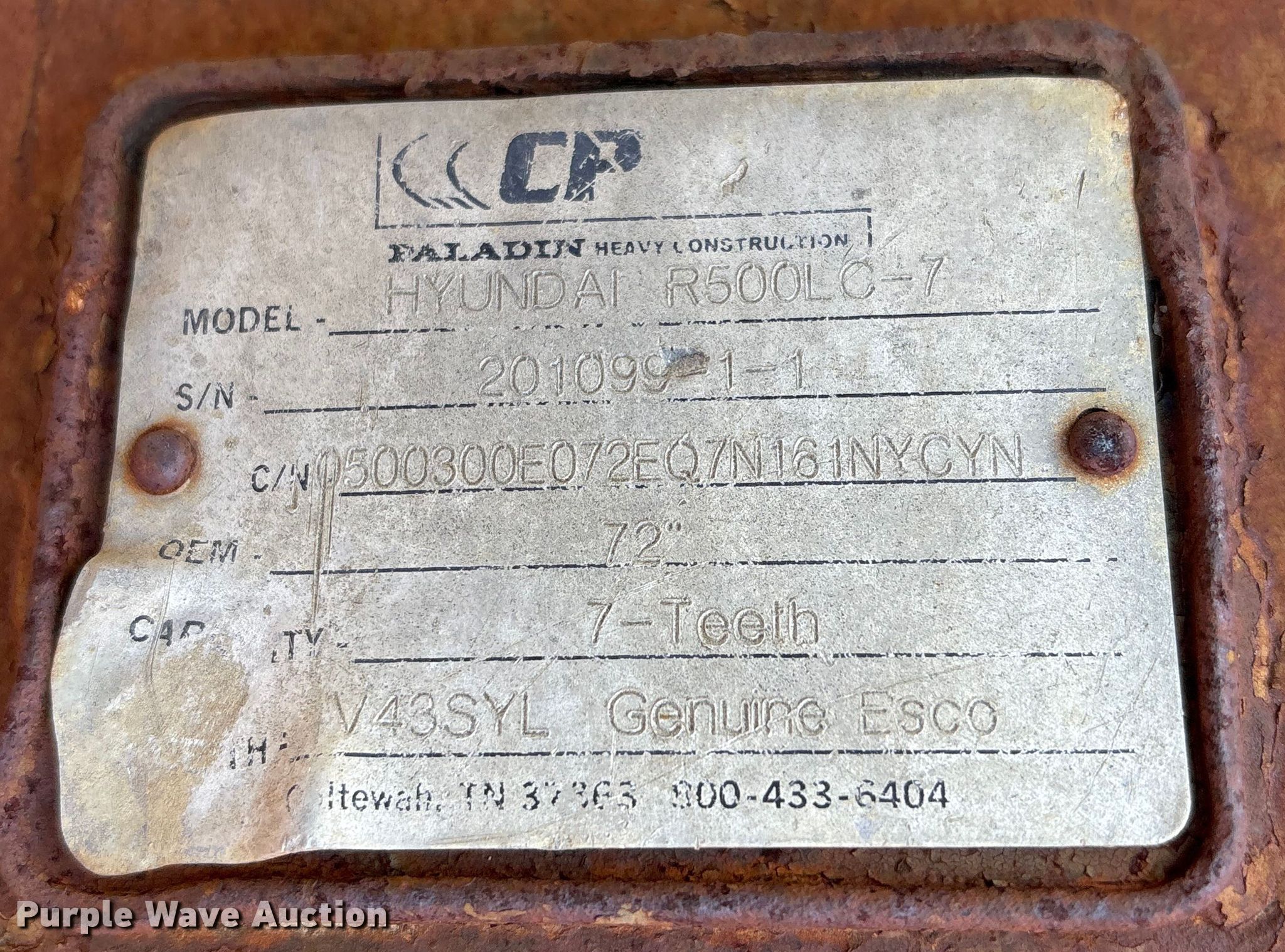 2007 Hyundai Robex 500LC-7A excavator. Hours: 3,396 on meter, Serial: NB0610052. Engine Cummins QSM11, Serial: 35185122, Displacement: 10.8L, Cylinders: 6, Fuel type: Diesel, HP: 335, kW: 250. Transmission Hydrostatic. Operators station Enclosed cab, AC, Heat. Features Counter weights, Boom Standard, Bucket Hyundai R500LC-7, Width: 72", Teeth: 7. Tracks Width: 31.5", Steel, Grouser pads: Triple. Notes Batteries disconnected, Key not included, Possible engine issues, turns over but will not start , Unknown operating condition. Conroe, TX 77385