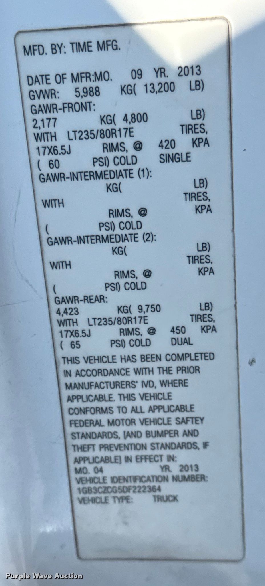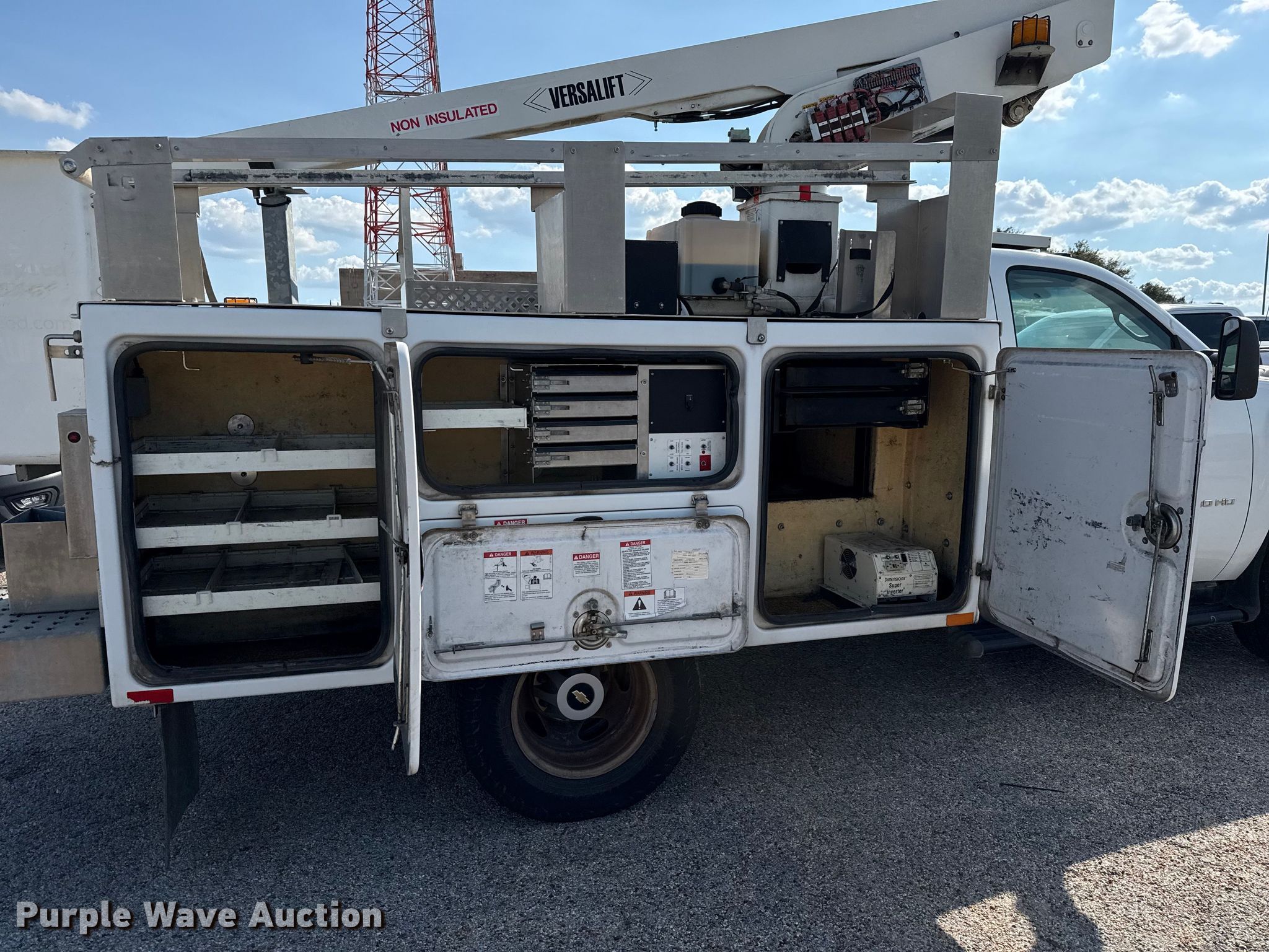 2013 Chevrolet Silverado 3500 HD bucket truck. Miles: 172,748 on odometer, VIN: 1GB3CZCG5DF222364, Unit #: 2233018. Engine Displacement: 6.0L, Cylinders: 8, Fuel type: Gas. Transmission Automatic. Chassis Axles: Single, Suspension: Spring, Brakes: Hydraulic, Wet kit, GVWR: 13,200 lbs. Interior AC, Heat, Cruise control, Auxiliary controls, Brake controller. Features Bed Utility bed, BrandFX, Serial: 13 41925, Length: 9', Width: 94", Boom Time Mfg. Versalift, Serial: AG130562, Boom type: Telescopic, Man basket, Boom controls Ground, Platform/ basket, Certification valid through: 09/2026. Tires Size: 235/80R17. Notes Non-operational climate control blower, Door panel parts missing, Jump start required during on-site data collection. Texas title. Title distribution may be delayed up to 14 days from verification of funds. Brightspeed. Killeen, TX 76543