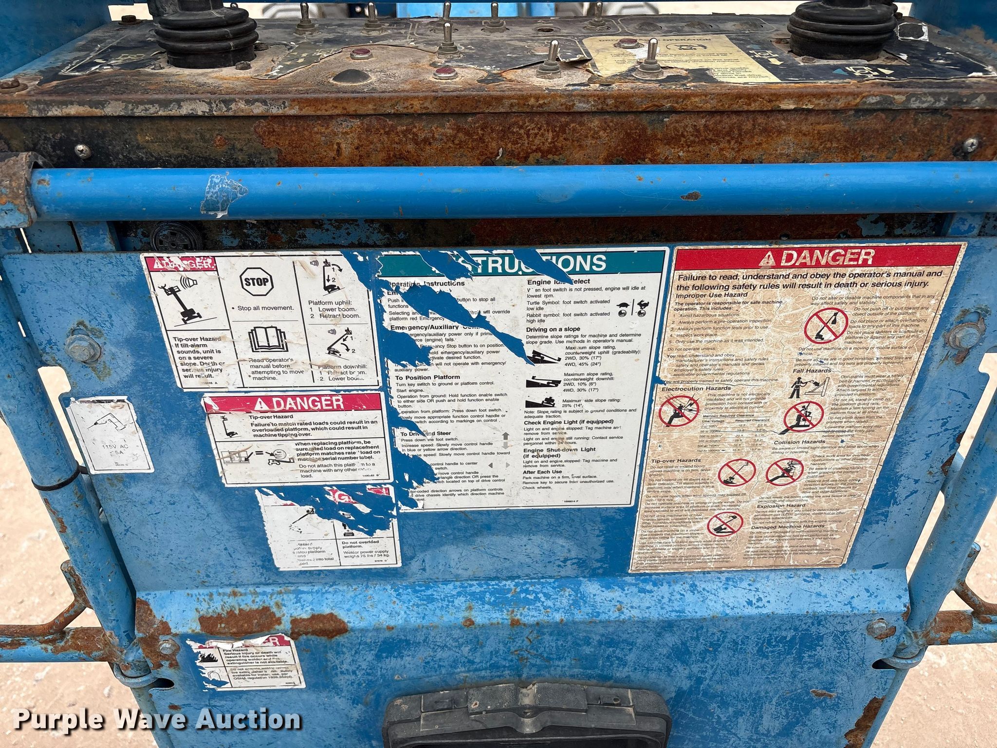 2014 Genie S-65 boom lift. Hours: 3,607 on meter, Serial: S6014A-29092, Unit #: ML9092. Engine Perkins, Cylinders: 4, Fuel type: Diesel, HP: 45. Chassis Four wheel drive. Features Rough terrain, Boom type: Telescopic, Maximum lift capacity: 500 lbs, Maximum reach length: 56' 2", Maximum lift height: 65', Platform: 96" L x 36" W, AC power outlet, Controls: Platform, Ground, Platform rotation: Hydraulic. Tires Tire size: 355/55D625, Foam filled. This is worksite support equipment and will not come with a title. Transfer of ownership documentation will be a bill of sale. Advanced Equipment Rental. Midland, TX 79706