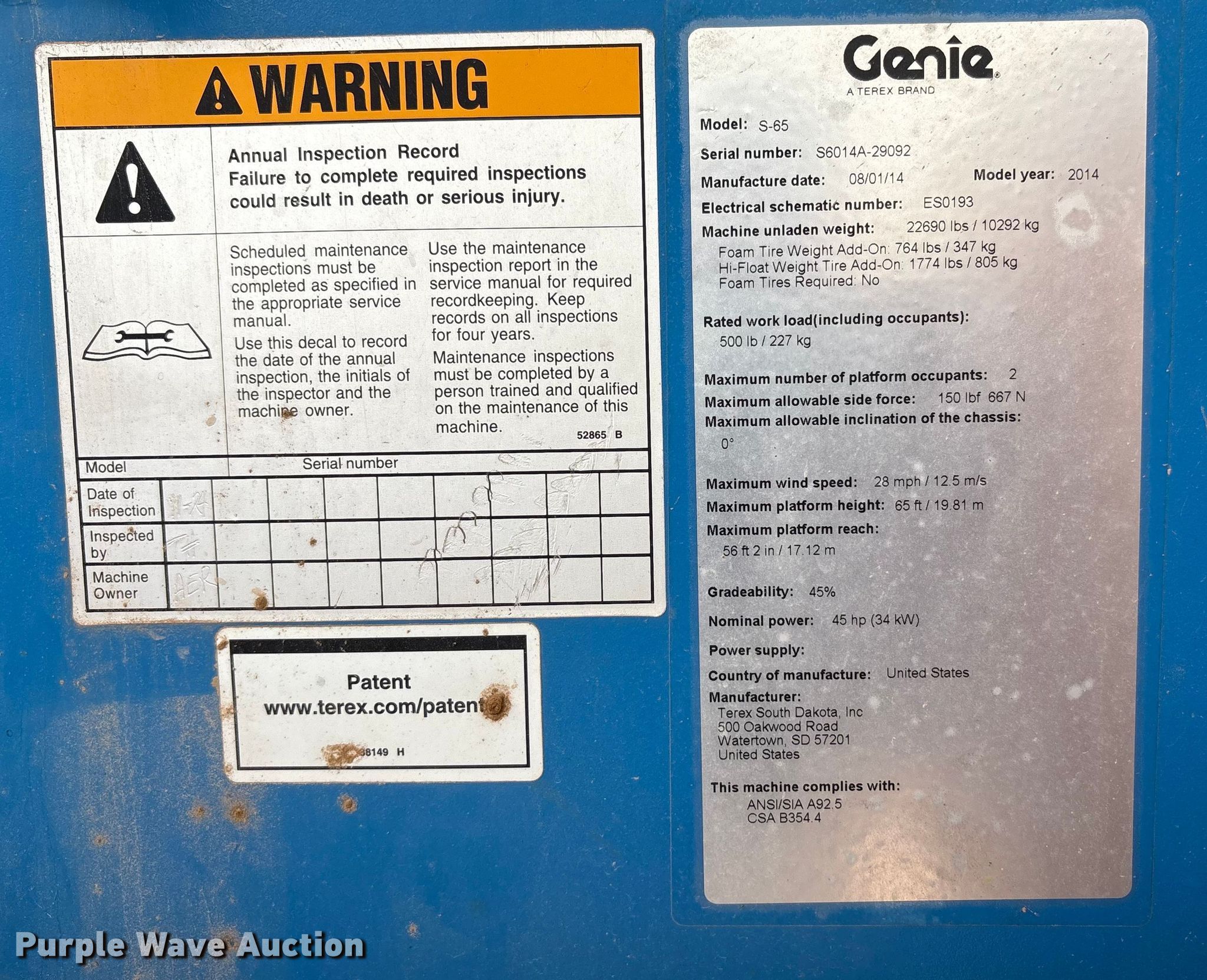 2014 Genie S-65 boom lift | Thursday October 09 Construction Equipment Auction