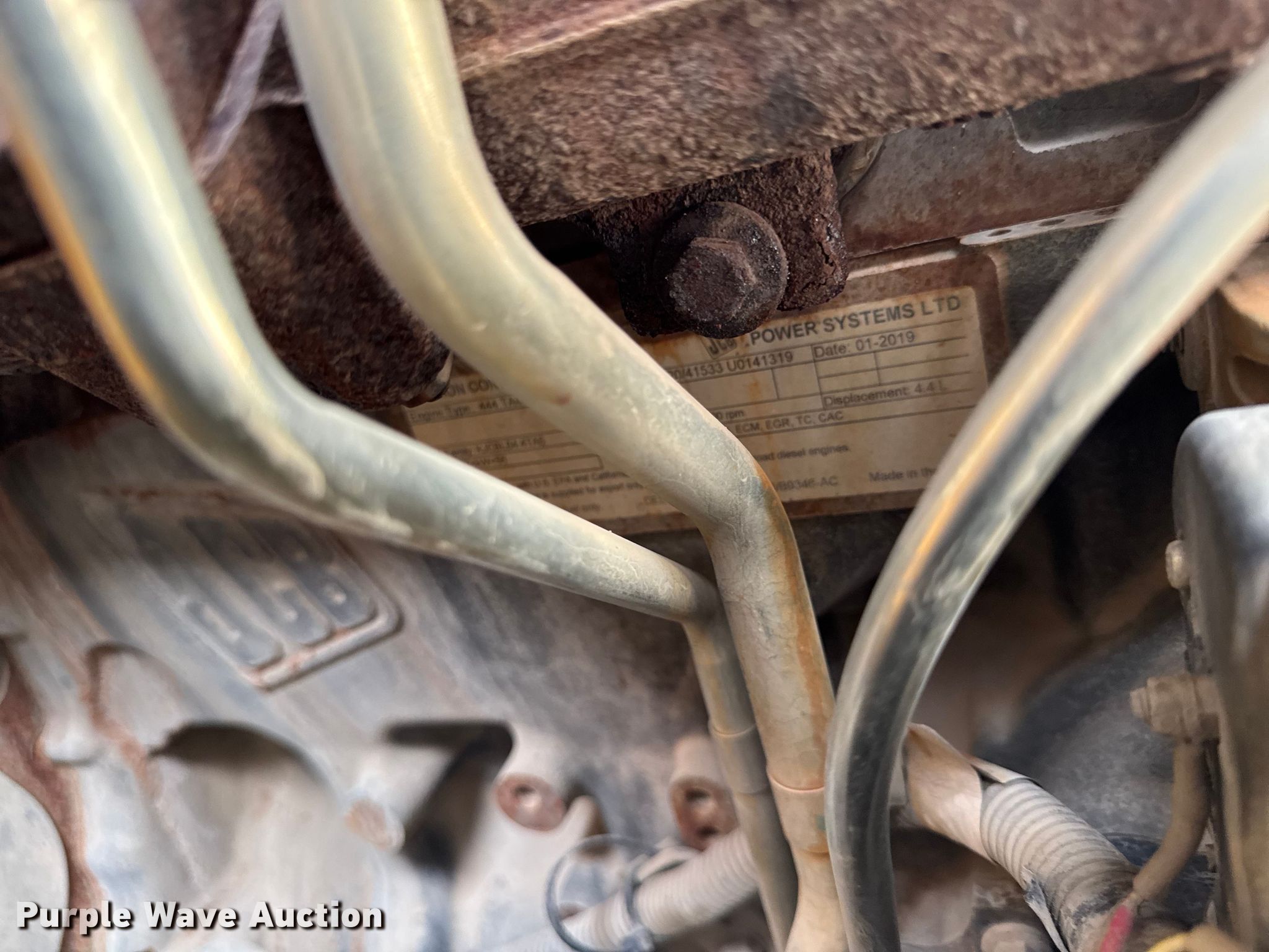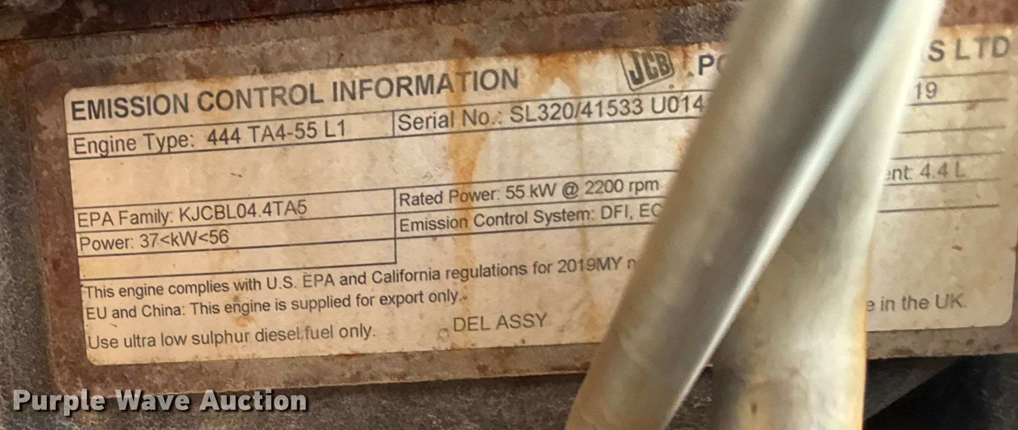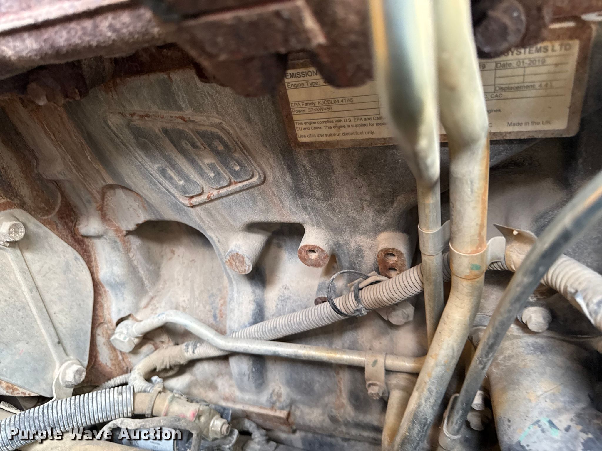 2019 JCB 510-56 telehandler. Hours: 5,880 on meter, Serial: JCB5CG7GVK2794234. Engine JCB 444 TA4-55 L1, Serial: SL320/41533U0141319, Displacement: 4.4L, Cylinders: 4, Fuel type: Diesel. Transmission Powershift, 4F - 4R, Four wheel drive. Operators station OROPS, Steering: Crab, Four wheel. Features Maximum lift capacity: 10,000 lbs, Maximum lift height: 56', Boom stages: 4, Fork length: 60", Auxiliary hydraulics, Hydraulic outriggers, Hydraulic leveling, Quick attach: Manual. Tires Size: 17.5-25. Notes Warning indicator: P0523-24, Possible engine issues, smokes. Rosales Masonry. Ankeny, IA 50023