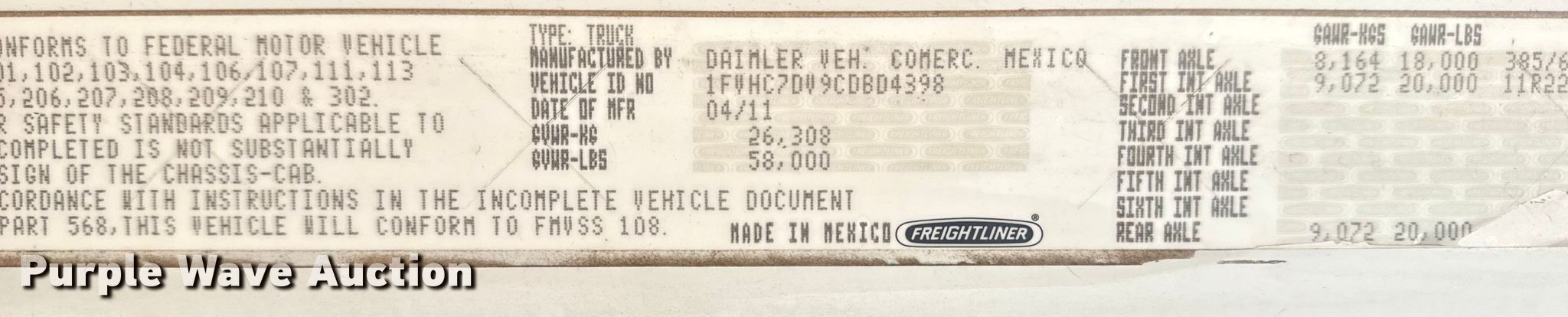 Purple Wave is selling a used Crane Truck in Oklahoma. This item is a 2012 Freightliner Business Class M2 crane truck with the following: Miles: Unknown, VIN: 1FVHC7DV9CDBD4398