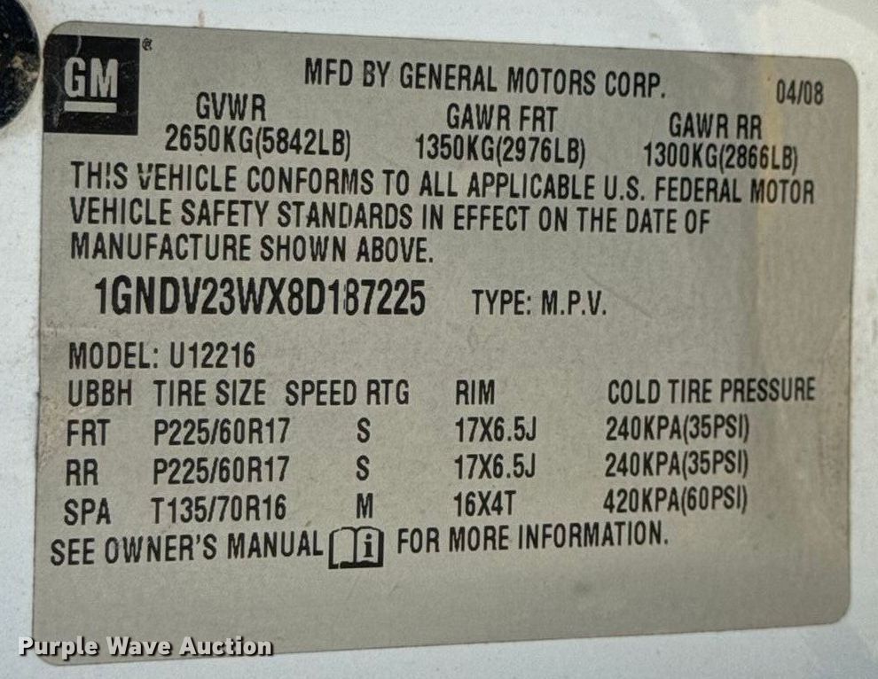 Purple Wave is selling a used Passenger Vehicle in Missouri. This item is a 2008 Chevrolet Uplander van with the following: Miles: 192,293 on odometer, VIN: 1GNDV23WX8D187225