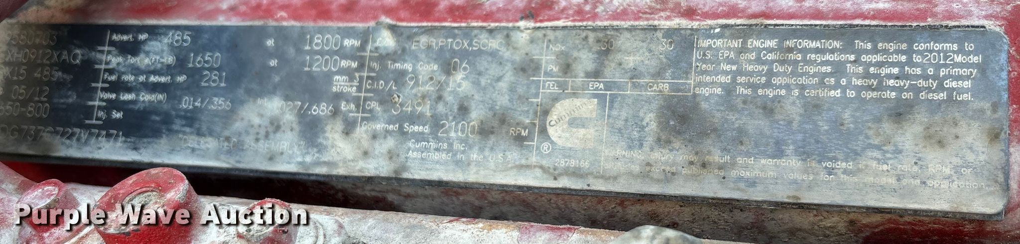 2012 Peterbilt 388 dump truck. Miles: 350,403 on odometer, Hours: 20,306 on meter, VIN: 1XPWD49X3DD194560. Engine Cummins ISX15, Serial: 79580703, Displacement: 15.0L, Cylinders: 6, Fuel type: Diesel, HP: 405, Engine brake. Transmission Eaton Fuller RTLO-16913A, Manual, Speed: 13. Chassis Axles: Tandem, Differential lock: Inter-axle, Suspension: Air, Brakes: Air, PTO, GVWR: 52,000 lbs FAWR: 12,000 lbs, RAWR: 40,000 lbs, Wheelbase: 214". Interior AC, Heat, Cruise control. Features Bed Dump bed, Hilbilt, Serial: 63140107731018, Length: 16', Width: 8', Capacity: 16 cu.yd., Side height: 48", Bed type: Steel, Roll tarp, Ram: Single, End gate: Air operated. Tires Size: 11R24.5, Brand: Blackhawk/Michelin. Notes Dash warning indicator: Check engine, Windshield chipped or cracked. Oklahoma title. Seller is a government entity who will be assigning and distributing the title. Please contact the seller for distribution questions. Pontotoc County District 3. Stonewall, OK 74871