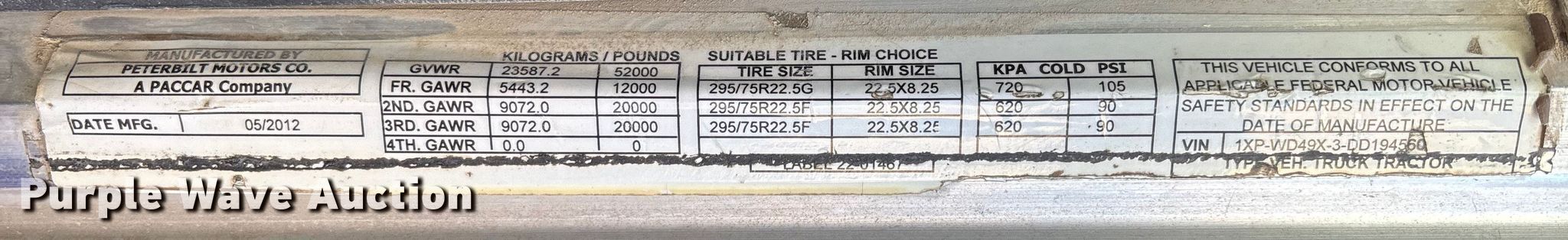Purple Wave is selling a used Construction Dump Truck in Oklahoma. This item is a 2012 Peterbilt 388 dump truck with the following: Miles: 350,403 on odometer, Hours: 20,306 on meter, VIN: 1XPWD49X3DD194560