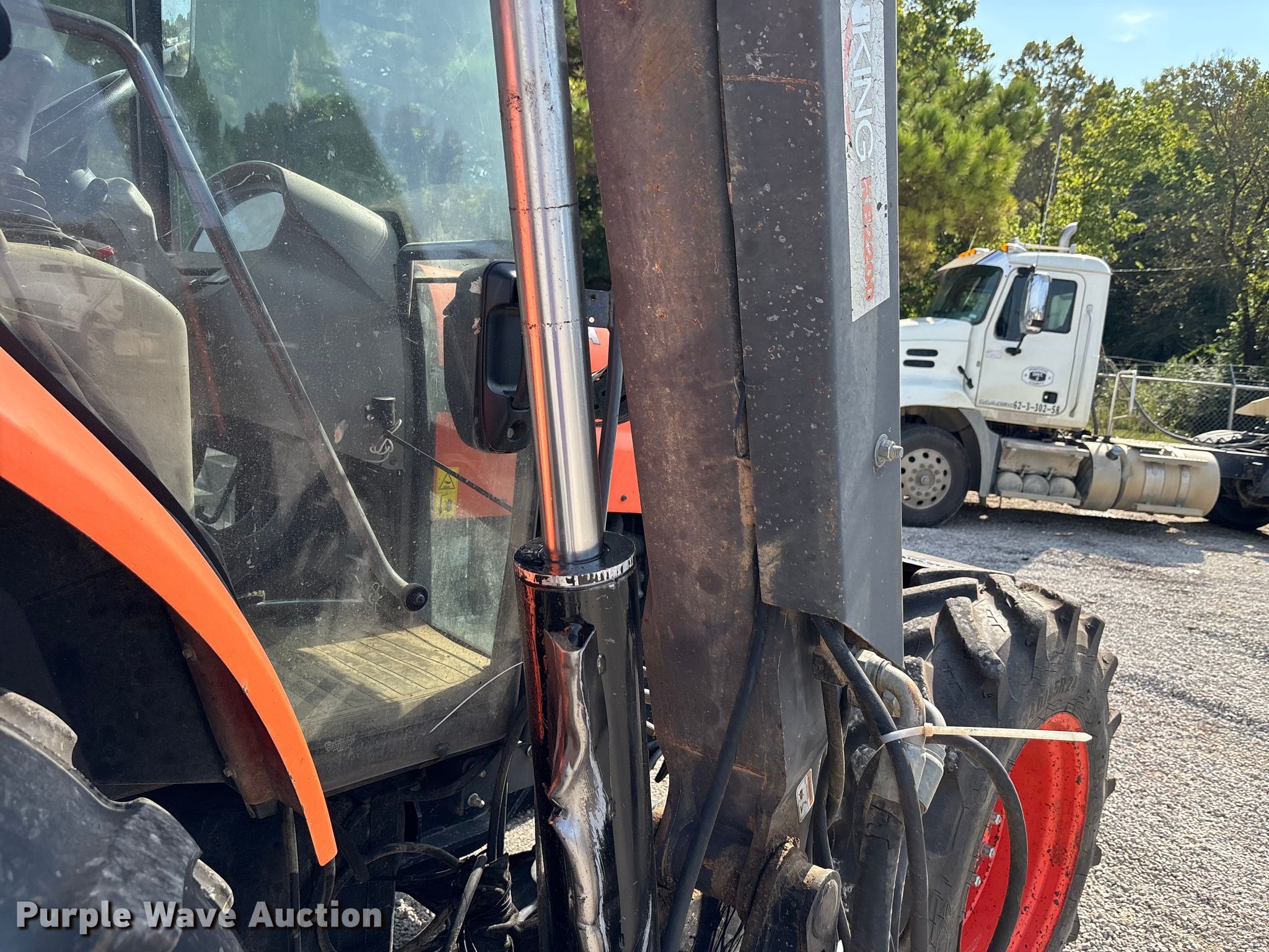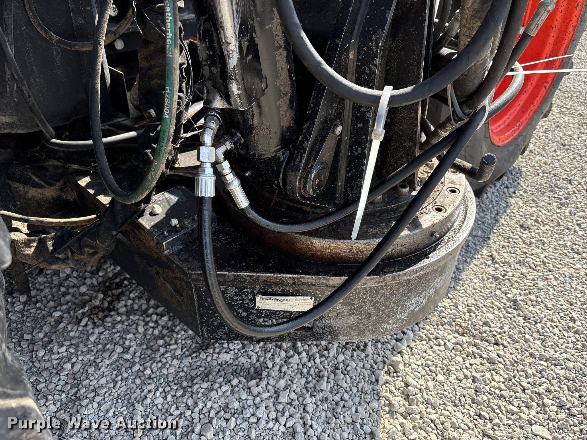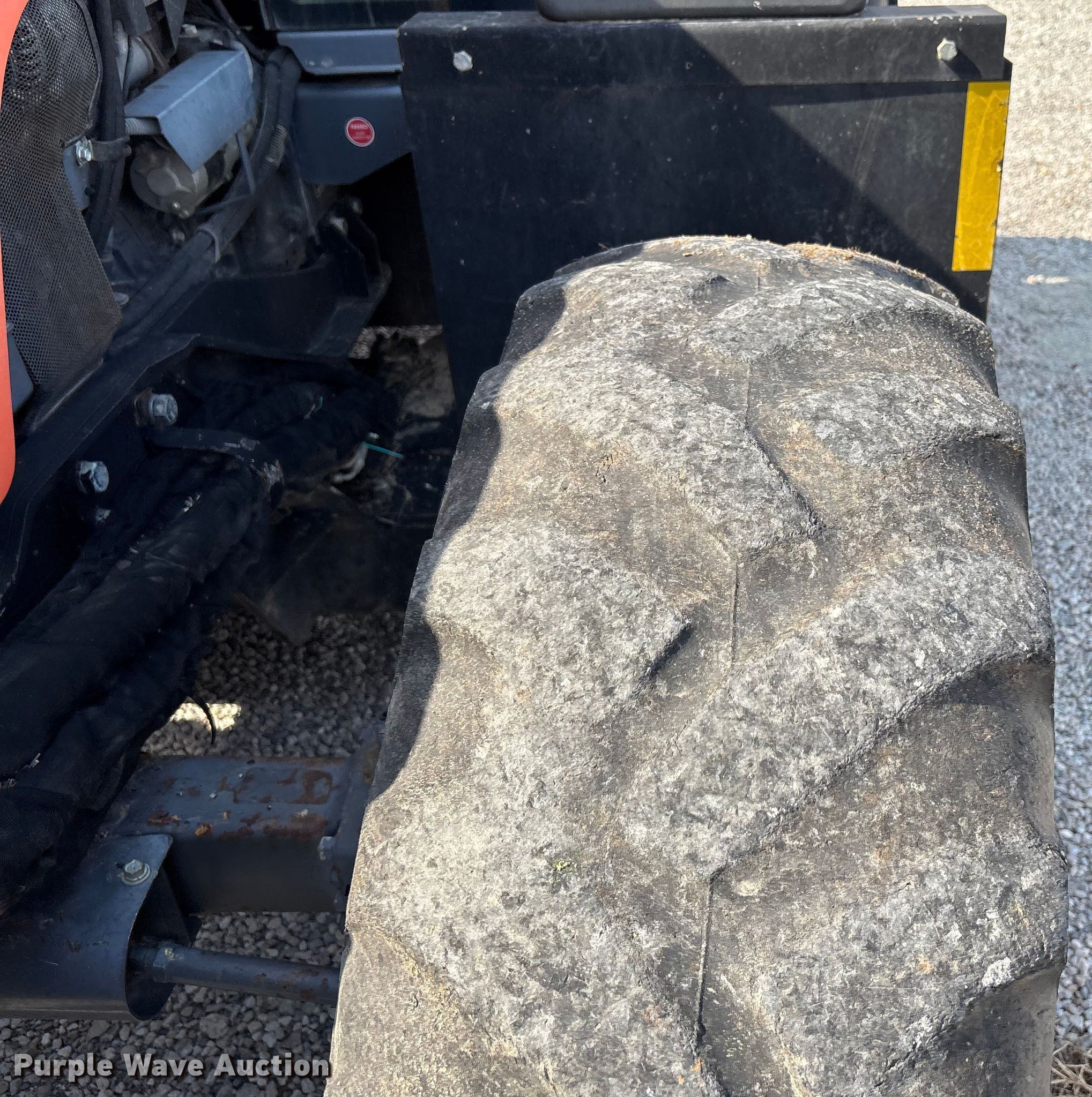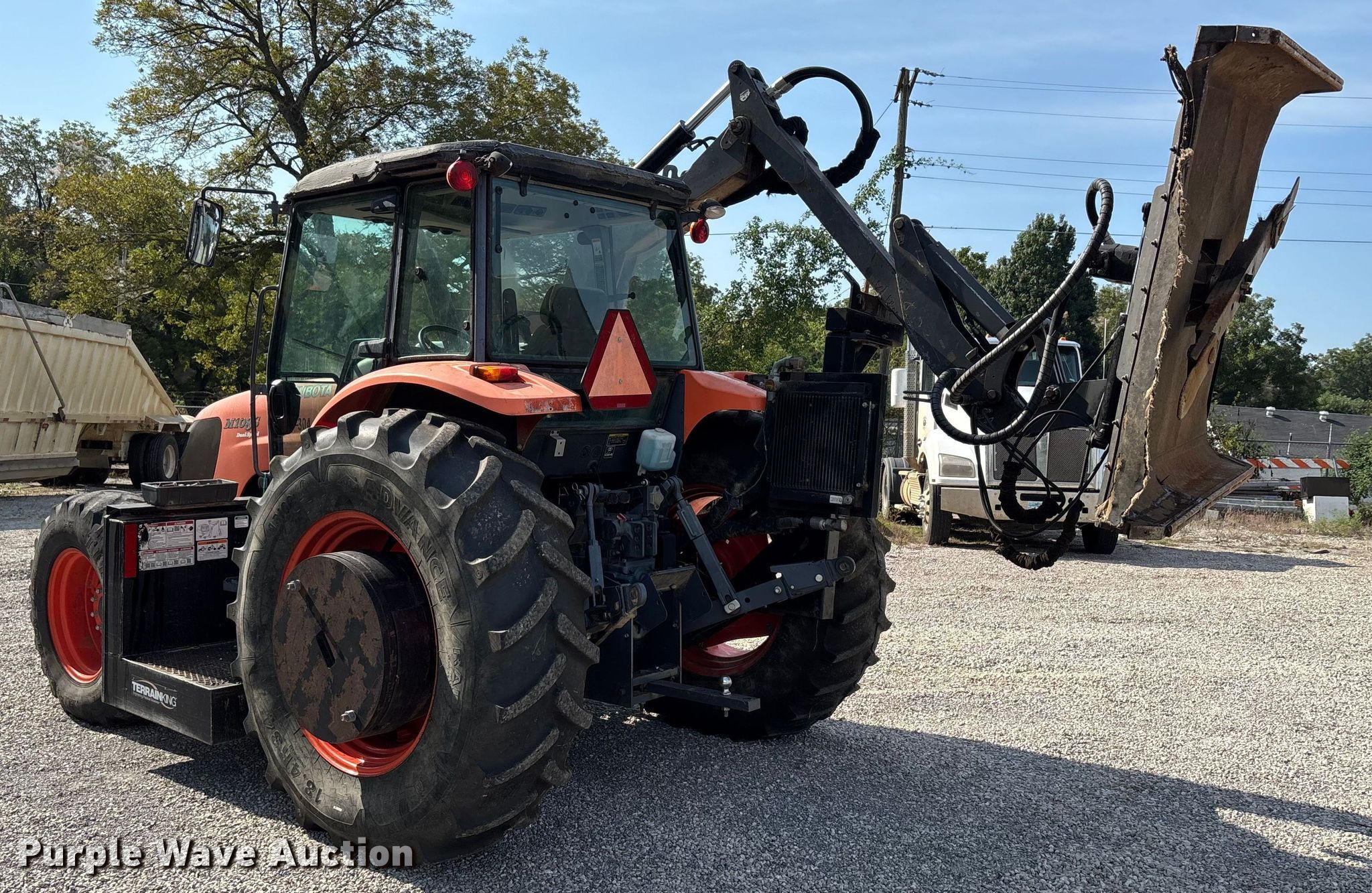 Kubota M108S MFWD tractor. Hours: 2,903 on meter. Engine Kubota V3800-di-ti-et01, Displacement: 3.8L, Cylinders: 4, Fuel type: Diesel. Transmission Synchro, 24F - 24R, Left hand reverser, Differential lock. Operators station AC, Heat. Features PTO: 540, Three point, Seven pin outlet, Hydraulic remote sets Rear: 1, Terrain King KB2200 side boom mower Serial: 1330-119, Width: 60", KBSB circular saw cutter Serial: 1047102, Width: 90". Tires Front: 13.6R24, Rear: 18.4R34, Wheel weights: 1, Wheelbase: 96". Notes Roof panel missing, Exhaust issues, bent, Hydraulic boom cylinder seal issues, leaks. Pontotoc County District 3. Stonewall, OK 74871