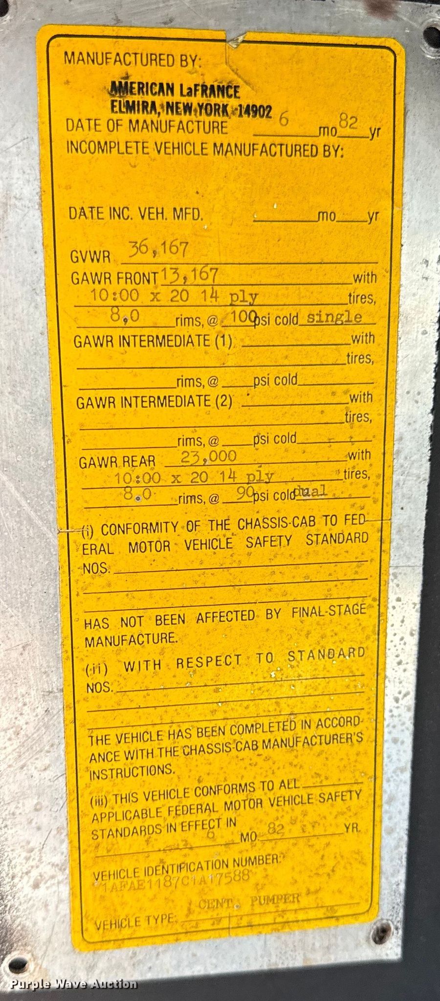 Purple Wave is selling a used Fire Truck or Emergency Vehicle in Kansas. This item is a 1982 American LaFrance pumper fire truck with the following: Miles: 13,900 on odometer, Hours: 2,711 on meter, VIN: 1AFAE1187C1A17588