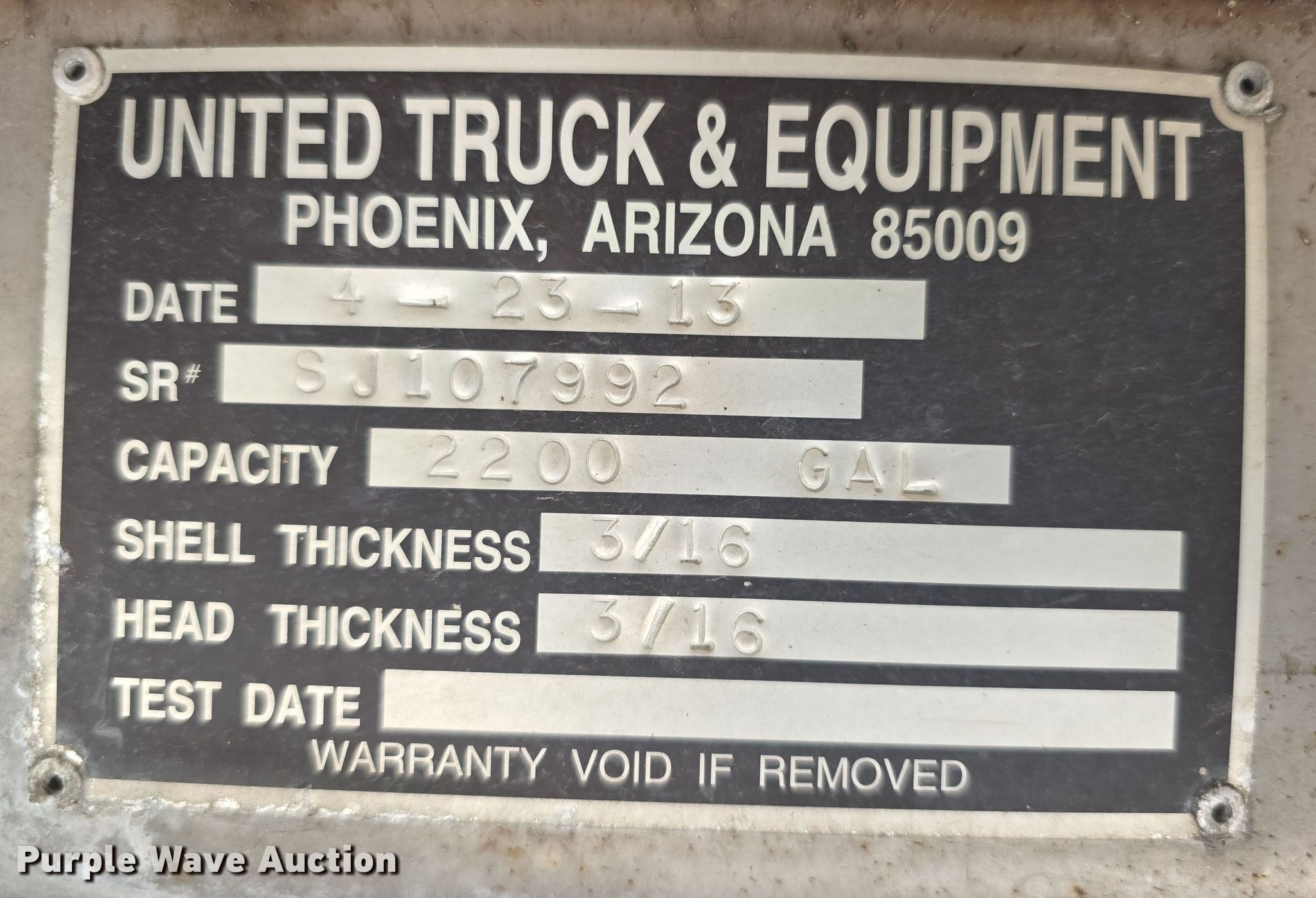 2014 International 7300 tank truck. Miles: 28,391 on odometer, Hours: 8,620 on meter, VIN: 1HTWAAAR1EH769242. Engine International DT466, Displacement: 7.6L, Cylinders: 6, Fuel type: Diesel. Transmission Allison, Automatic. Chassis Axles: Single, Suspension: Spring, Brakes: Air, PTO, GVWR: 36,220 lbs, Wheelbase: 160". Interior AC, Heat, Heated mirrors, Power windows, Power locks, Cruise control. Features Bed Tank bed, 2013 United, Serial: SJ107992, Length: 10', Width: 8', Capacity: 2,200 gallons, Spray bar: Front, Top fill, Rear drain: 2". Tires Size: 11R22.5, Brand: AmeriSteel. Notes Non-operational engine, no compression Engine cranks but does not start, Unit must be towed or hauled , Non-operational unit. Kansas title. Title distribution may be delayed up to 14 days from verification of funds. City of Merriam. Merriam, KS 66203
