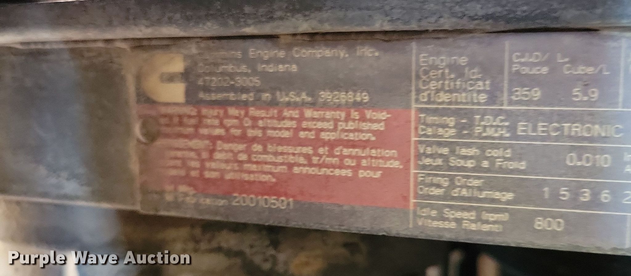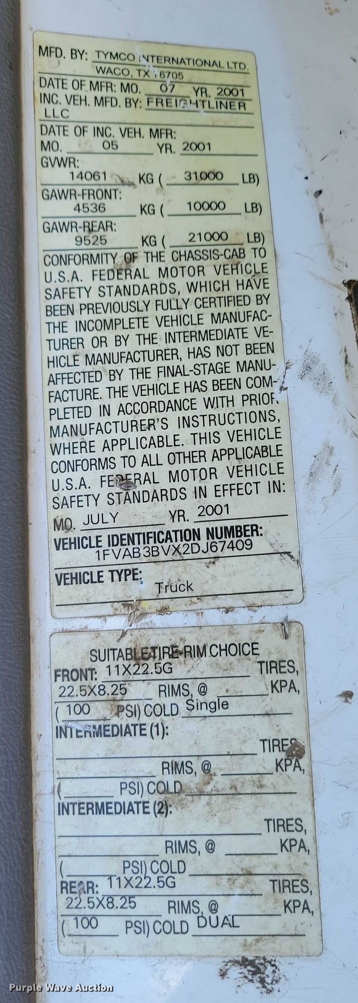 2002 Freightliner FC70 street sweeper truck. Miles: 45,525 on odometer, Hours: 4,096 on meter, VIN: 1FVAB3BVX2DJ67409. Engine Cummins ISB, Displacement: 5.9L, Cylinders: 6, Fuel type: Diesel, HP: 205. Transmission Automatic. Chassis Suspension: Spring, Brakes: Air, GVWR: 31,000 lbs. Operators station AC, Heat, Dual operating station. Features Bed Sweeper bed, Tymco 600 Air Sweeper, Serial: 200107SNP67052BAH, Length: 10', Width: 88", Sweeper bed type: Vacuum, Broom Width: 88", Right gutter broom Diameter: 36", Water spray system, Engine John Deere, Cylinders: 4. Tires Size: 11R22.5. Notes Cab jack handle missing, Dash warning indicator: Check engine. Minnesota title. Seller is a government entity who will be assigning and distributing the title. Please contact the seller for distribution questions. Title distribution may be delayed up to 14 days from verification of funds. City of Jackson, MN. Jackson, MN 56143