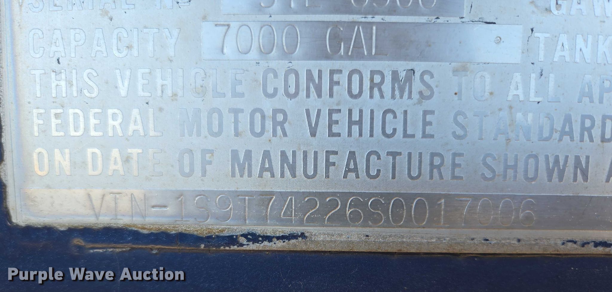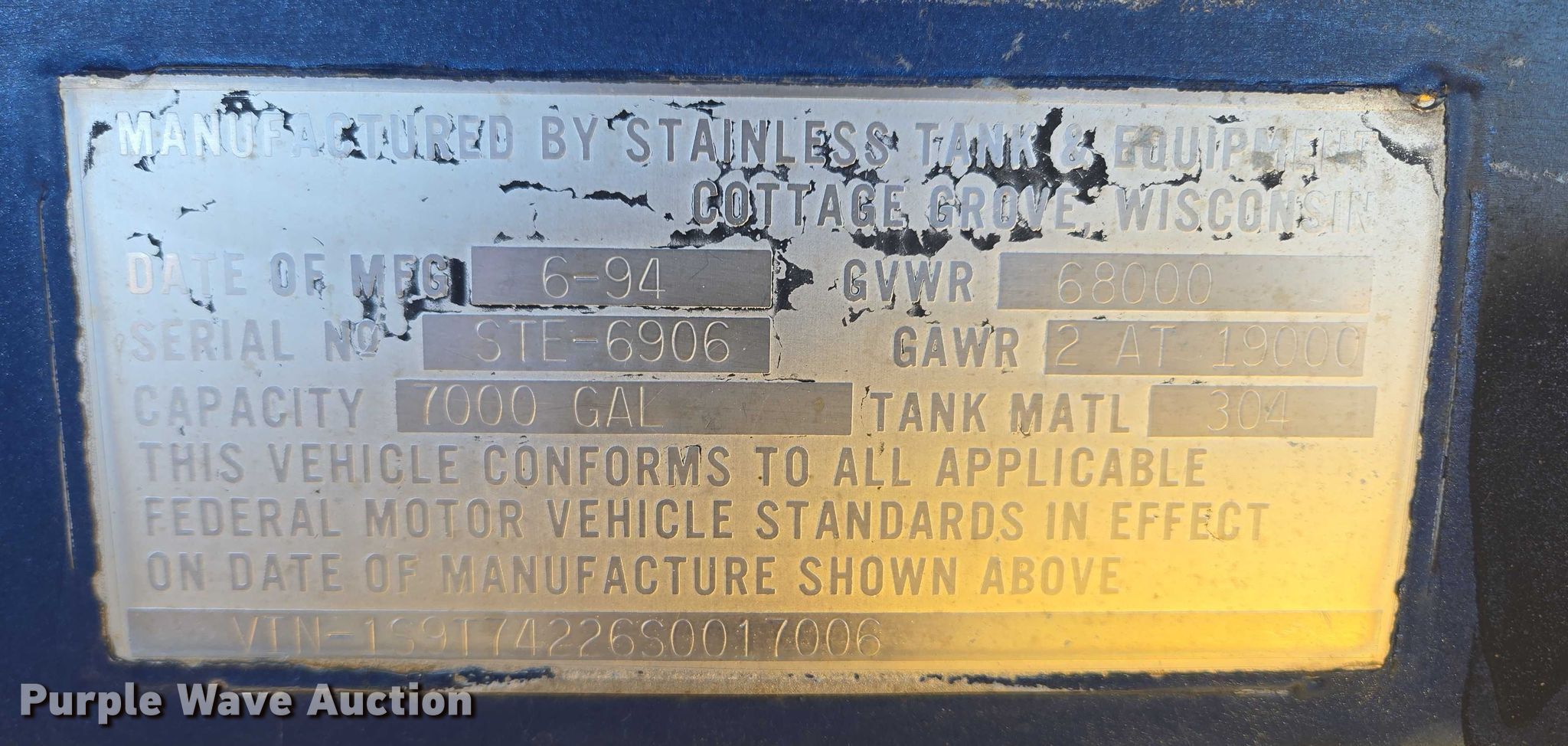 1995 Stainless Tank and Equipment tank trailer. VIN: 1S9T74226S0017006, Unit #: HG306. Dimensions Overall Length: 42' 6", Width: 96". Features Tank type: Stainless steel Capacity: 7,000 gallons, Baffles: 2, Outlet valves: 2 Size: 4", No. of manways/manholes: 1 Width: 20". Chassis Landing gear: Dual, Suspension: Air, Brakes: Air, Axles: Tandem, GVWR: 68,000 lbs, GAWR: 19,000 lbs. Tires Steel wheels, Size: 285/75R24.5. Notes Trailer arm broken , Unit must be towed or hauled , Non-operational unit. South Dakota title. Title distribution may be delayed up to 14 days from verification of funds. State of South Dakota Bureau of Administration. Sioux Falls, SD 57107