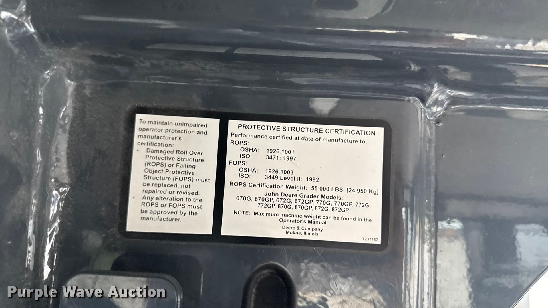 Purple Wave is selling a used Motor Grader in Iowa. This item is a 2012 John Deere 772GP motor grader with the following: Hours: 13,160 on meter, Serial: 1DW772GPLCE648016