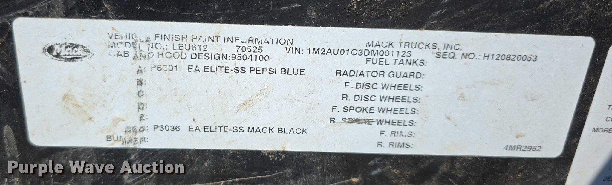 2013 Mack LEU612 refuse truck. Miles: 78,110 on odometer, Hours: 10,718 on meter, VIN: 1M2AU01C3DM001123, Unit #: 61900. Engine Cummins MP7, Displacement: 10.8L, Cylinders: 6, Fuel type: Diesel. Transmission Automatic. Chassis Axles: Single, Suspension: Spring, Brakes: Air, PTO, GVWR: 41,180 lbs, Wheelbase: 170". Interior AC, Heat, Heated mirrors, Cruise control, Backup camera. Features Refuse bed New Way 20RLC, Serial: 11163C1212, Load: Rear, Cart tipper. Tires Front: 315 80r22.5, Rear: 11r22.5, Brand: Michelin and Goodyr. Notes Hydraulic leak, Windshield chipped or cracked, Jump start required during on-site data collection. Kansas title. Title distribution may be delayed up to 14 days from verification of funds. City of Olathe. Olathe, KS 66061