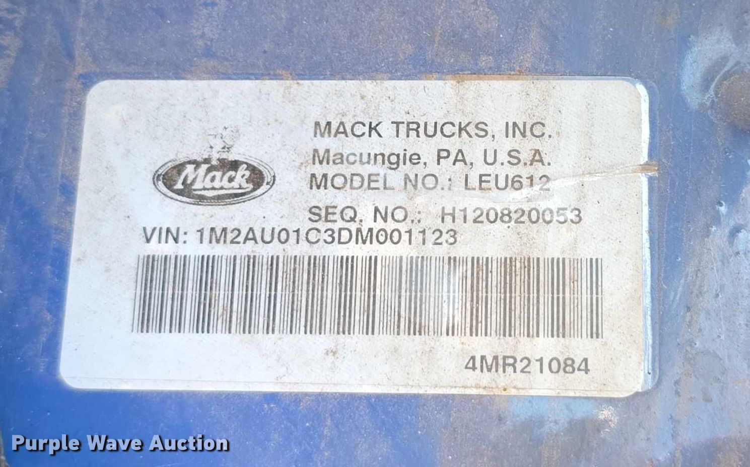 Purple Wave is selling a used Refuse Truck in Kansas. This item is a 2013 Mack LEU612 refuse truck with the following: Miles: 78,110 on odometer, Hours: 10,718 on meter, VIN: 1M2AU01C3DM001123, Unit #: 61900