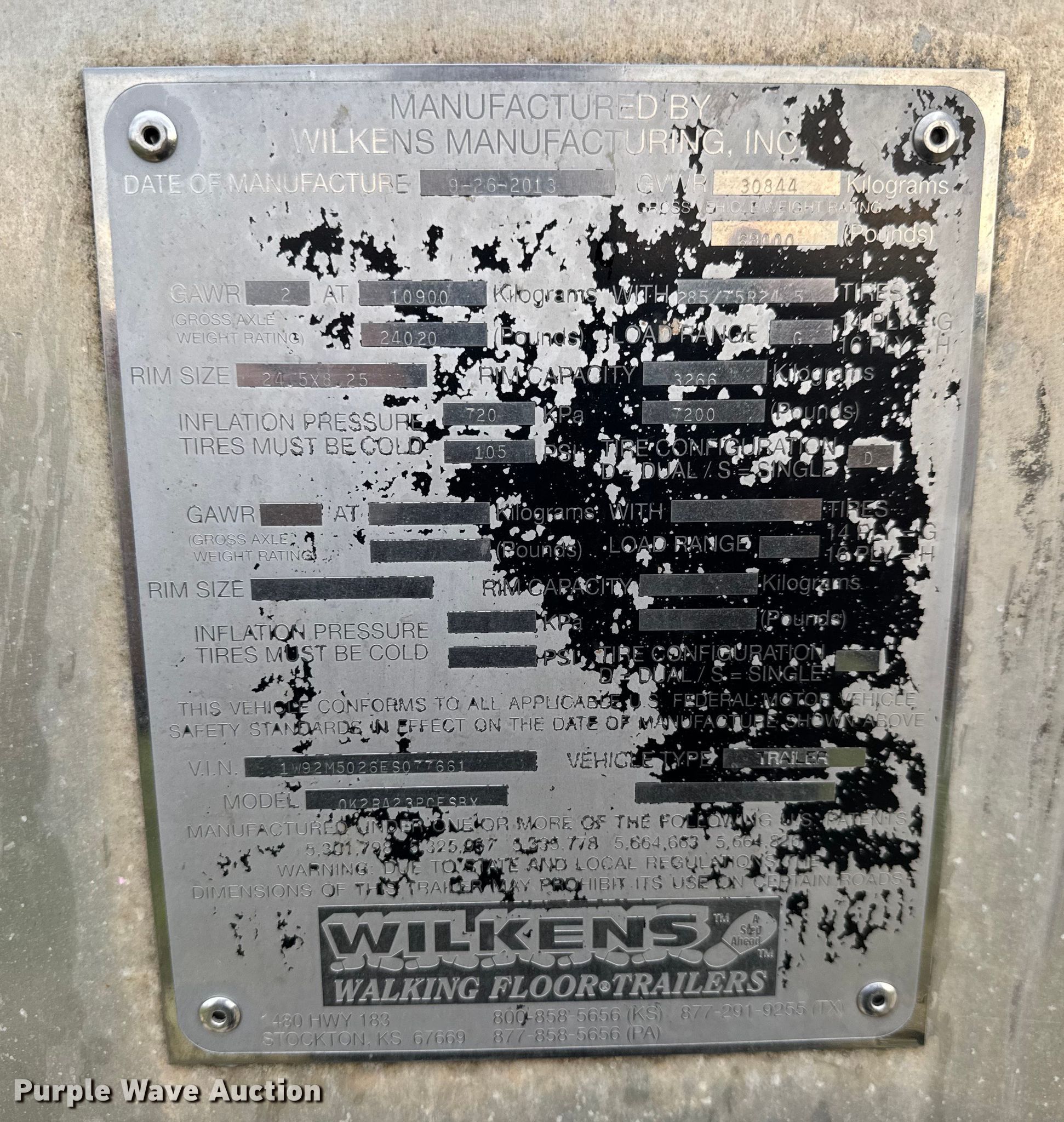 2014 Wilkens 0K2RA23PCESBX walking floor trailer. VIN: 1W92M5026ES077661. Dimensions Overall Length: 50', Width: 102", Side height: 9' 5". Features Body type: Aluminum, Floor: Walking floor. Chassis Landing gear: Dual, Suspension: Spring, Brakes: Air, Axles: Tandem, GVWR: 68,000 lbs, GAWR: 24,020 lbs. Tires Steel wheels, Size: 11R24.5. Kansas title. Title distribution may be delayed up to 14 days from verification of funds. Harvey County Solid Waste. Newton, KS 67114