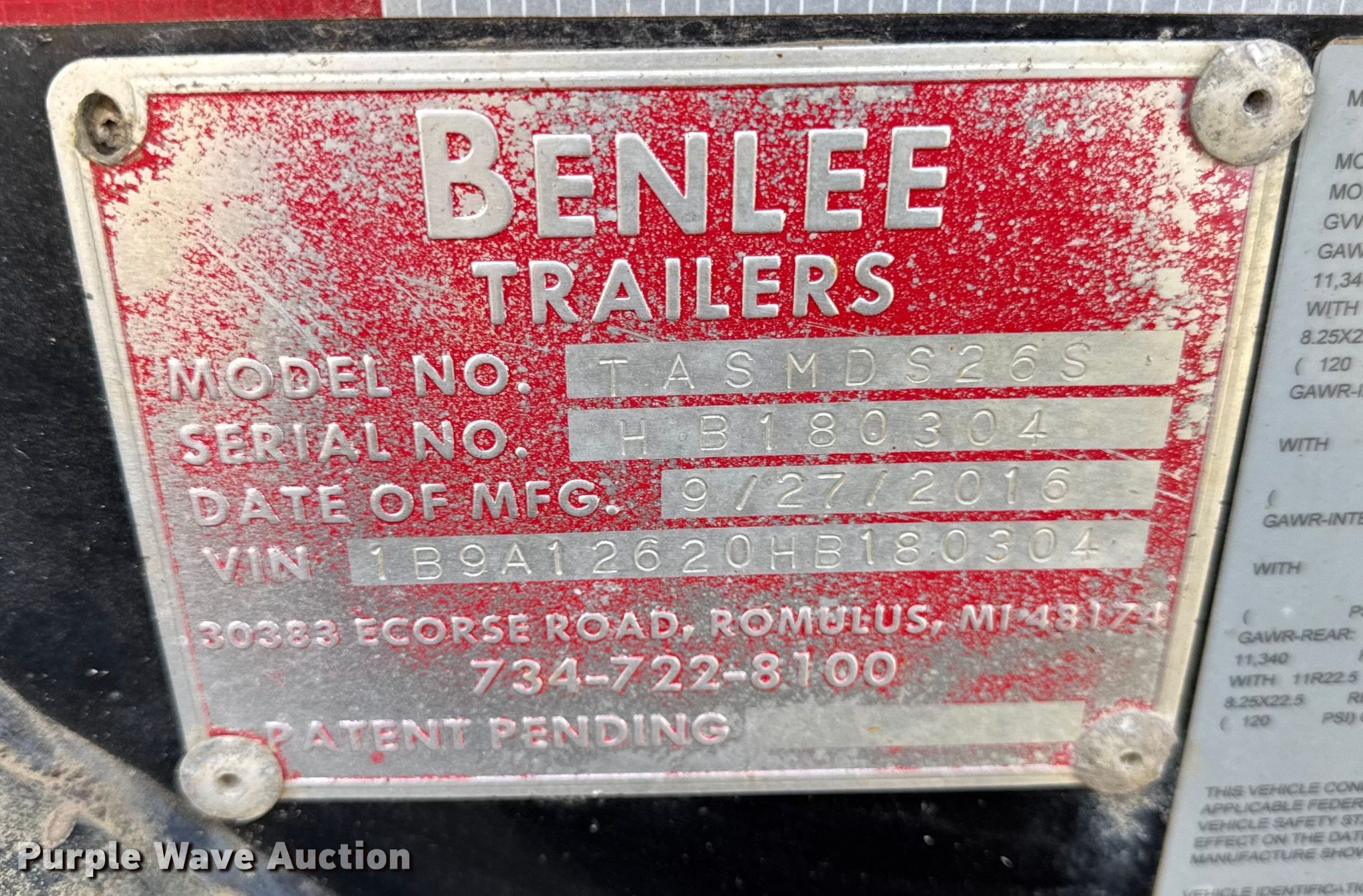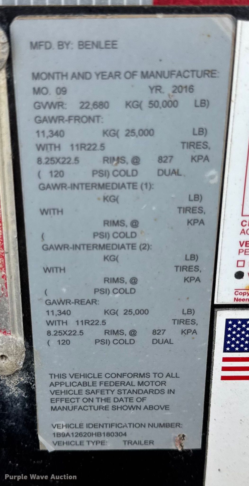 2017 Benlee TASMDS26S roll-off container trailer. VIN: 1B9A12620HB180304. Dimensions Overall Length: 26', Width: 102", Deck Length: 24'. Features Deck type: Steel. Chassis Landing gear: Dual, Suspension: Spring, Brakes: Air, Axles: Tandem, GVWR: 50,000 lbs, GAWR: 25,000 lbs. Tires Steel wheels, Size: 11R22.5. Notes Rear drivers side interior tire flat. Illinois title. Title distribution may be delayed up to 14 days from verification of funds. Knox County Landfill. Oneida, IL 61467