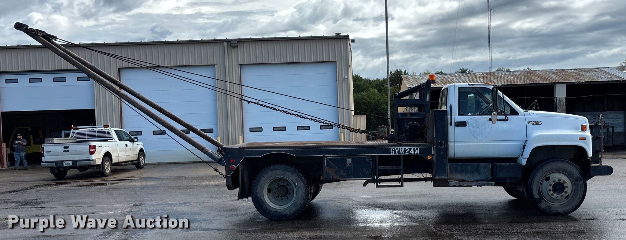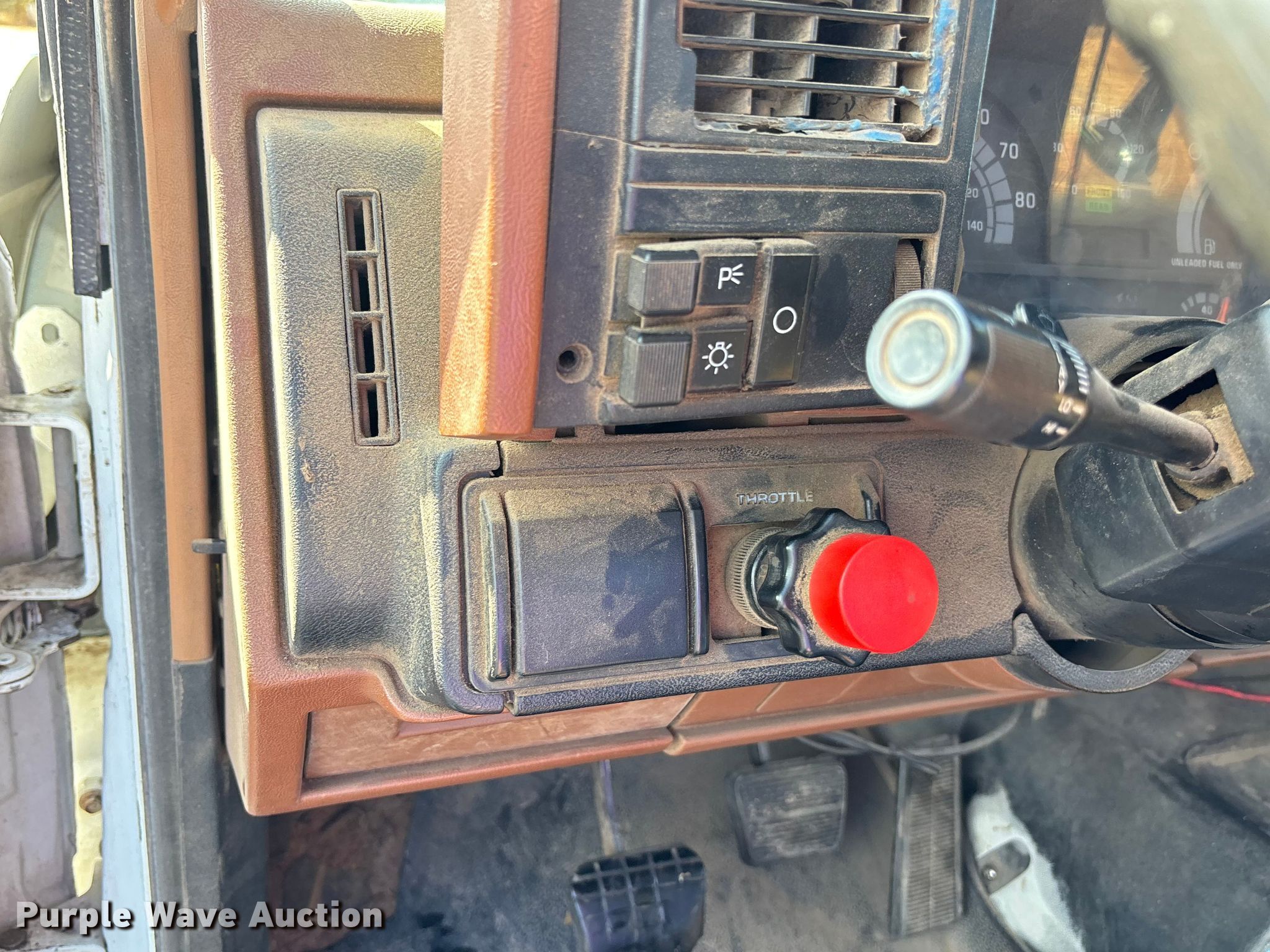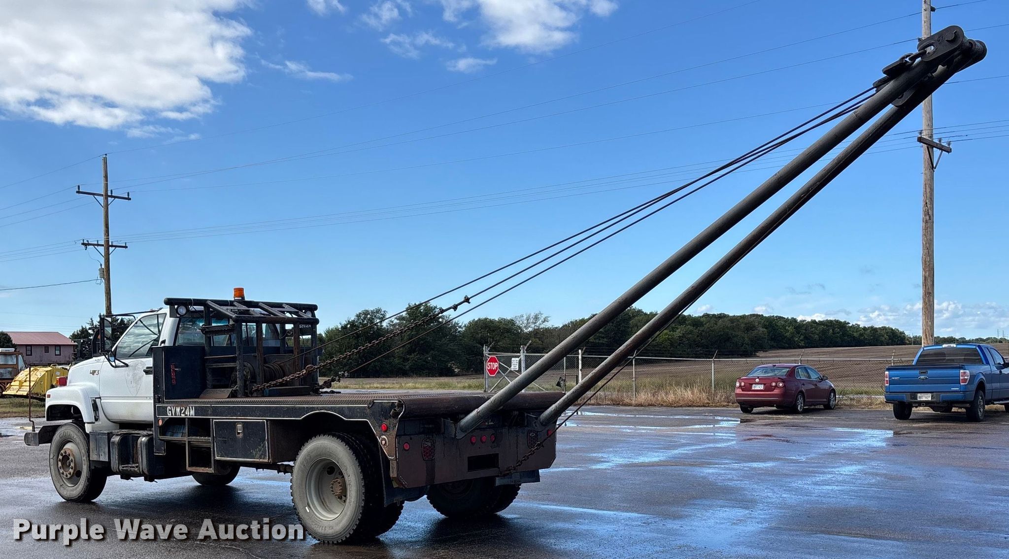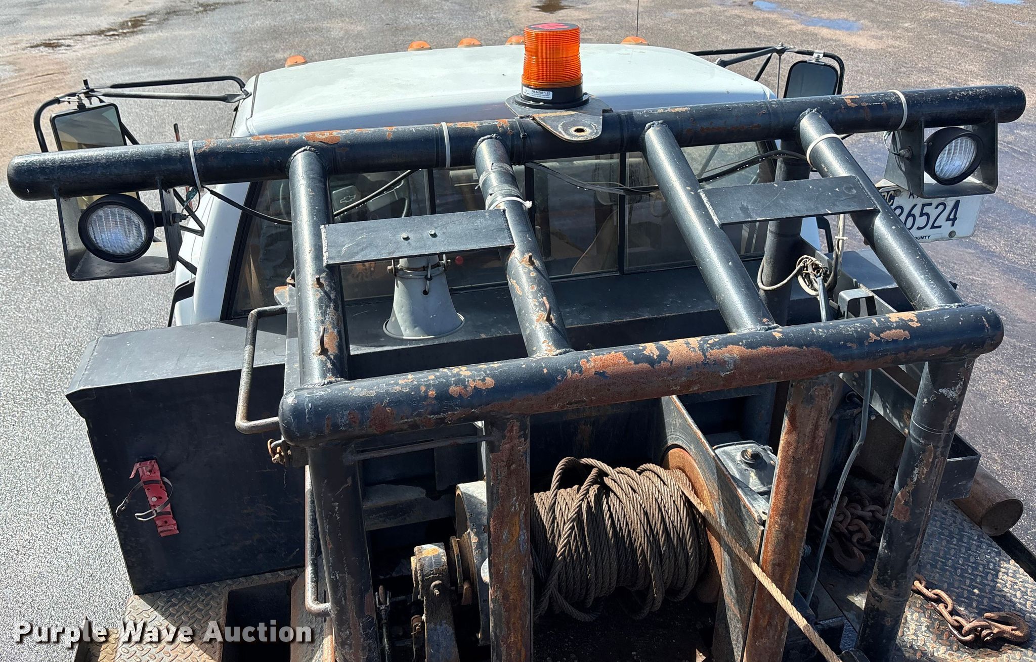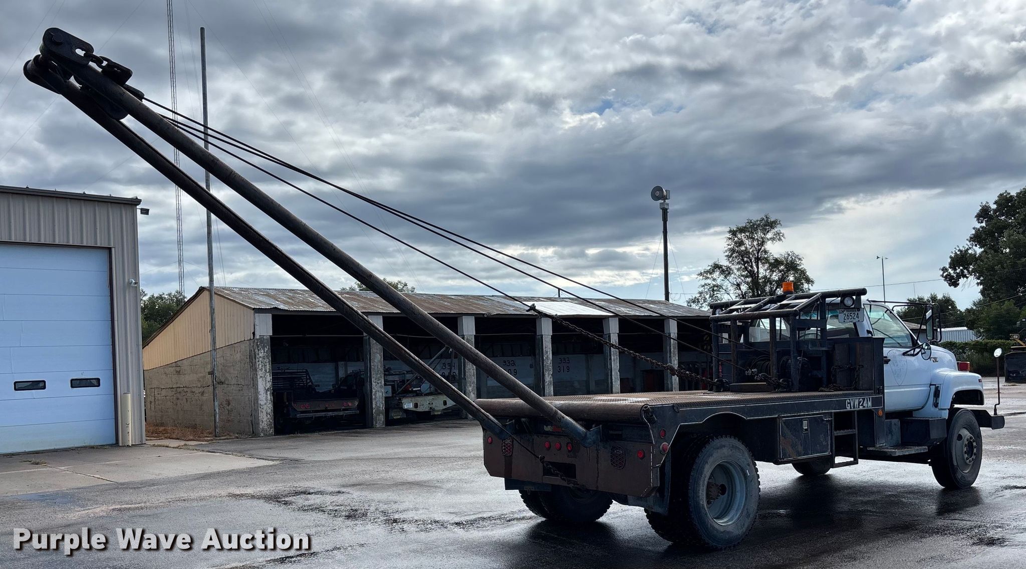 1992 CHEV Flatbed Winch Truck winch truck. Miles: 176,841 on odometer, VIN: 1GBM7H1P1NJ101027. Engine Displacement: 6.0L, Cylinders: 8, Fuel type: Gas. Transmission Manual, Speed: 10. Chassis Axles: Single, Suspension: Spring, Brakes: Air, PTO, Wheelbase: 192". Interior AC, Heat, Cruise control. Features Bed Flatbed, Length: 12' 6", Width: 8', Winch Capacity: 15,000 lbs, Rolling tailboard, Gin poles. Tires Size: 11R22.5. Kansas title. Title distribution may be delayed up to 14 days from verification of funds. Rice County Highway Department. Lyons, KS 67554